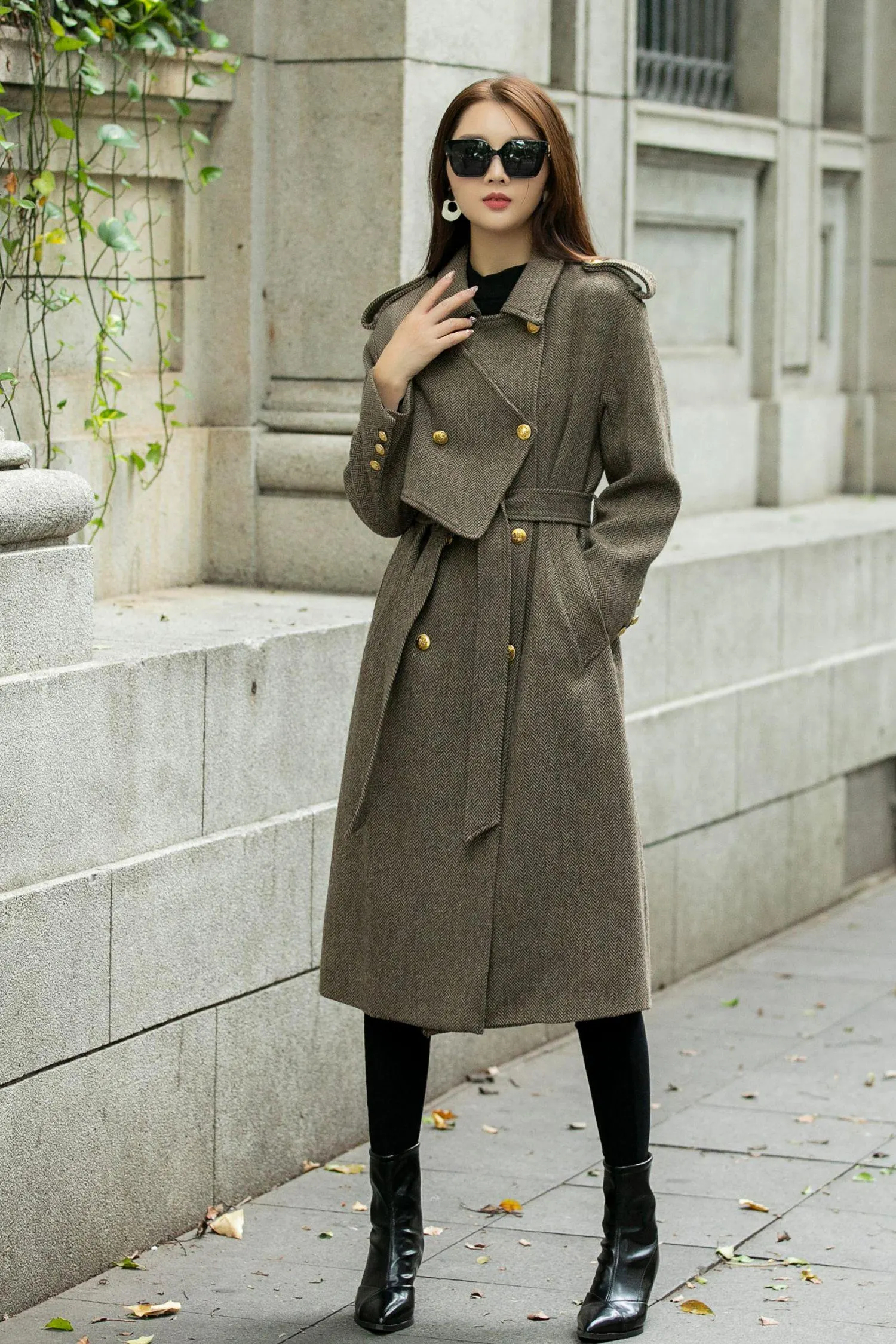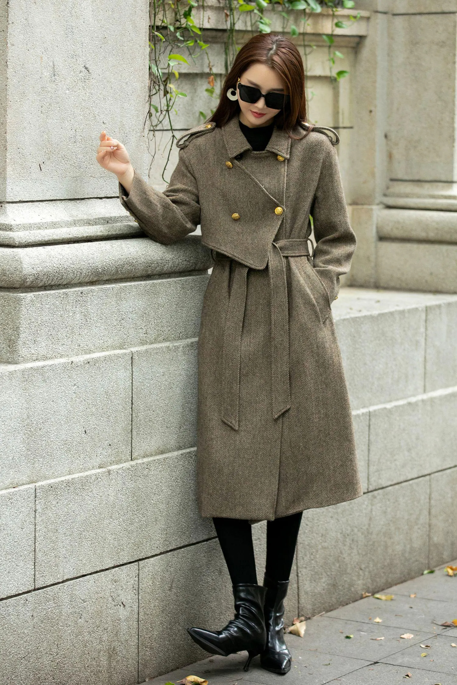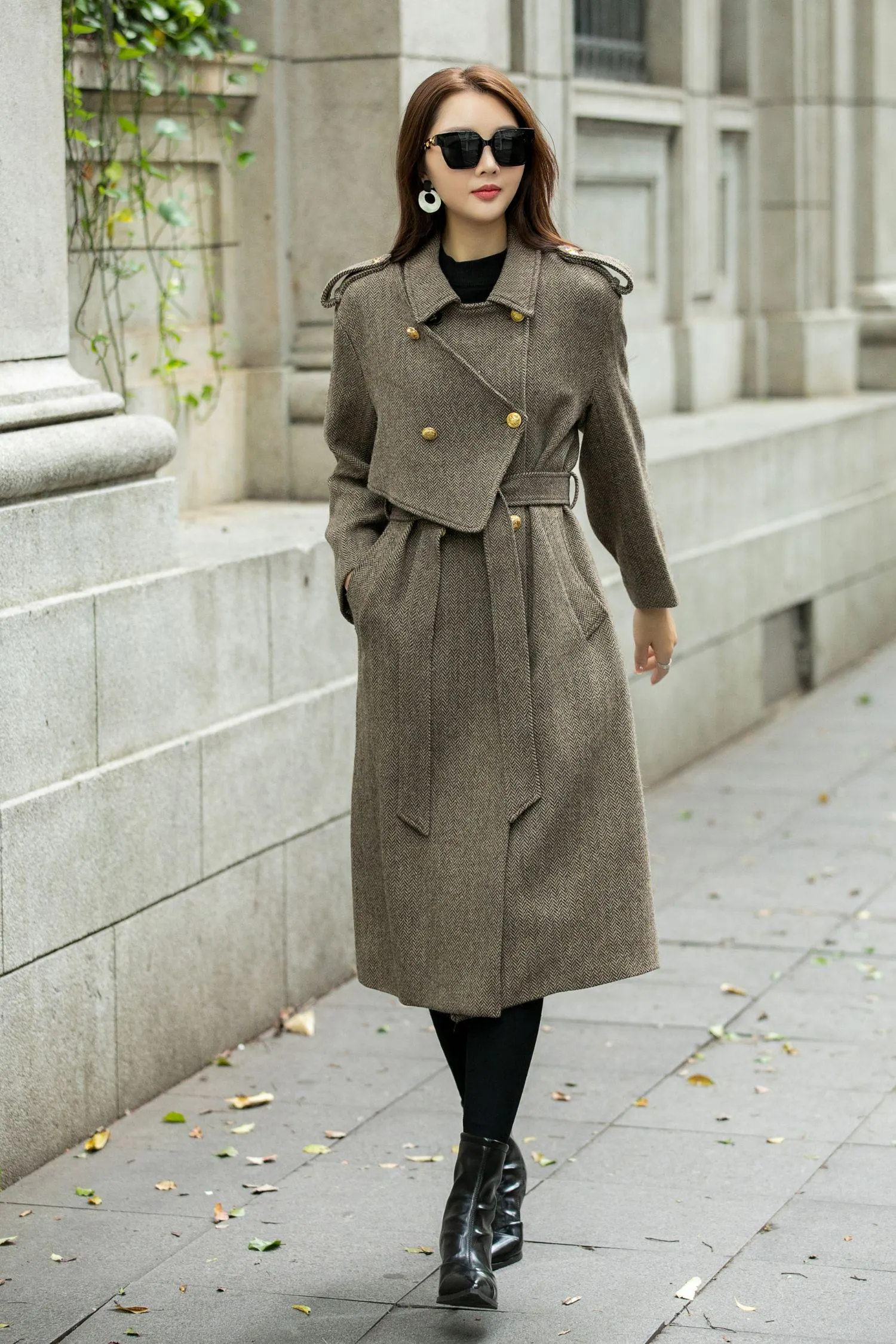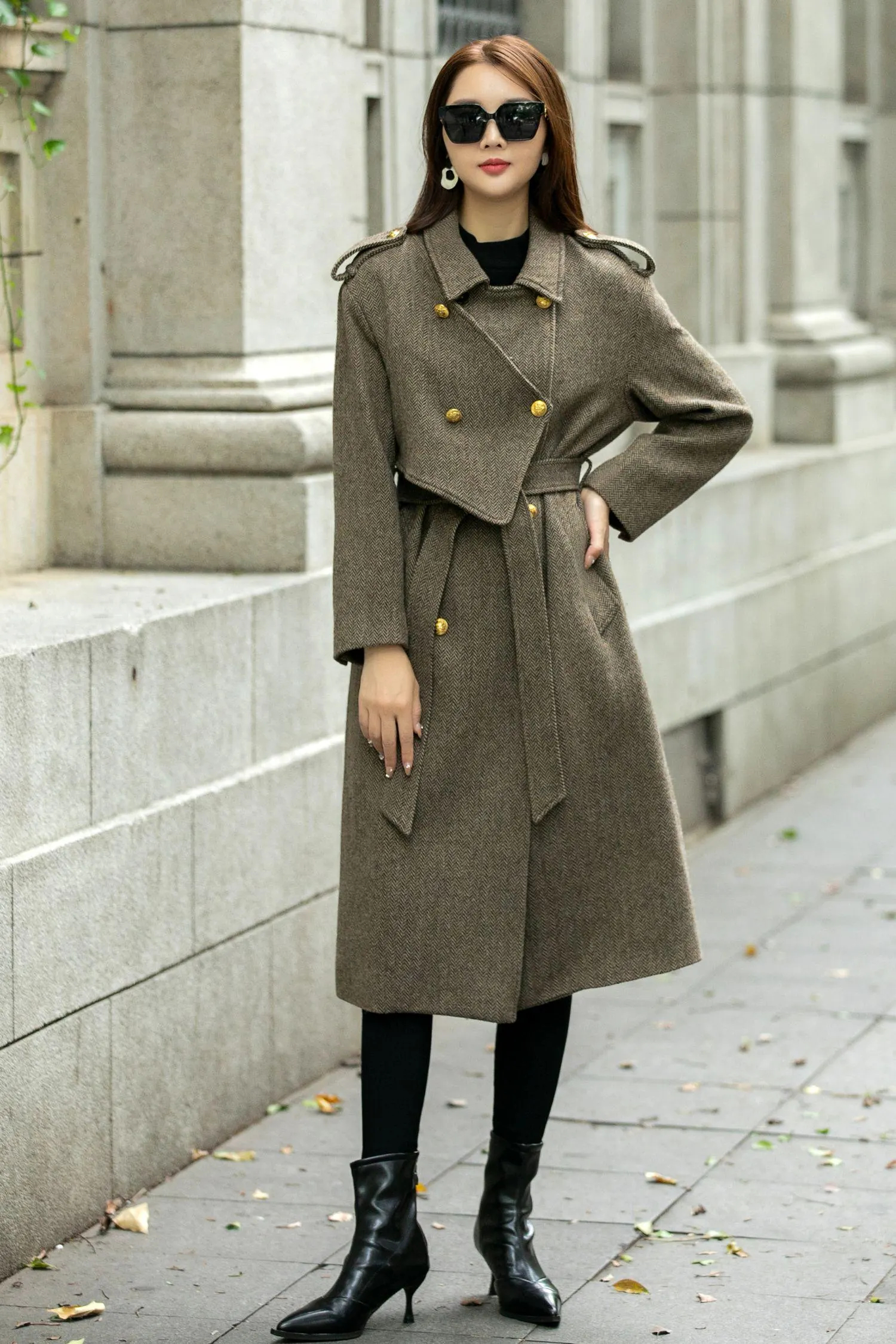 This classic trench coat is reimagined in textured herringbone tweed. Cape/storm flaps accent the shoulders for added structure and movement, while epaulettes and a double-breasted front are accented with gold-tone buttons. Ties define the waist, and straight cuffs are finished with ties for a tailored fit. Side pockets are strategically integrated, and the hem drops below the knee for a sleek, streamlined silhouette.
