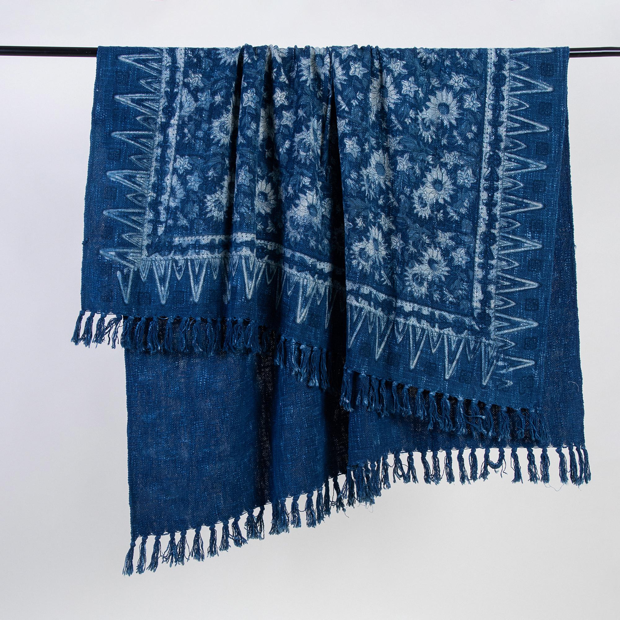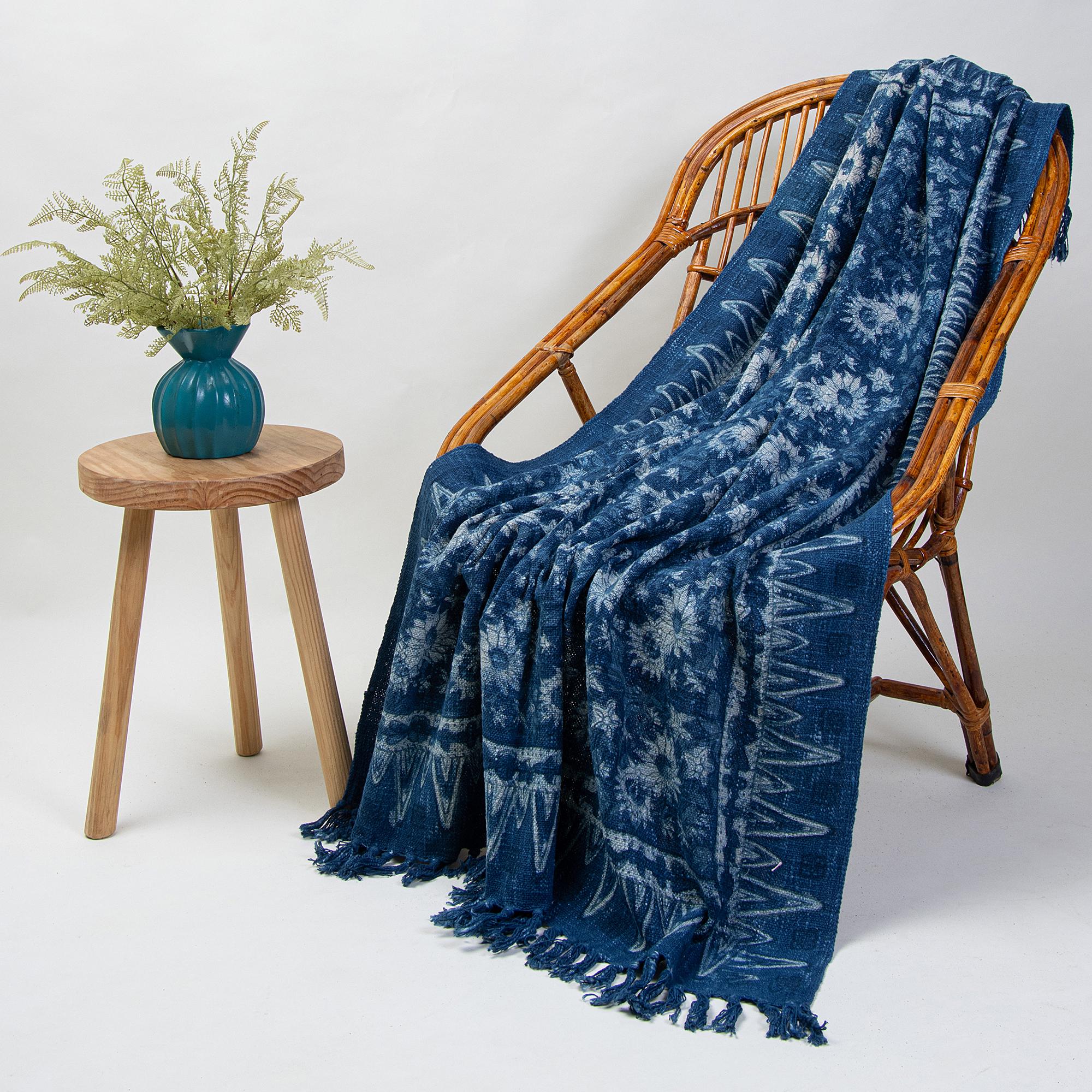 The indigo blue and washed light pattern creates a rustic, handmade feel—evoking coastal, vintage, or bohemian interiors. Drape it over a chair or ladder to showcase color, print, and texture in one go.