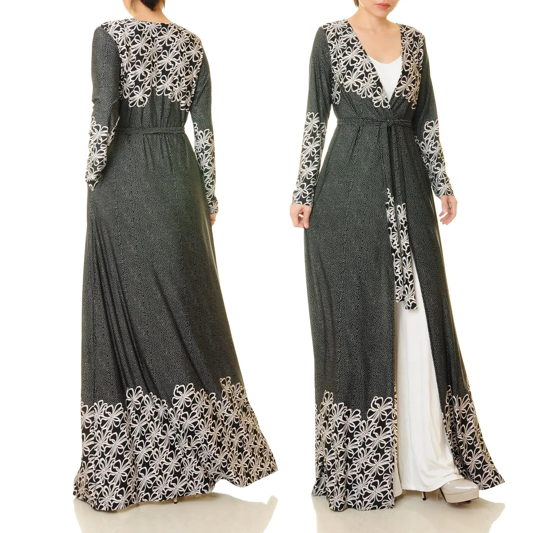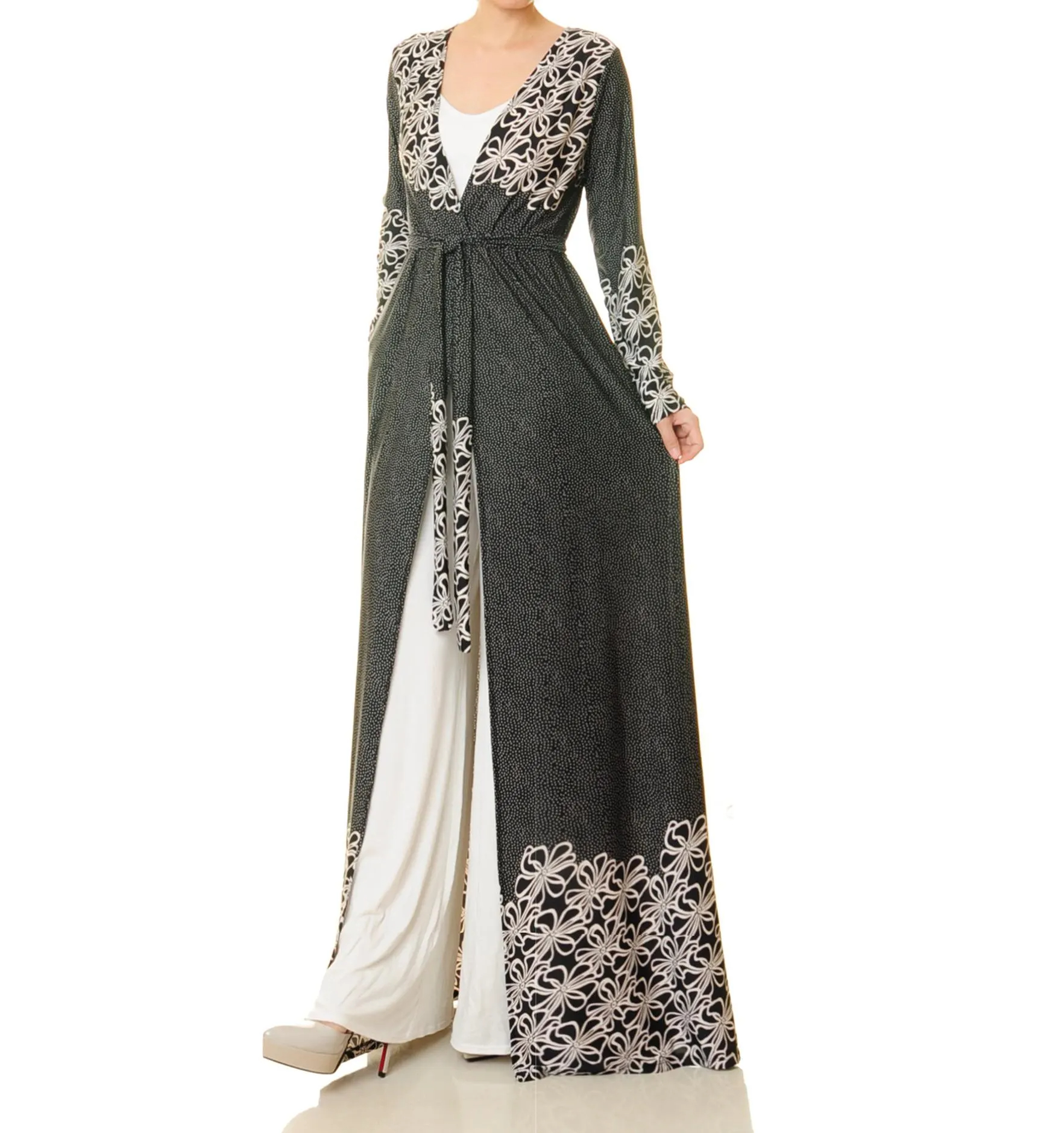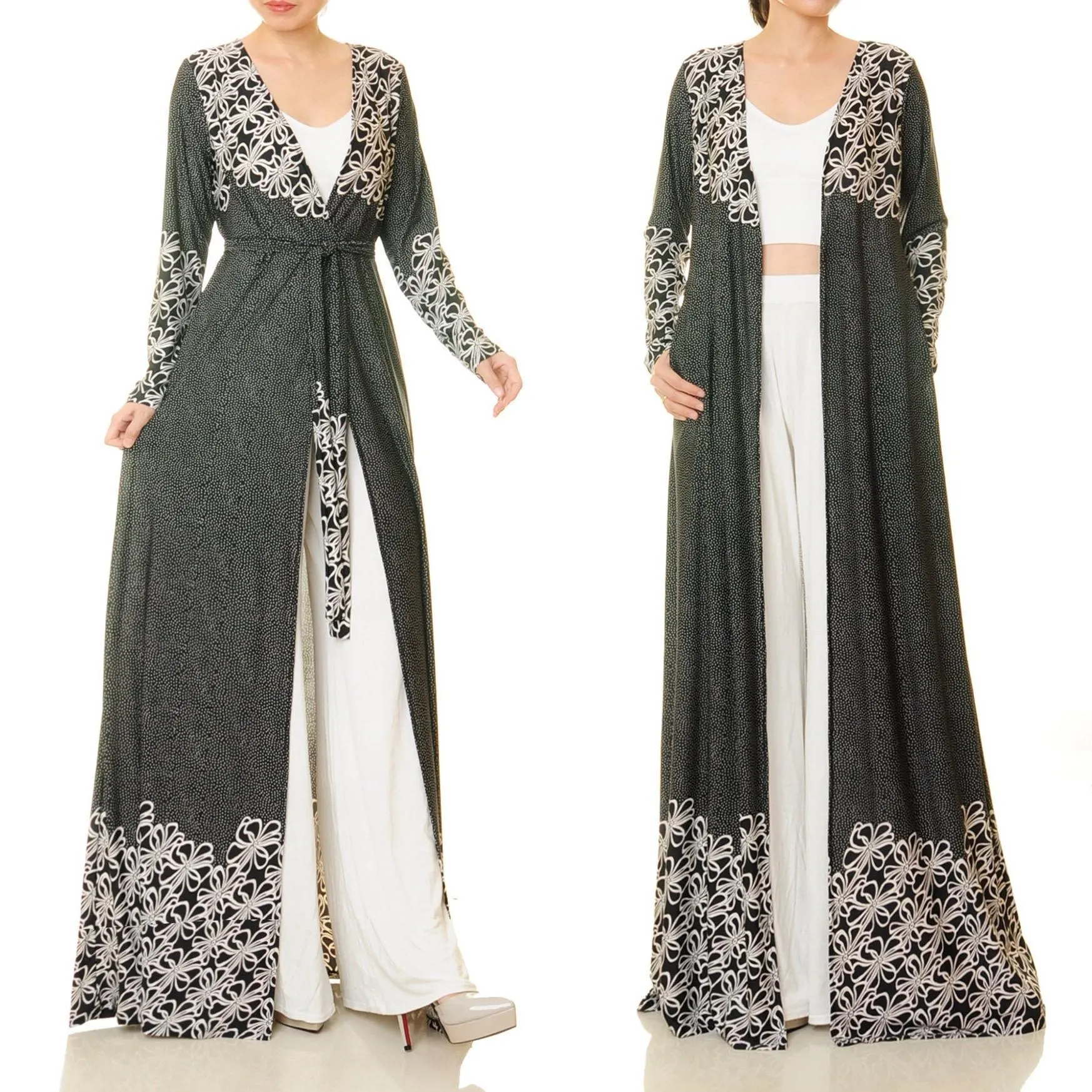 This robe features a minimalist, double-breasted design, creating a clean V-line. The waist tie in the same fabric allows for an adjustable fit. A dark base fabric accented with ivory floral borders at the cuffs and hem creates a clean focal point. The flowing long skirt and center front slit create a flowing curve with every step, adding both elegance and mobility. Throw it casually for a relaxed vibe, and cinch it at the waist for a refined look, perfect for daytime outings or evening getaways.