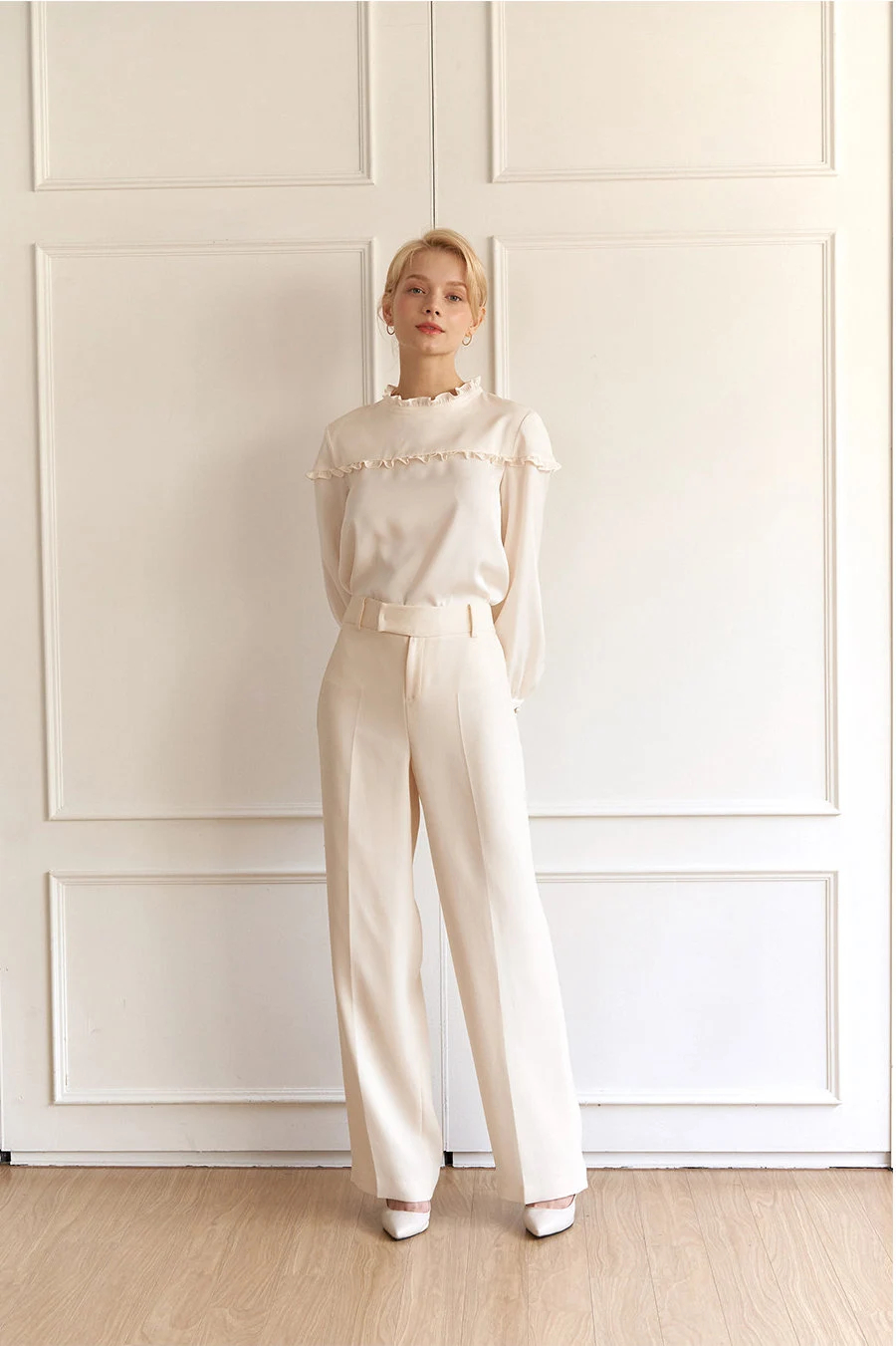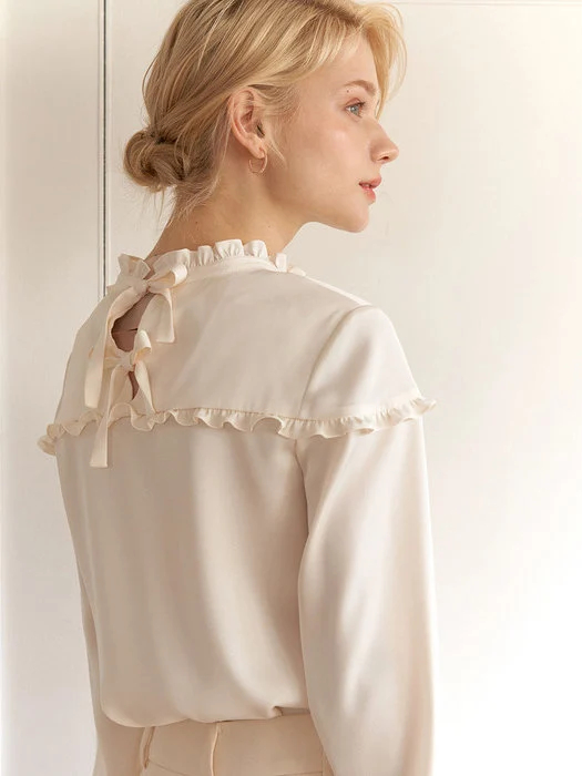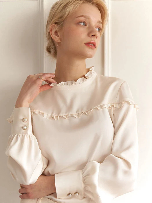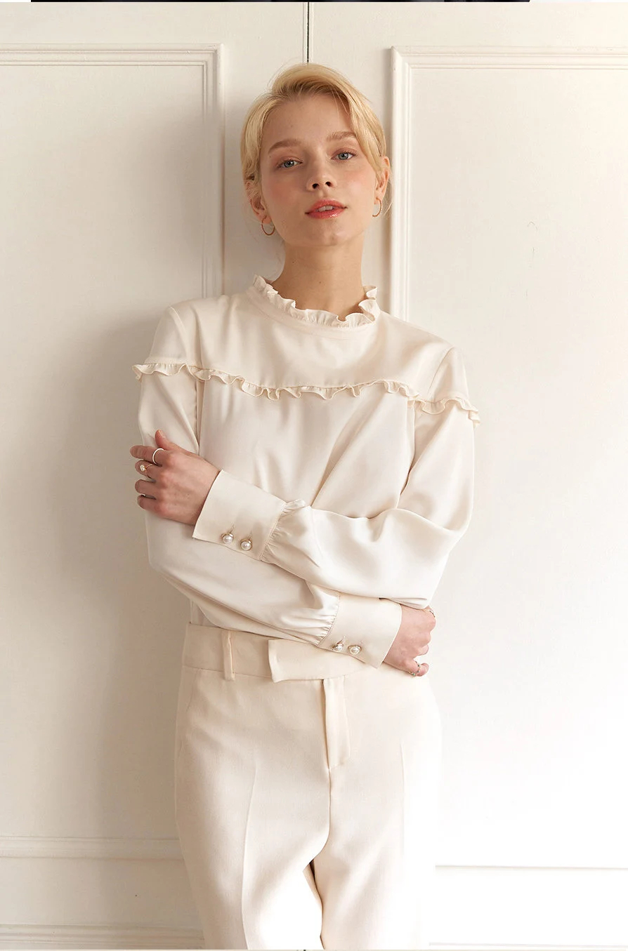 This ivory satin blouse is exquisitely elegant, adding a touch of romance to everyday wear. The smooth, supple satin fabric is soft and gentle against the skin, while delicate ruffles add a touch of femininity. The mini stand-up collar and graceful ruffles at the chest accentuate the figure, while long sleeves with buttoned cuffs exude elegance. Whether for work, a date, or any occasion requiring a gentle, ladylike style, it’s the perfect choice.