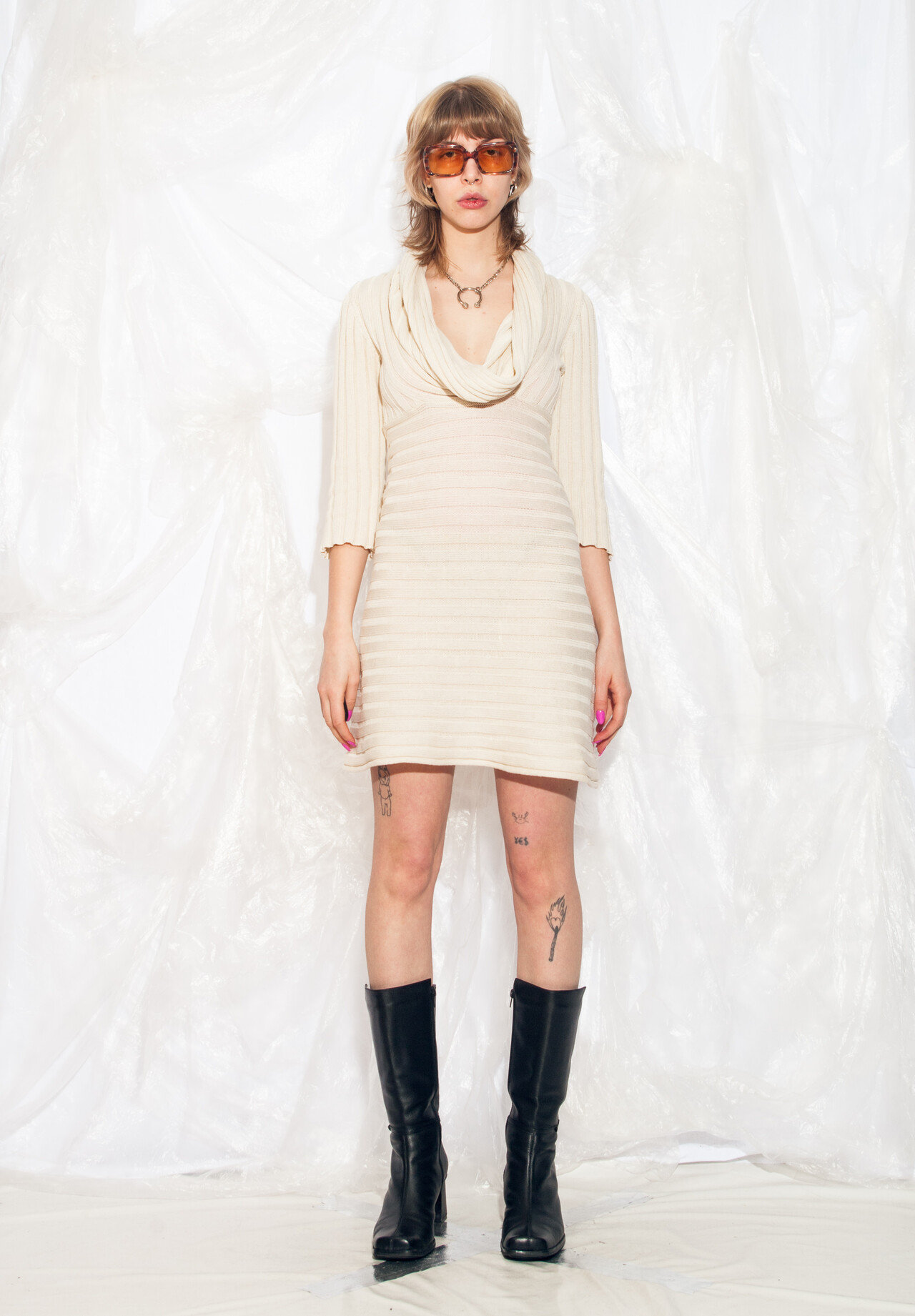 This ivory sweater dress exudes effortless elegance, featuring a fluid, draped neckline and a gently flared mini skirt. This mid-weight knit features delicate horizontal ribbing for a sleek, comfortable fit. Perfect for brunch, the office, or a date—the minimalist design creates a clean, yet chic look.
