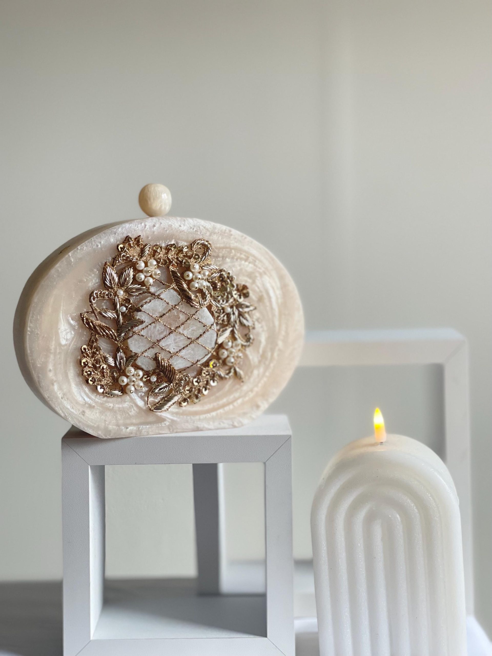 This elegant and chic ivory marble clutch adds a touch of serene luxury to any special occasion.