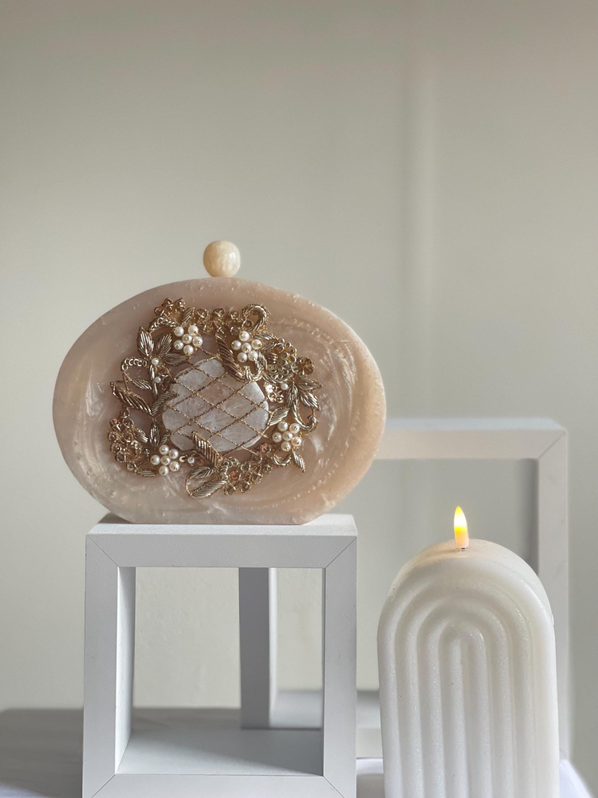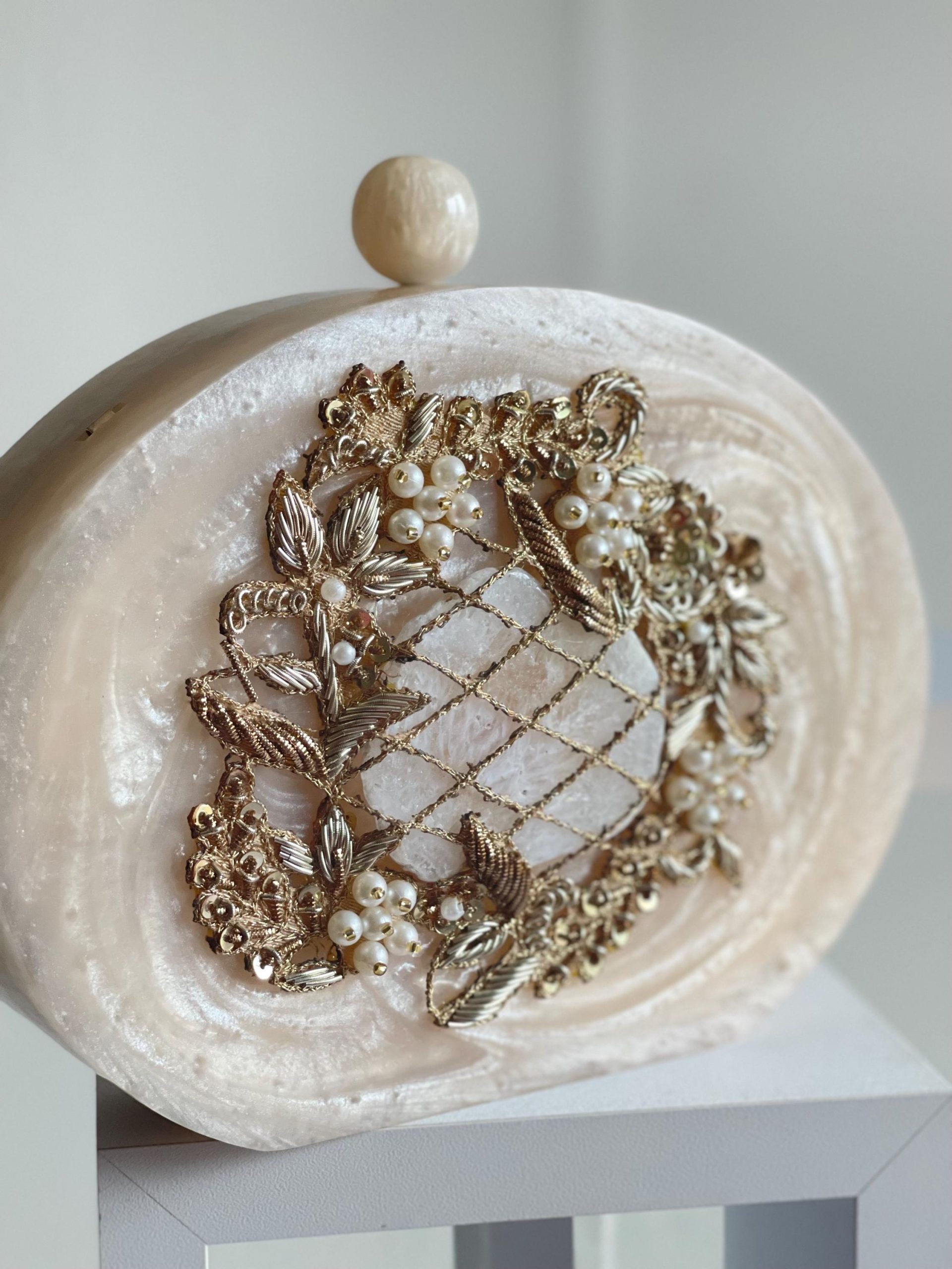 This exquisite clutch features a soft ivory marble finish, its smooth, stone-like surface exuding elegance and subtle natural texture. At the center of the bag, a magnificent embroidered circular patchwork becomes the visual focal point—adorned with gold thread, tiny pearls, beaded flowers, and sequins, forming a delicate wreath-like pattern. Diamond-quilted details add texture and balance to the overall design. The oval hard-shell shape boasts sleek, graceful lines, while the round top clasp further enhances the clutch’s understated sophistication.