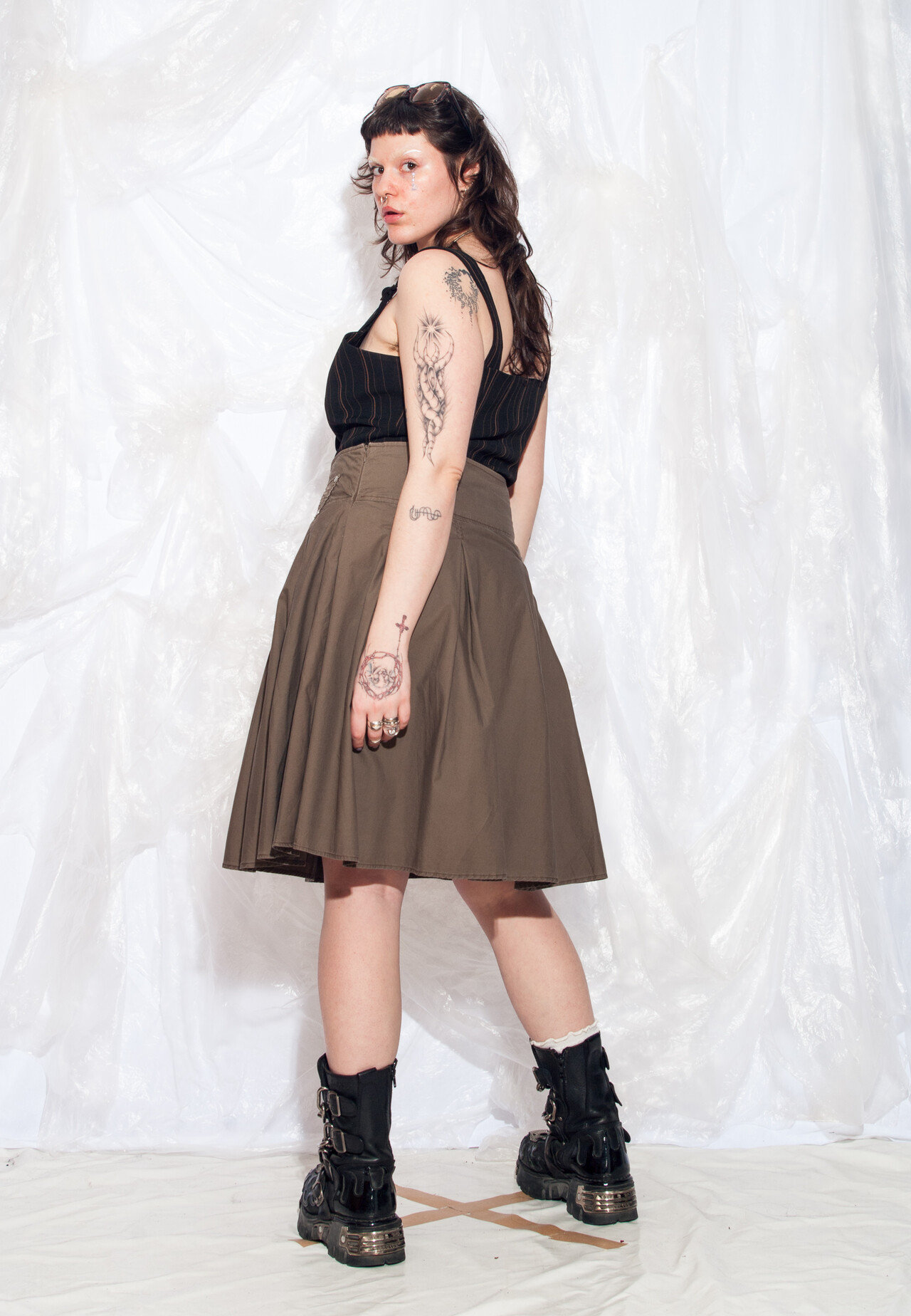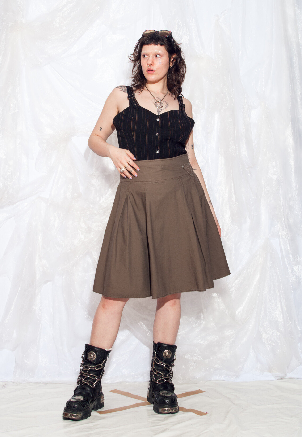 This modern A-line skirt features a simple yoke waist and soft, pleated panels. The structured top maintains a defined hip silhouette, while the hem flares out effortlessly into a relaxed flare – a refined and elegant look perfect for both business and everyday wear.