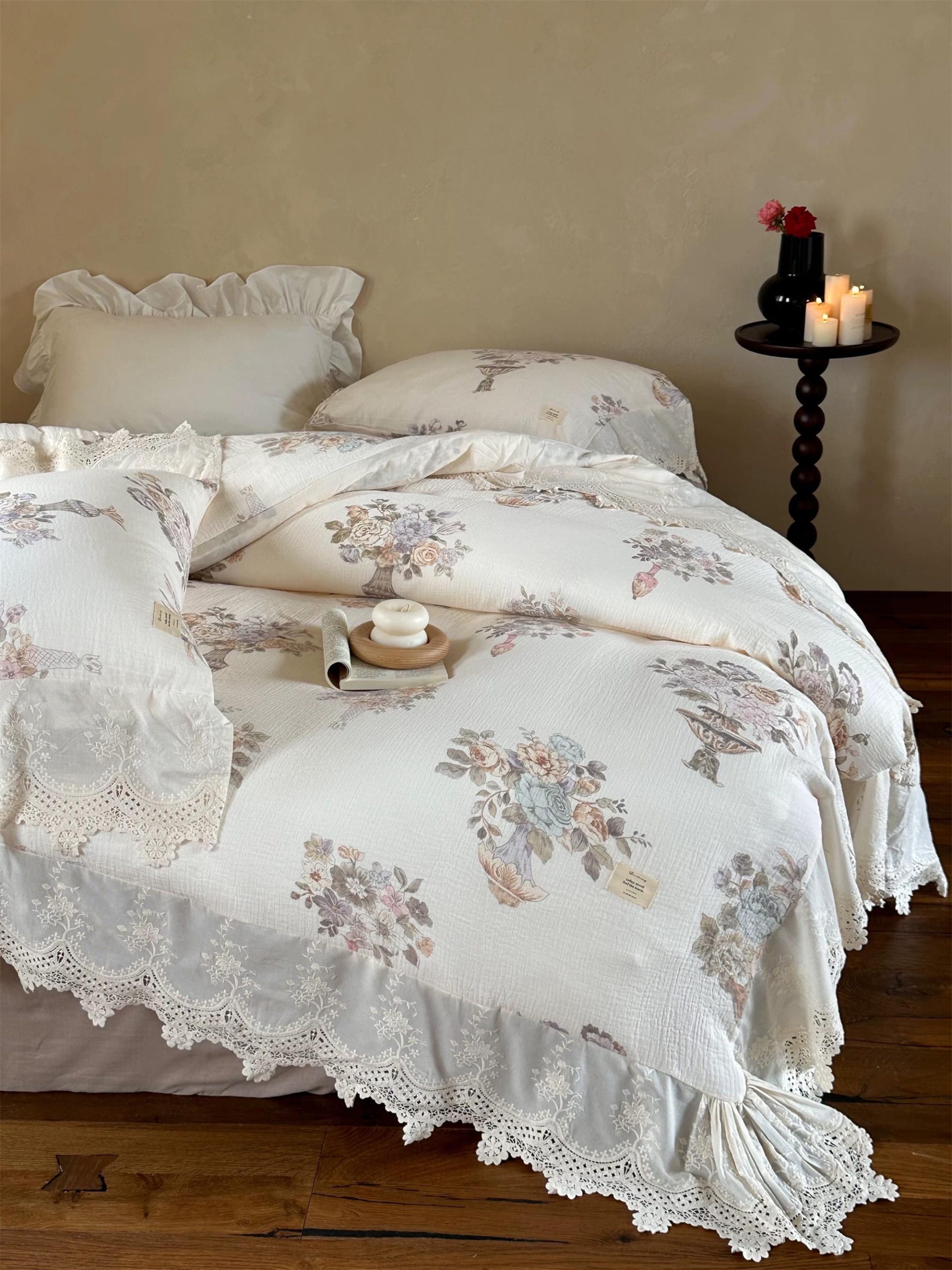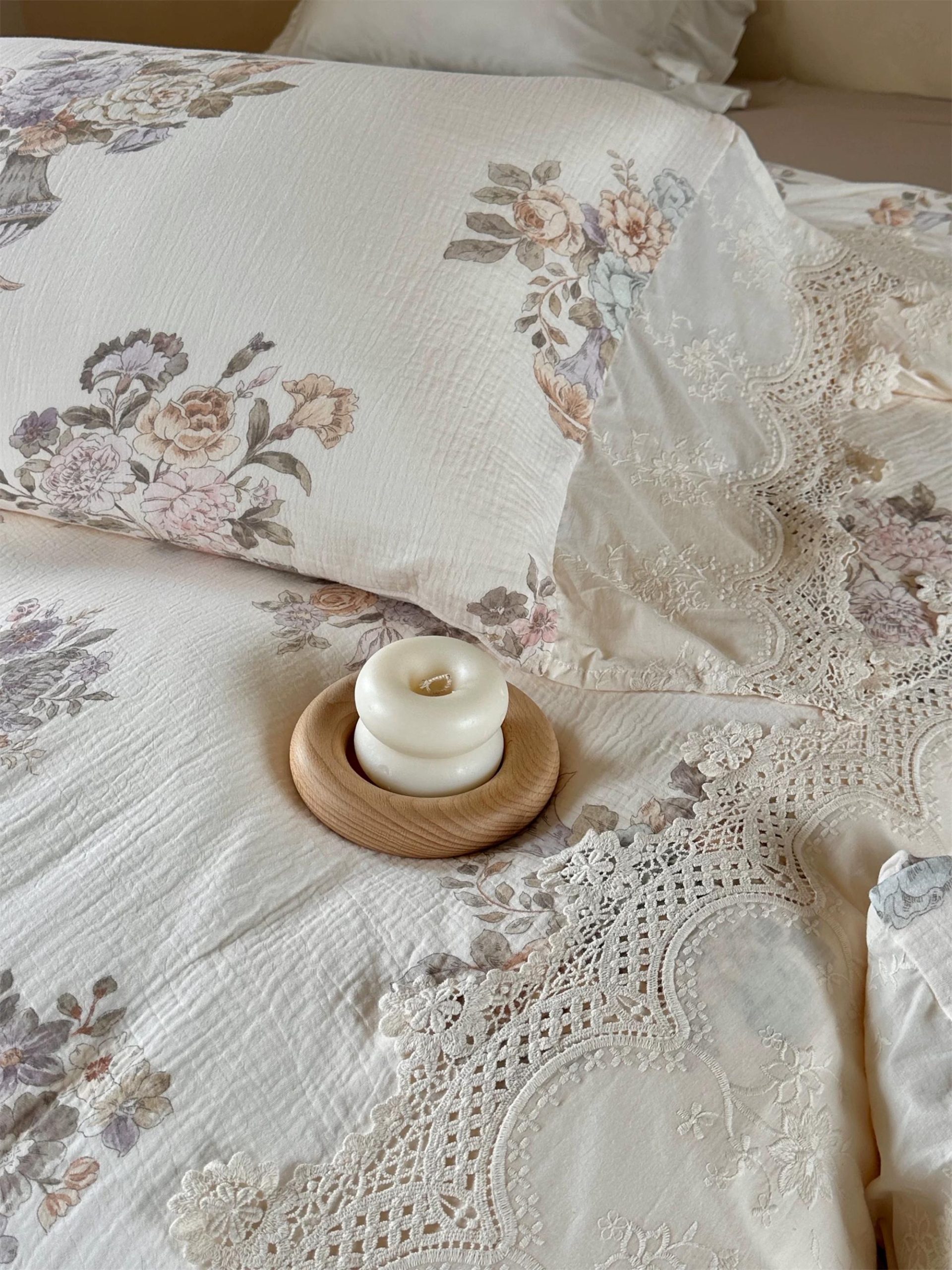This ensemble blends the rustic, relaxed feel of French vintage country style with the exquisite sophistication of lace. A vintage floral print forms the core, accented by layers of lace trim, creating a cozy space reminiscent of a vintage cabin in the countryside. Every floral stroke and lace pleat evokes the relaxing ritual of rural life, transforming sleep into an immersive, retro, and restorative experience.