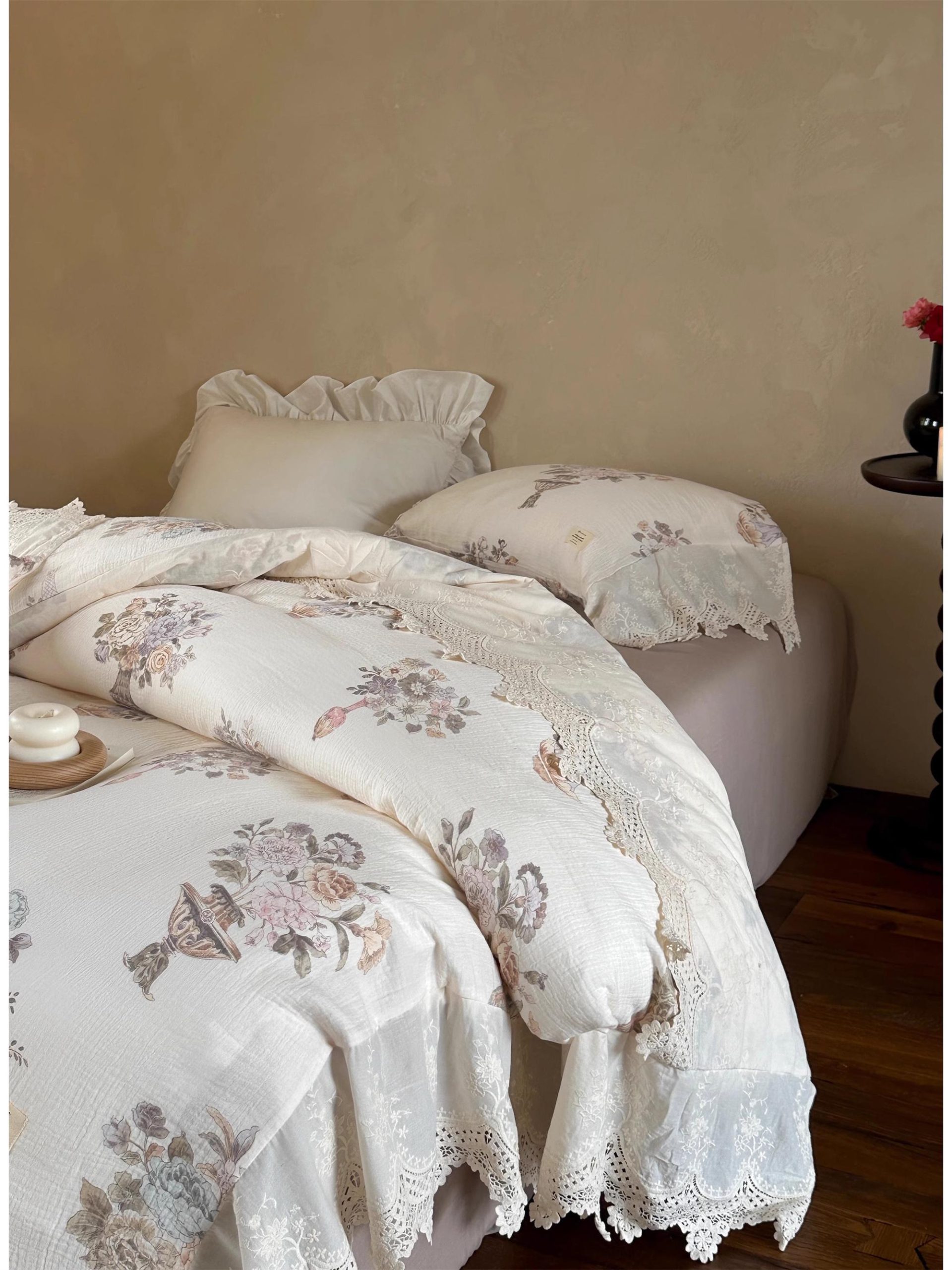 Sleep Scene: Wrap yourself in the soft embrace of cotton and linen blend, surrounded by the gentle touches of vintage florals and lace. Every restful moment is a natural, soothing experience of French vintage country living. Waking up in the morning, the beige bedding intertwined with wooden elements creates a soothing, almost retro log cabin awakened by the morning light.