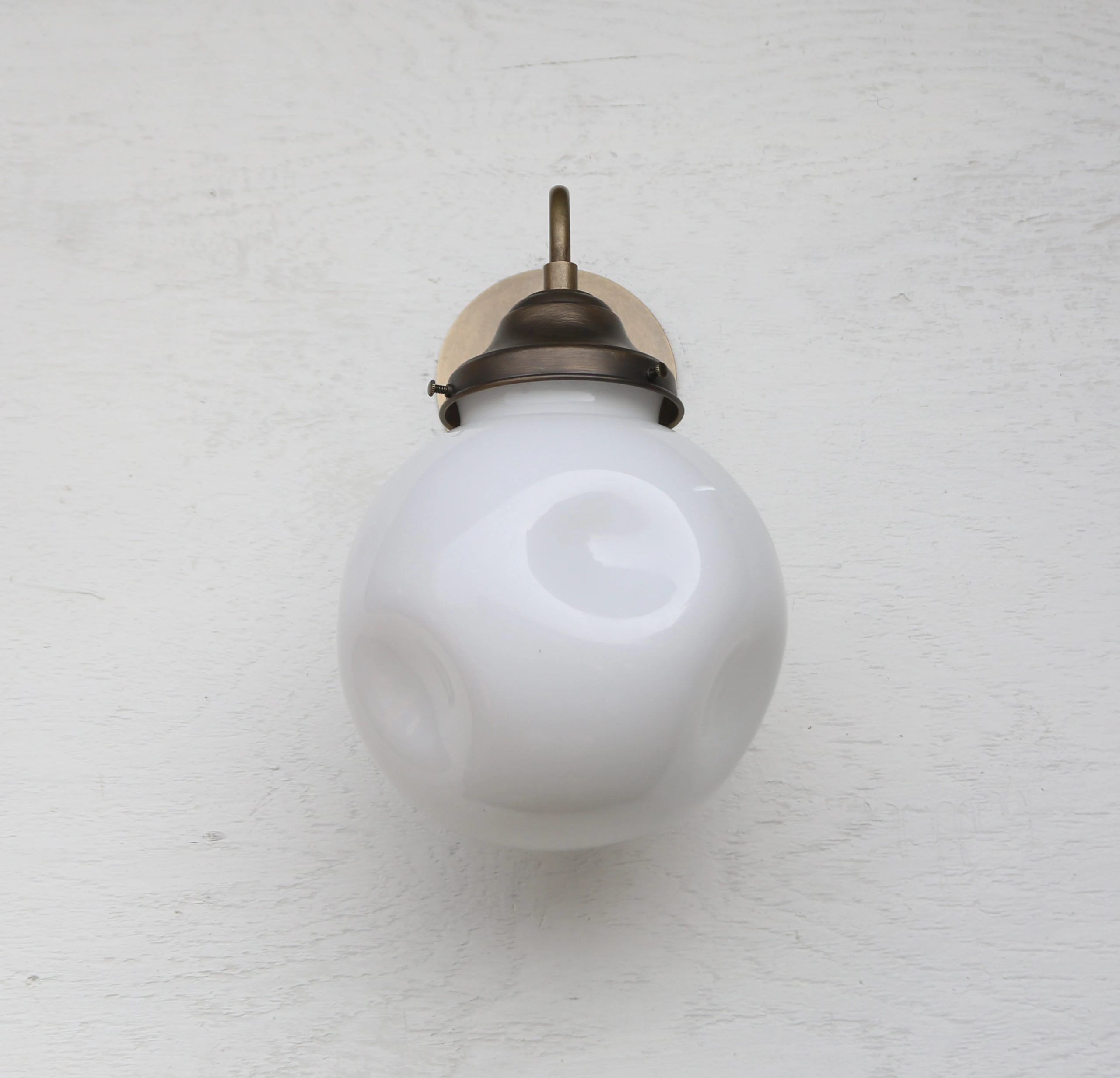 – Large Opal Shade: Thick frosted glass softens the spotlight and distributes the light evenly. — Antique Brass Lamp Base: Vintage-inspired styling, paired with refined hardware, creates a statement.