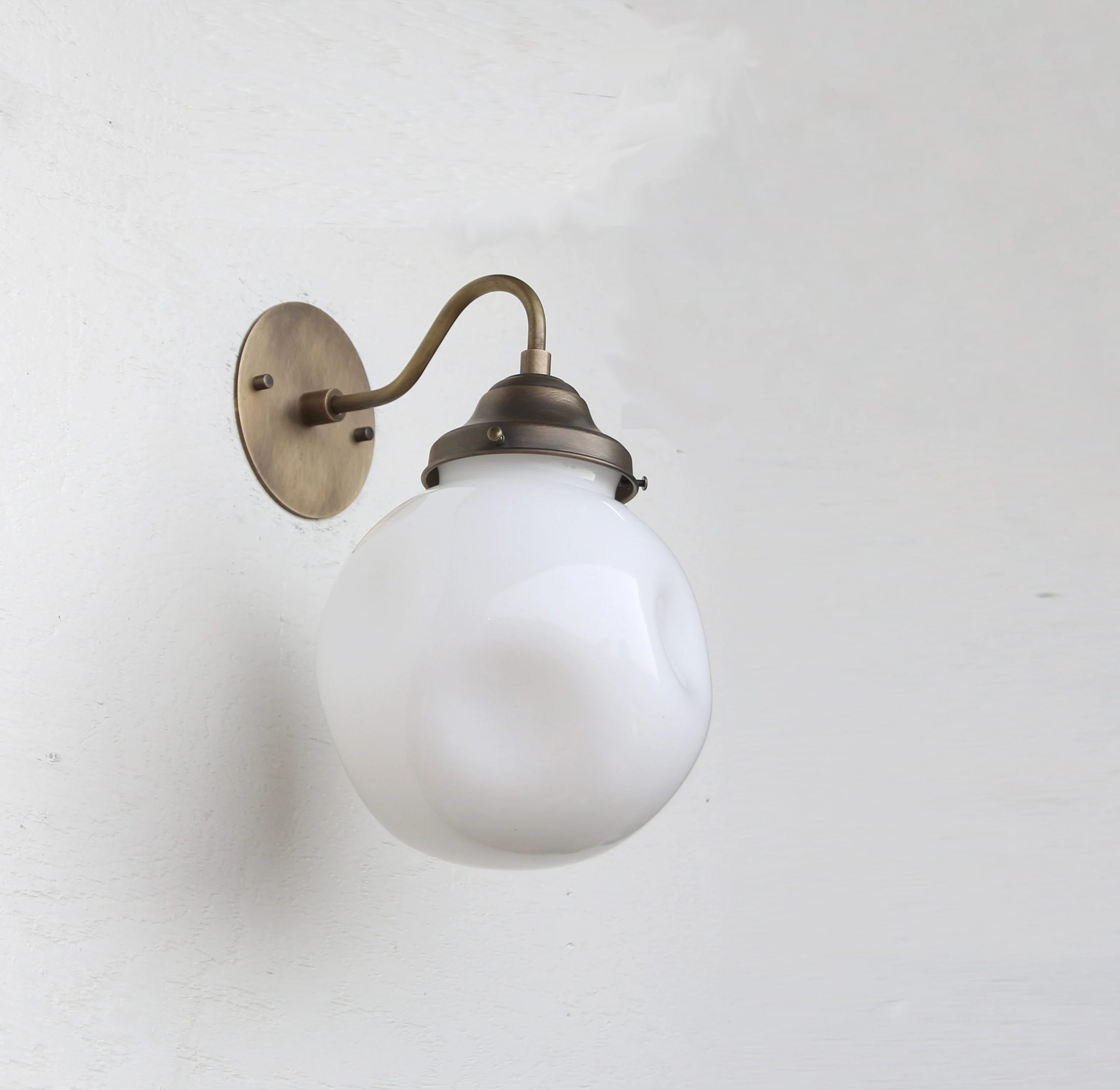 — A round brass back panel with an elegant gooseneck arm supports a vintage-inspired shade and oversized opal globe, creating a soft, glare-free ambient light.