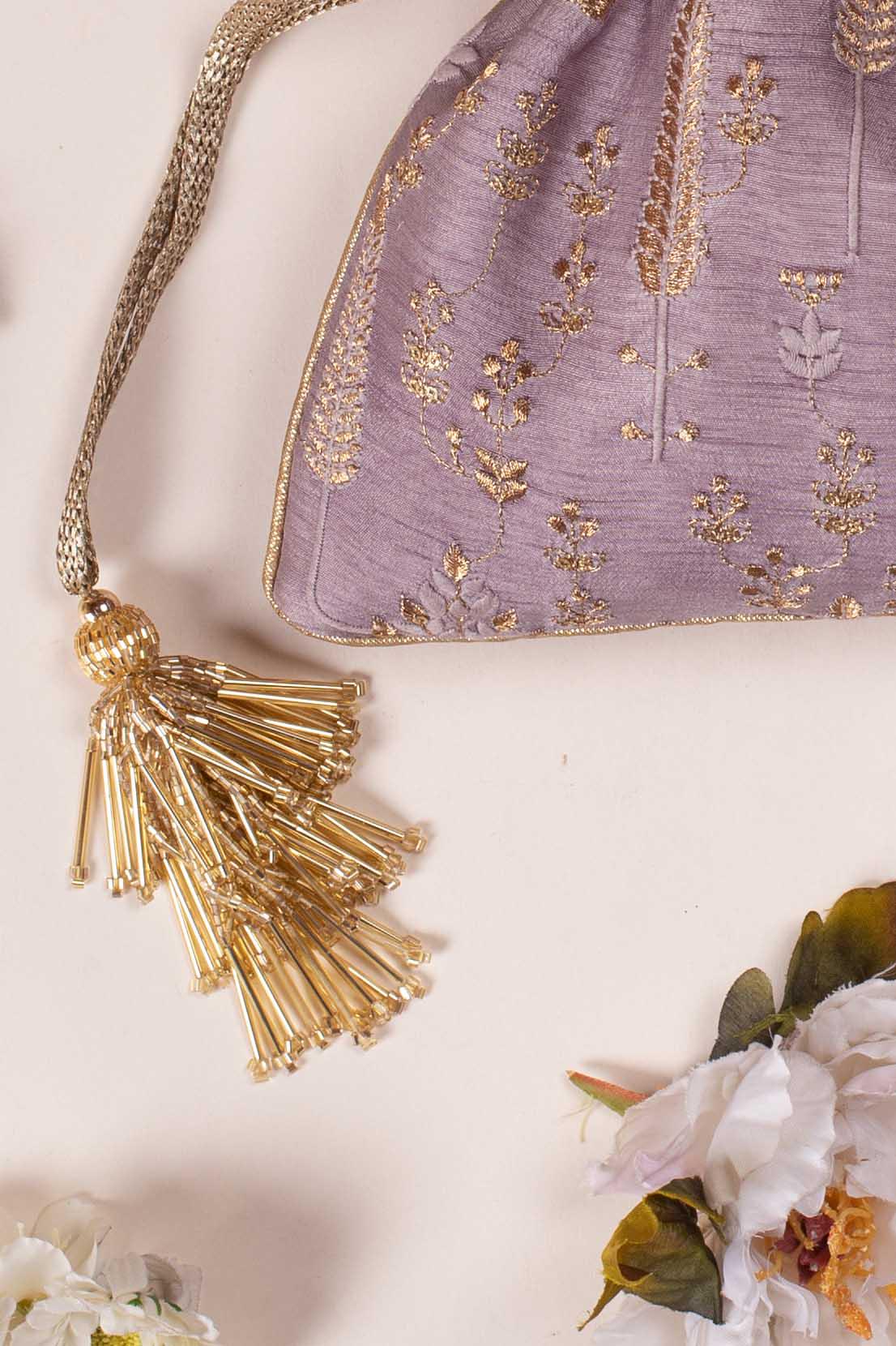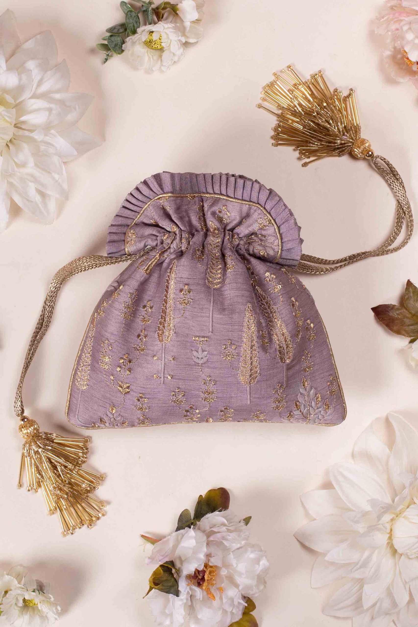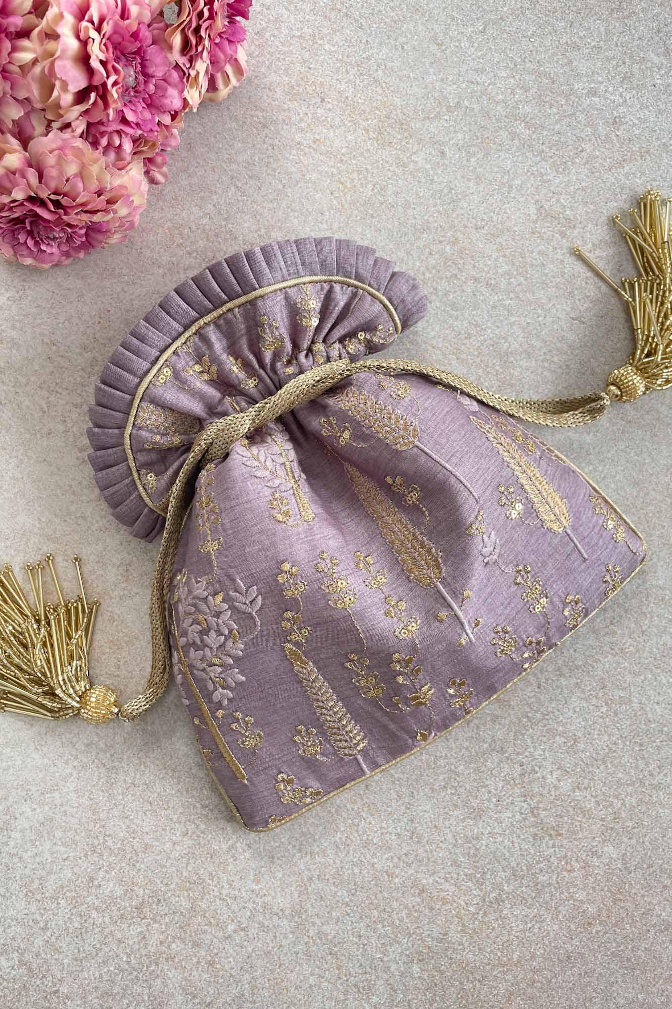 The bag’s base is crafted from lavender satin, evoking a gentle and romantic atmosphere, reminiscent of a purple flower field shrouded in morning mist. Gilded embroidery patterns are scattered throughout, resembling scattered golden stars adorning the soft mist. The delicate lines of the branches, leaves, and flower spikes contrast with the lavender base, creating a light, luxurious, and soothing aesthetic. The pleated neckline, reminiscent of the brim of a vintage hat, and the gold tassel drawstring add a touch of playfulness to the elegant design, seemingly incorporating the romance of a spring garden with the gilded texture of a gilded garden into this small bag.
