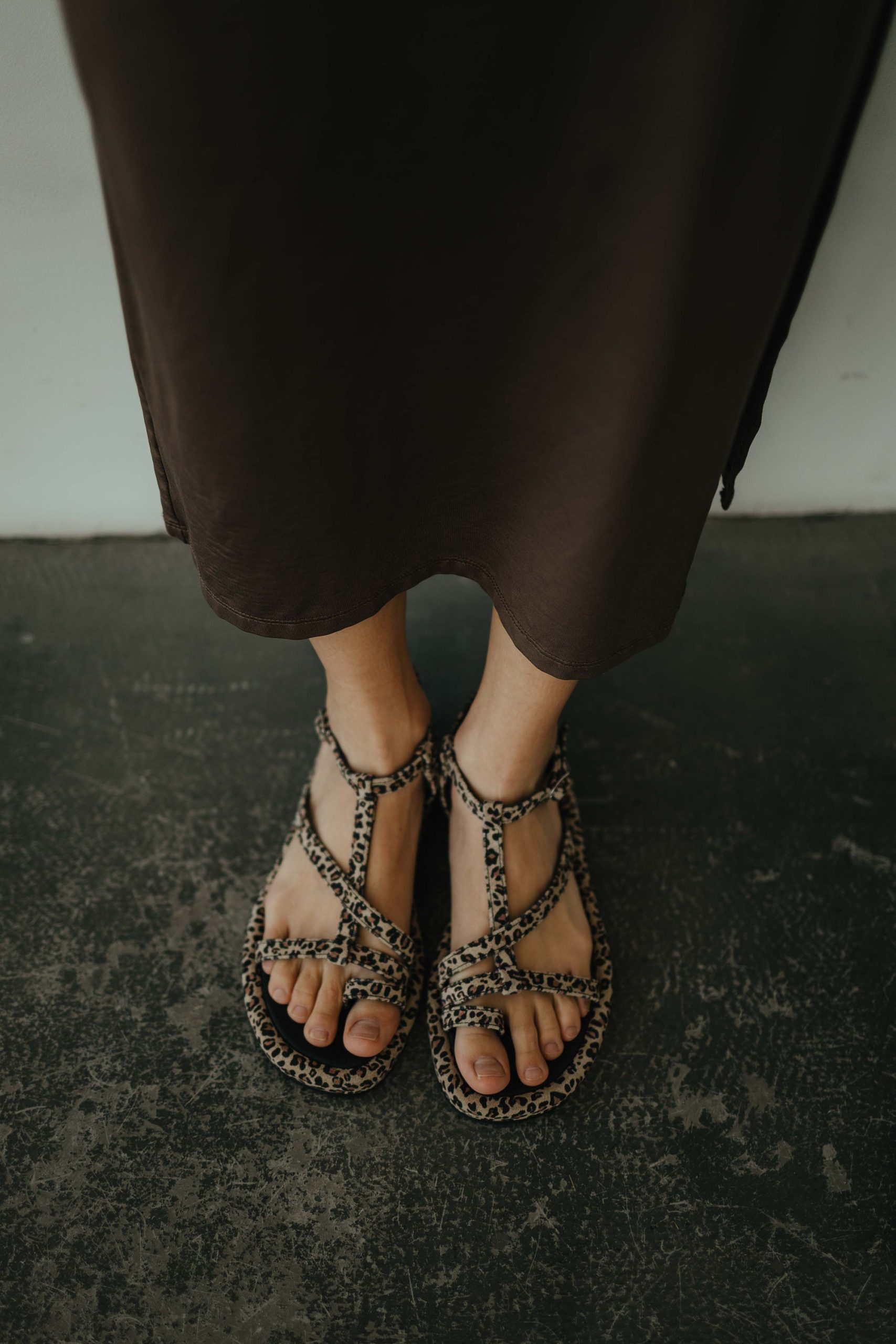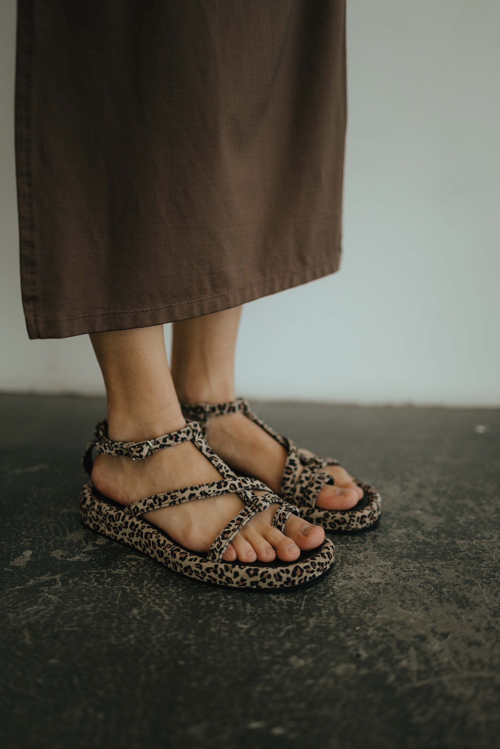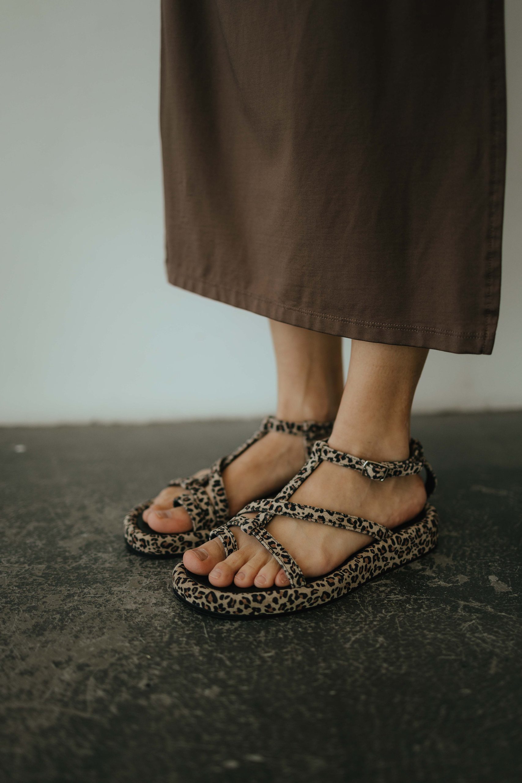 Leopard print with stylish T-strap and crisscross straps—bold yet durable.