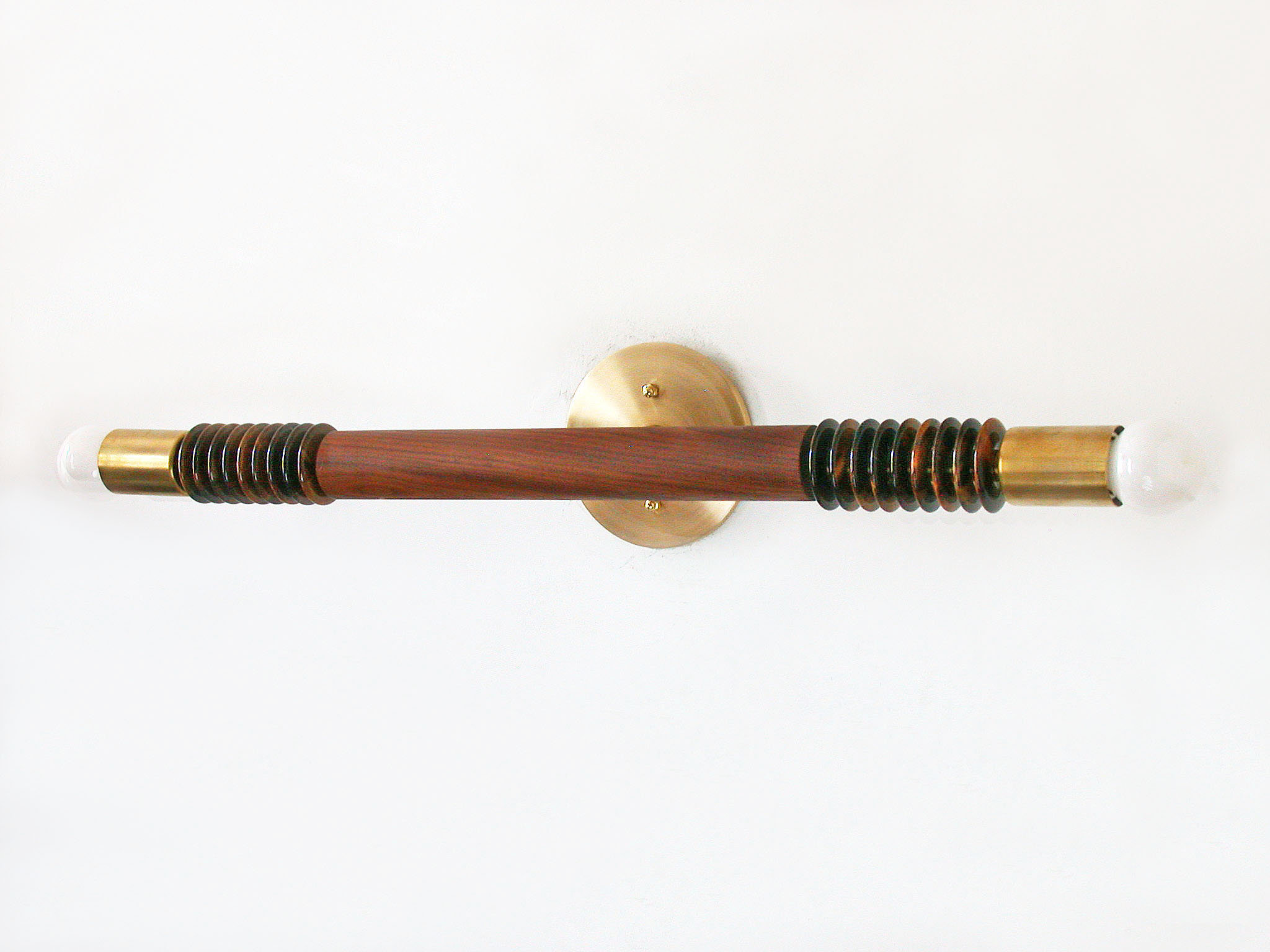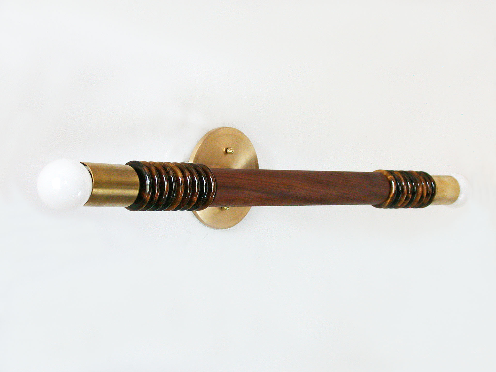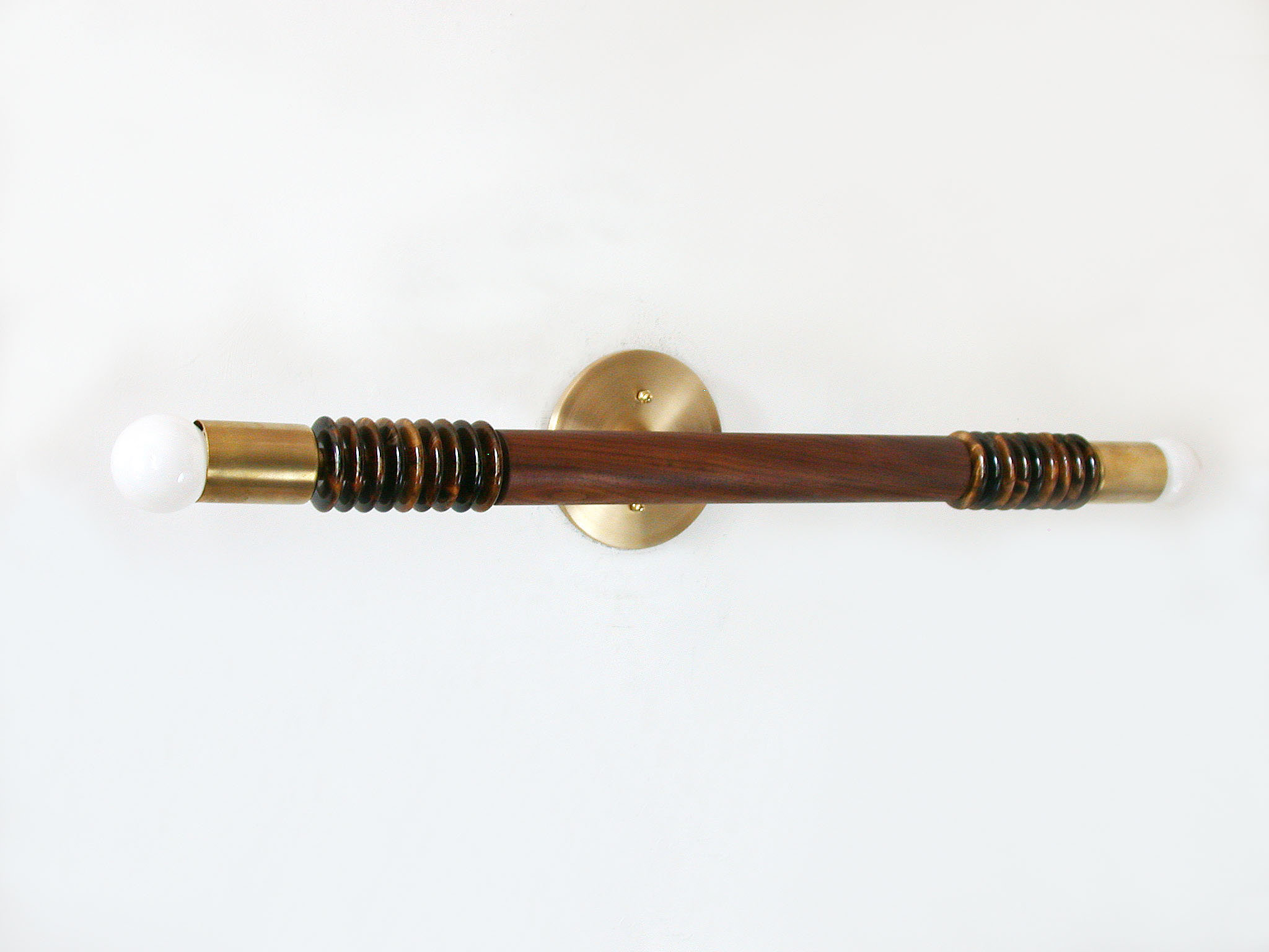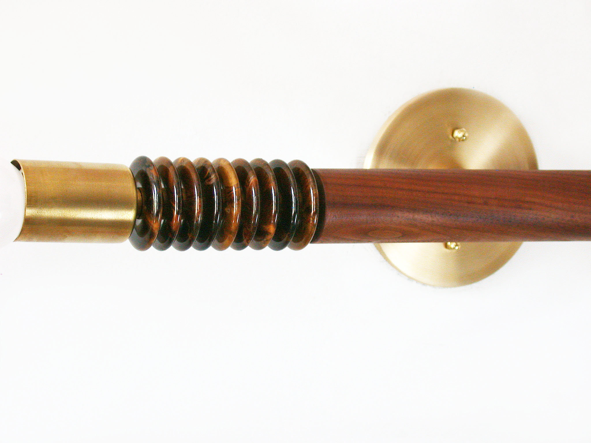 — Sleek linear silhouette: A warm wooden center pole topped with brass is surrounded by sculptural, stacked brass rings.