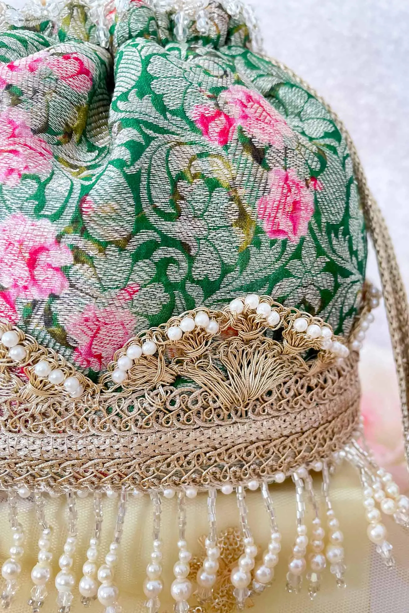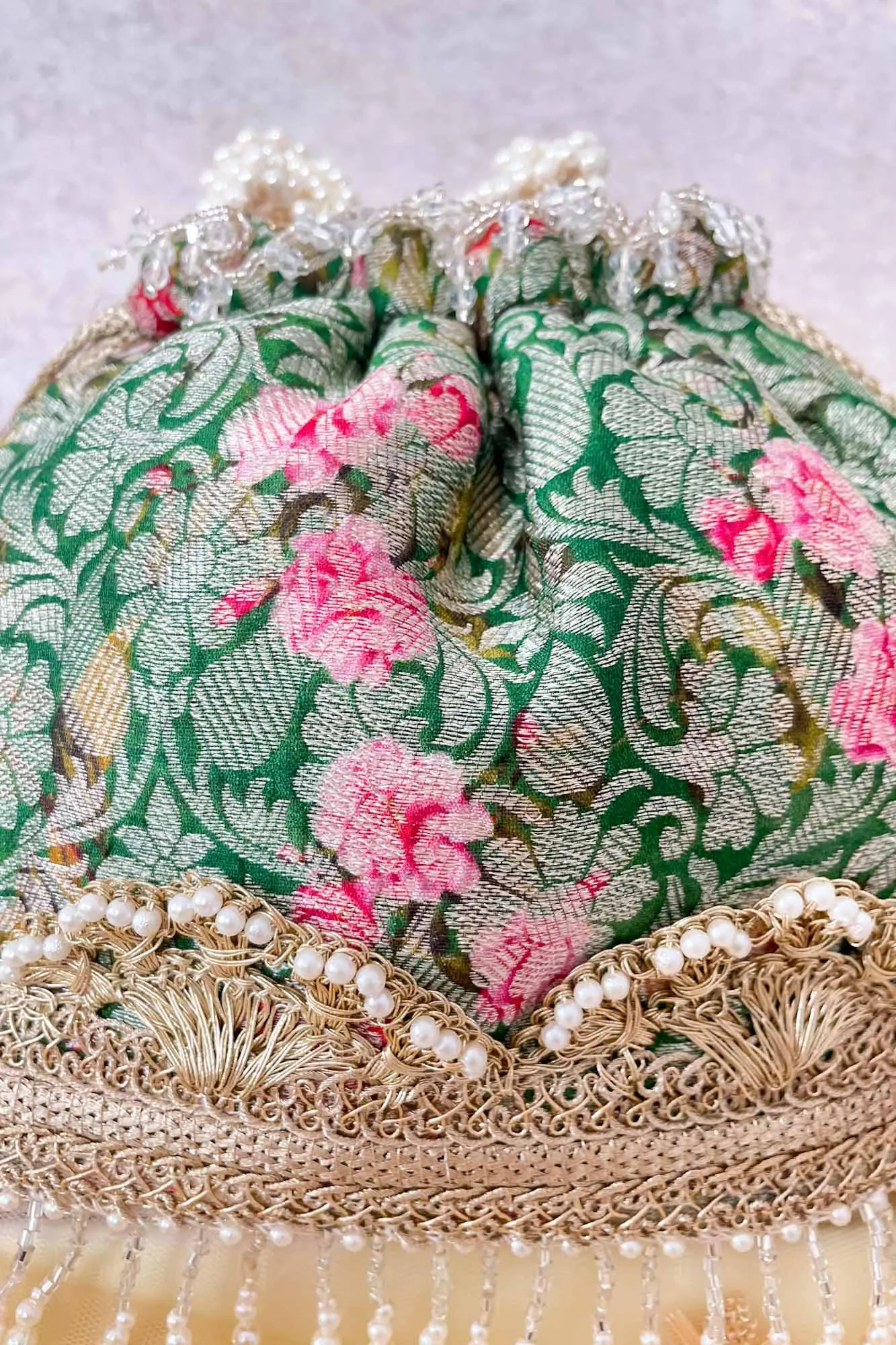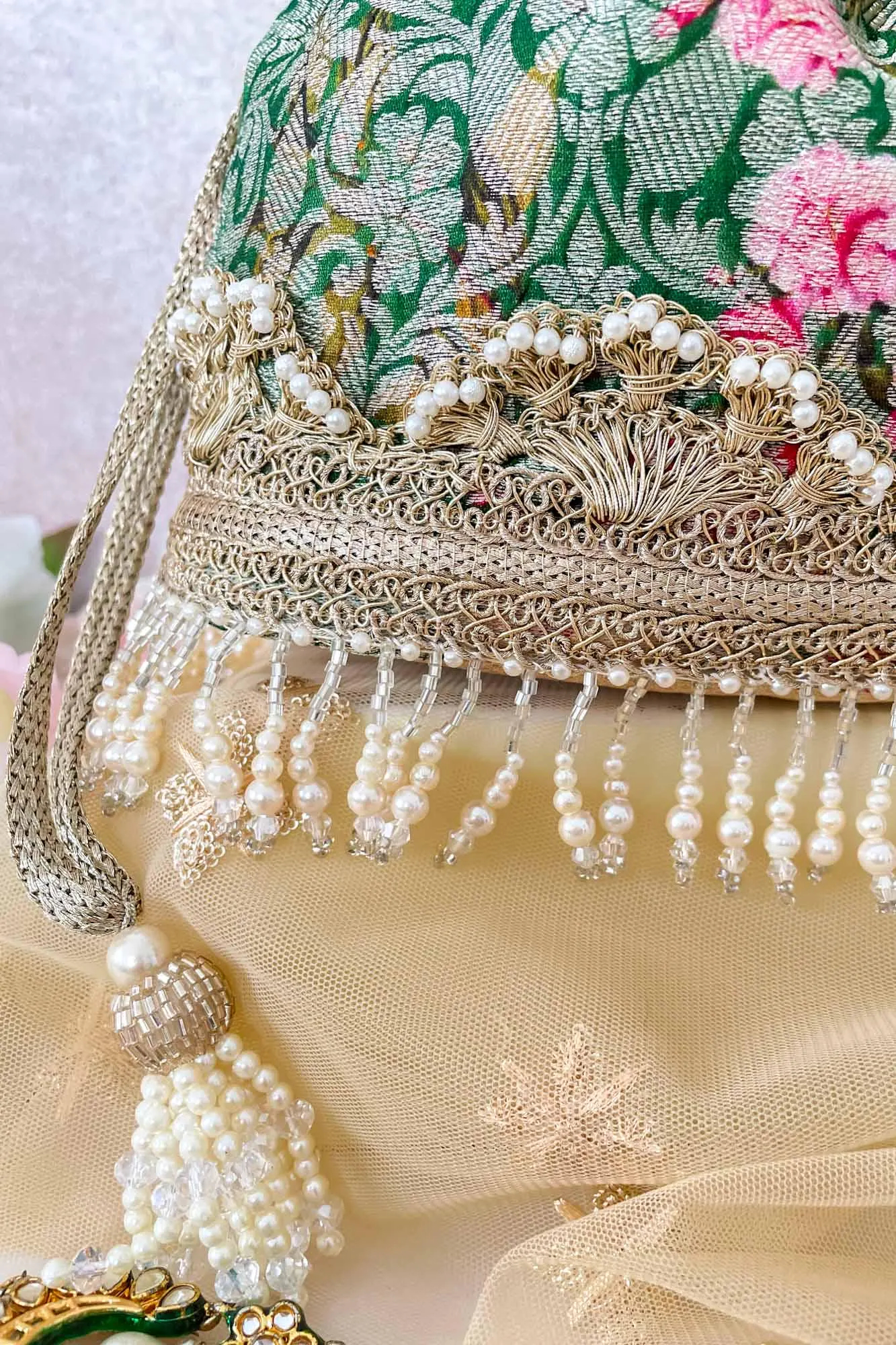 The bag’s rich vintage green base, like jade imbued with time, exudes a tranquil and elegant aura. It’s embroidered with pink florals and golden twined branches. The flowers are vibrant and vibrant, their petals seemingly fresh from the morning dew, while the winding golden branches add a touch of intricate palace beauty to the floral shadows. Every inch of the embroidery evokes the dream of an aristocratic garden.