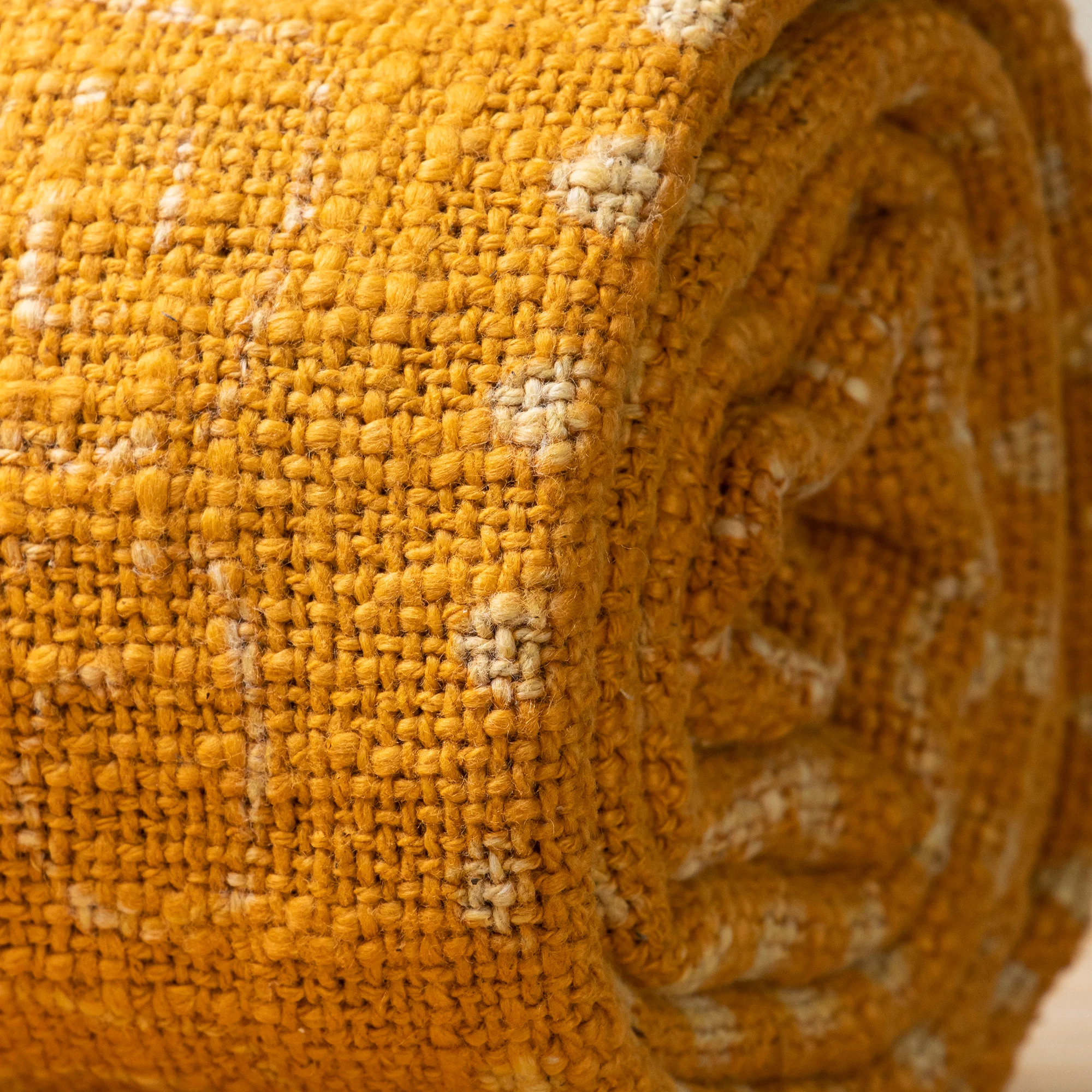 The marigold and light-colored pattern creates a cheerful graphic play without overwhelming the main theme—perfect for bohemian, Mediterranean, or modern natural interiors. Easily drape it over a chair, sofa arm, or ladder to add color, print, and texture.