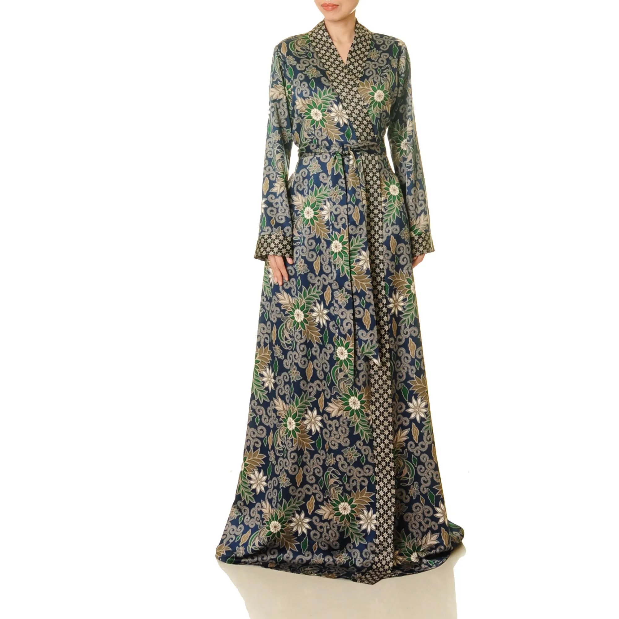 This robe embodies both romance and silhouette. A wrap front frames the neckline, while a self-tie waistband enhances the silhouette. The contrasting pattern outlines a field of midnight florals, creating a stylish impact whether in front of the camera or on the go. The long sleeves and voluminous skirt create an elegant, floor-length gown – perfect for leisurely mornings, travel days, or layering at night.