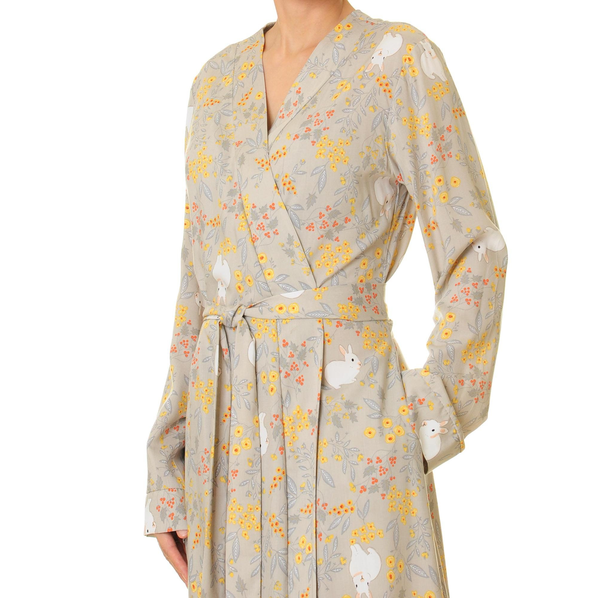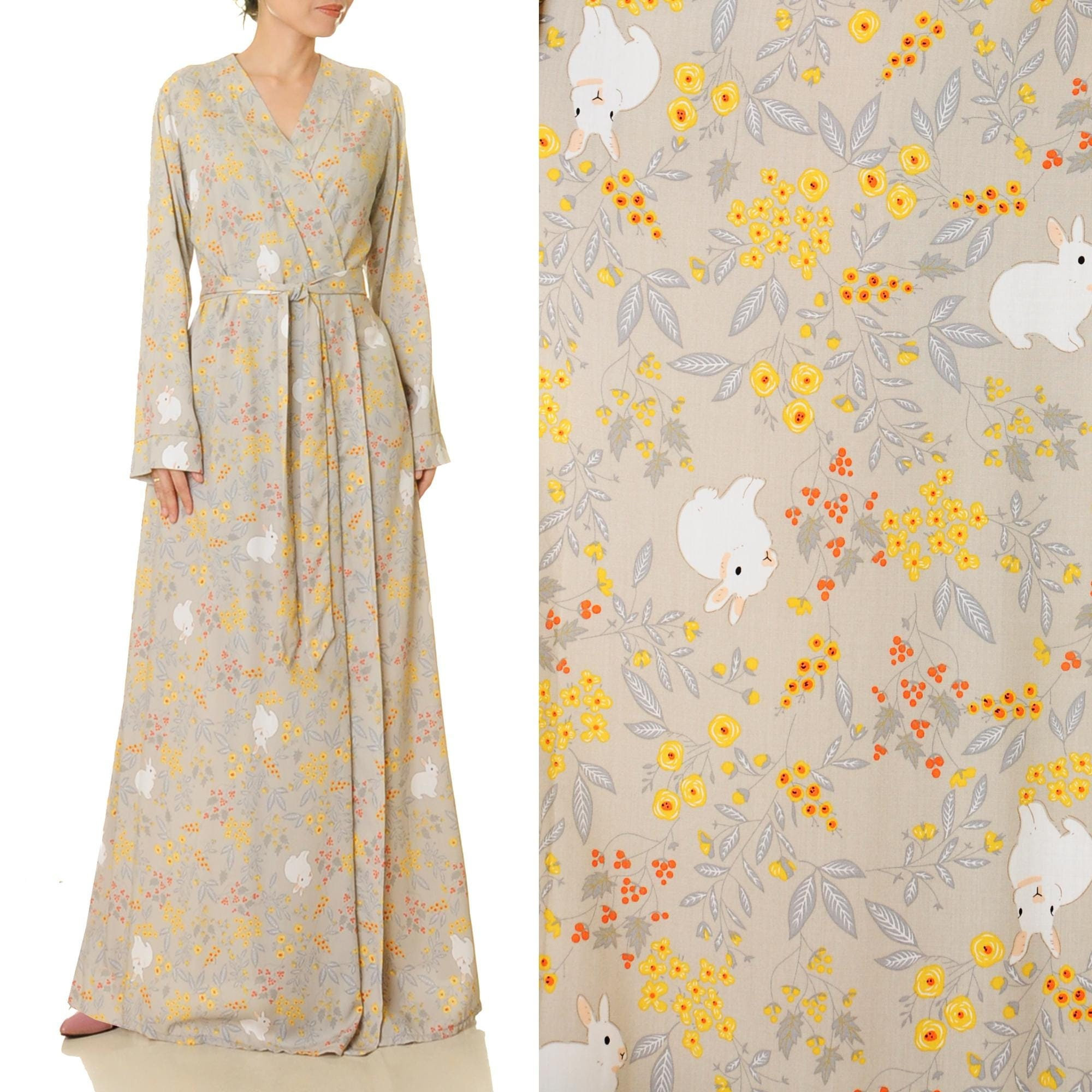 This maxi dress features a minimalist V-neck wrap silhouette, framing slender lines. The matte gray background highlights the pale yellow and peach orange flowers, creating a soft yet sophisticated vibe. The built-in belt in the same fabric adjusts the fit to your body. The long A-line hem creates a flowing curve with every step, and the long sleeves provide enhanced coverage and balance. Whether it’s a sophisticated weekday outfit or a relaxed weekend getaway, it’s instantly stylish and feminine.