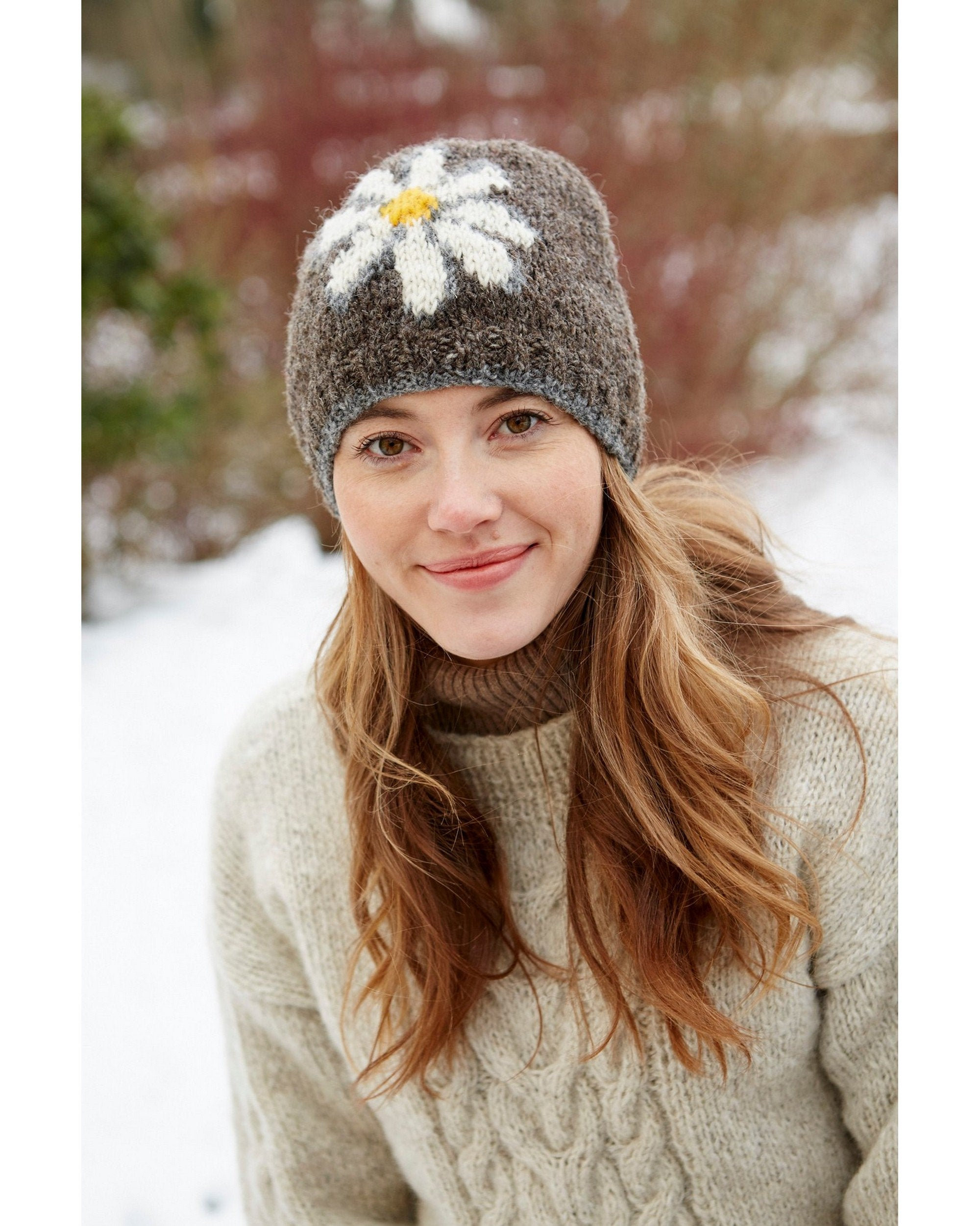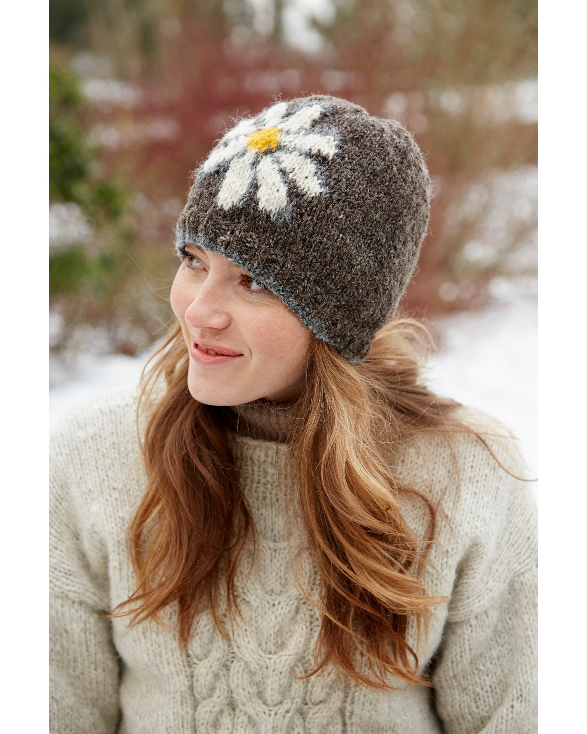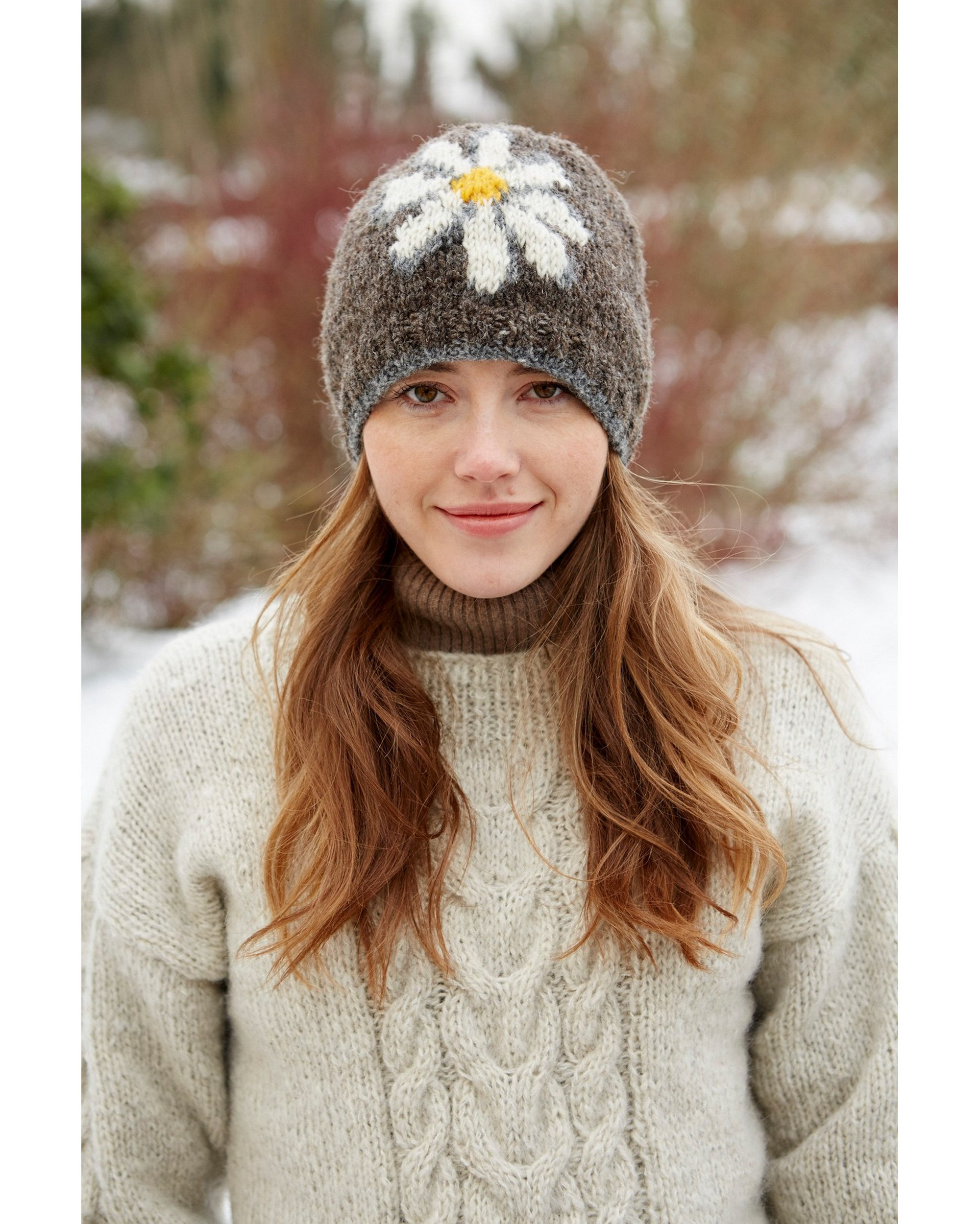 This mocha-colored knit hat features oversized white daisies with bright yellow centers, trimmed with soft misty blue piping, and topped with a mixed-color pom-pom. Warm, comfortable, and vibrant, it’s the perfect way to brighten up a dreary winter day.