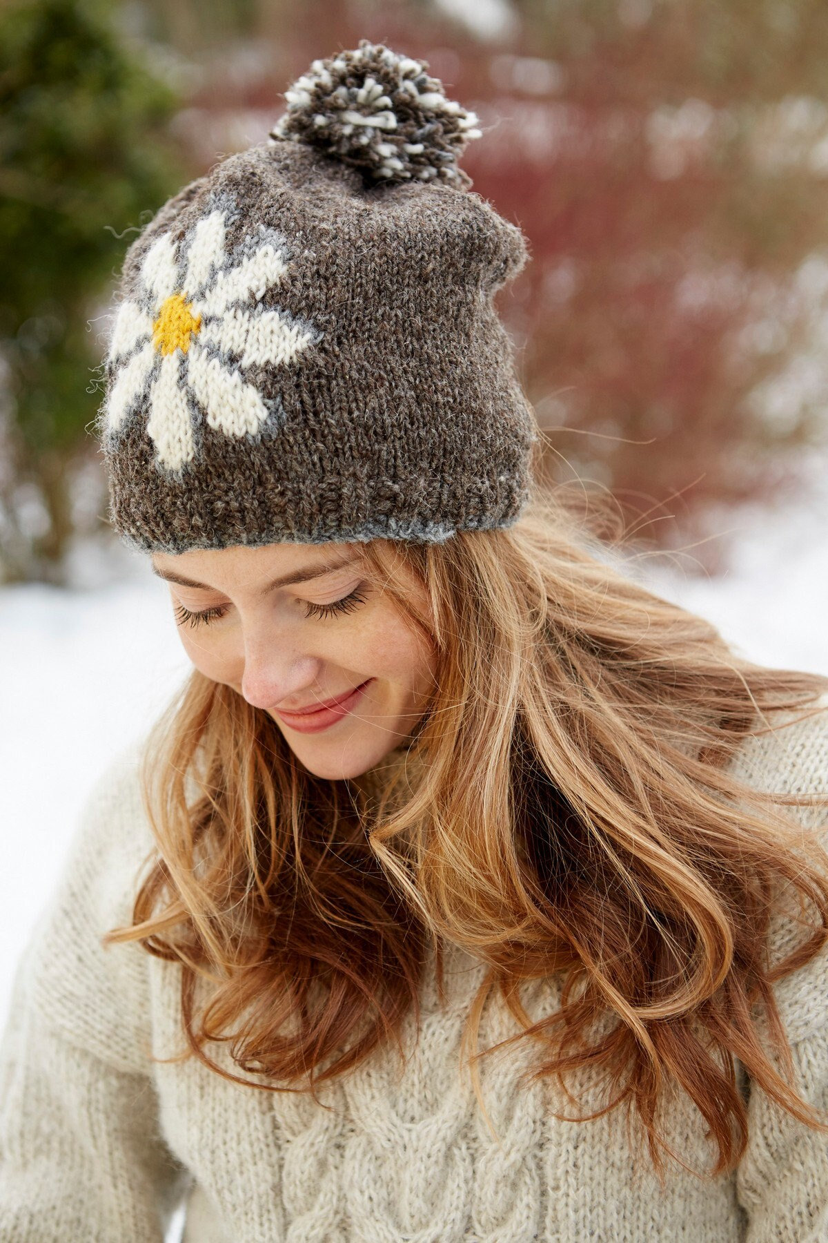 **Details:** Intarsia daisy on the crown; contrasting blue piping; securely stitched mixed-color pom-pom.