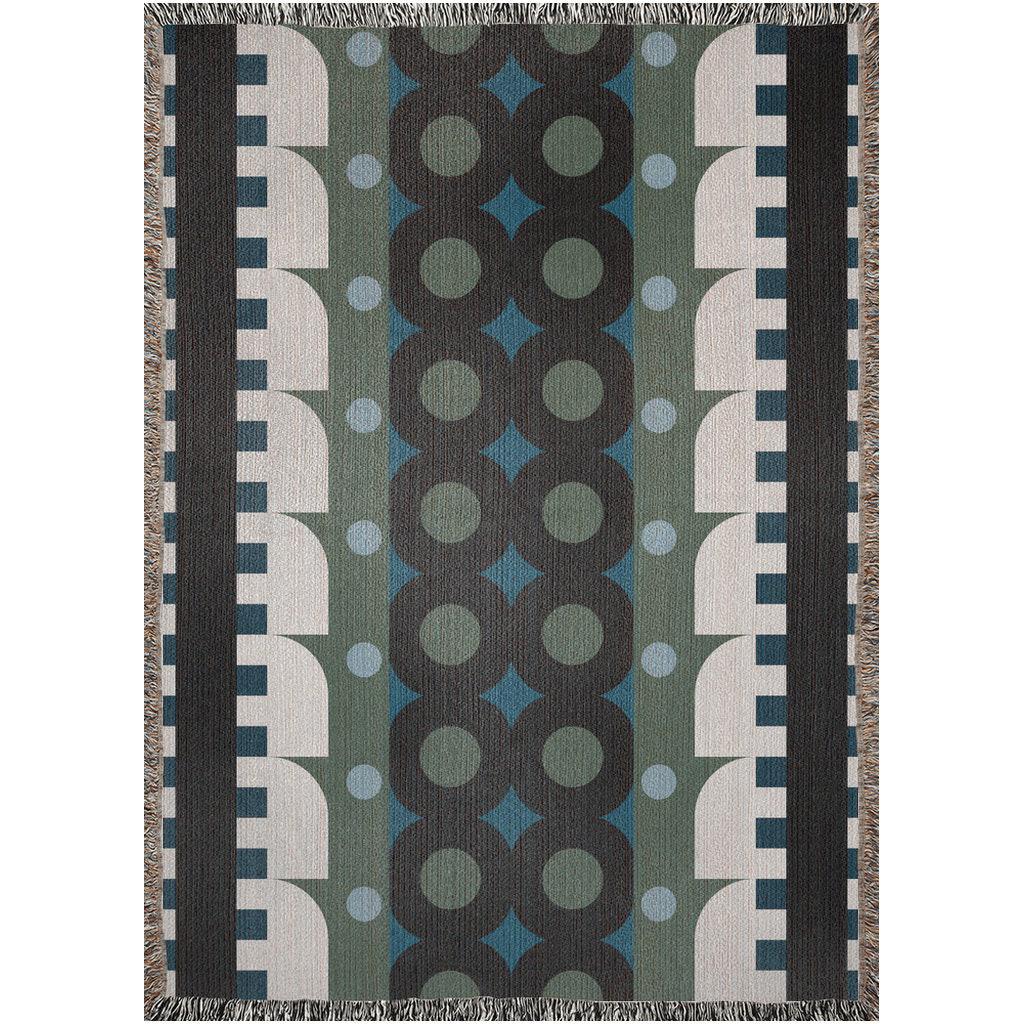 Circle & Stripe Geometric Pattern – A bold central column of repeating circles framed by stepped and striped borders creates a structured, mid-century inspired design.