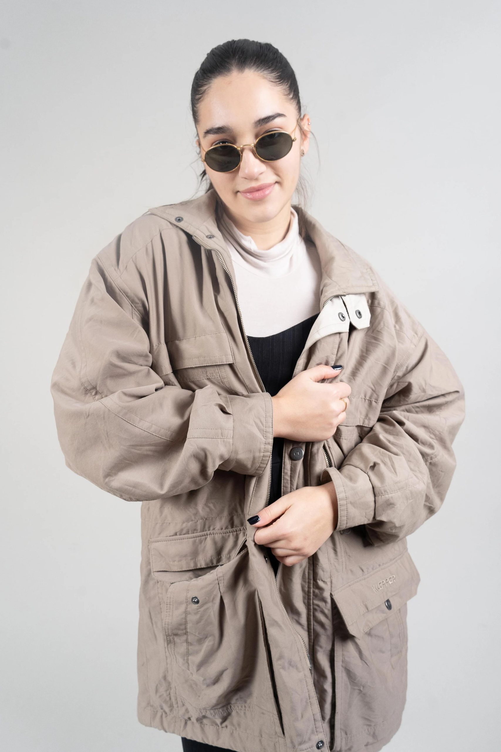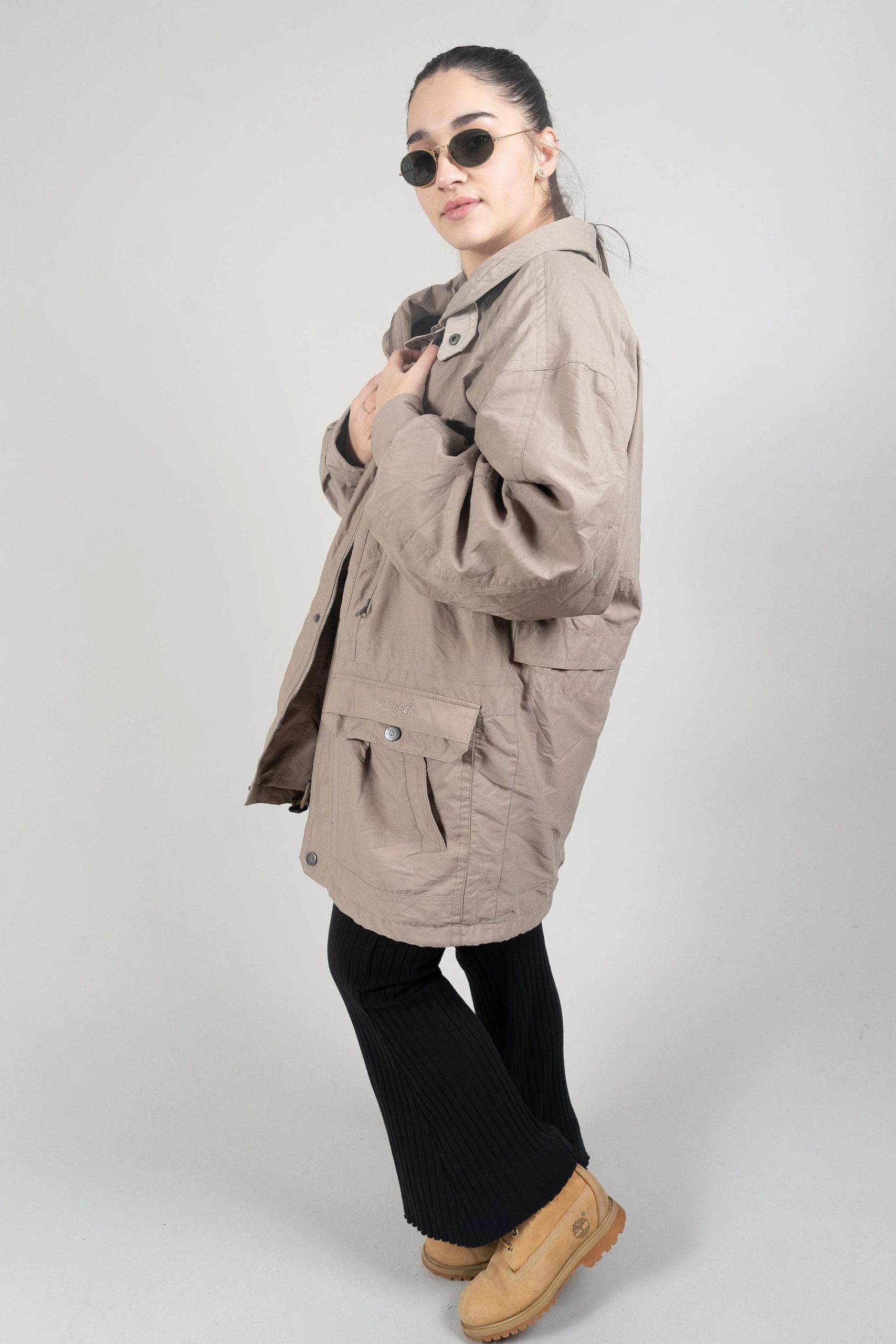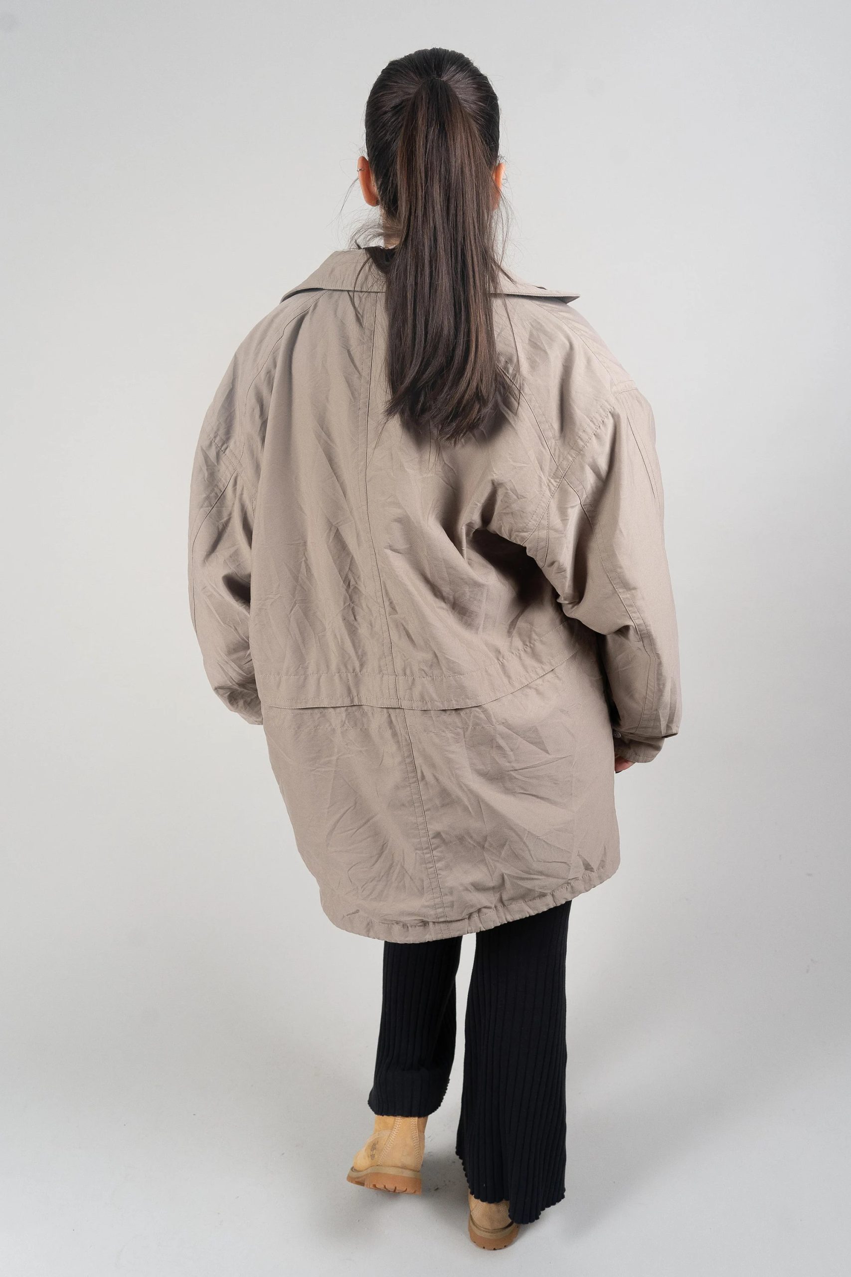 This field-style parka is designed for busy everyday wear and easy layering. It features a versatile taupe color and a soft, comfortable feel. The front has a smooth zip-up and snap-button windproof closure, while the stand-up collar fits snugly around the neck and closes tightly in changing weather. Two chest flap pockets and two side hem pockets provide convenient storage for essentials; side hand pockets add convenience. The relaxed, mid-length cut allows for easy layering over a cardigan or blazer, and the drawstring hem allows for adjustable fit from loose to fitted. Adjustable cuffs create a clean, tailored silhouette—ideal for commuting, travel, or weekend outings.