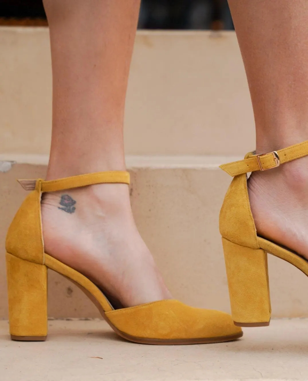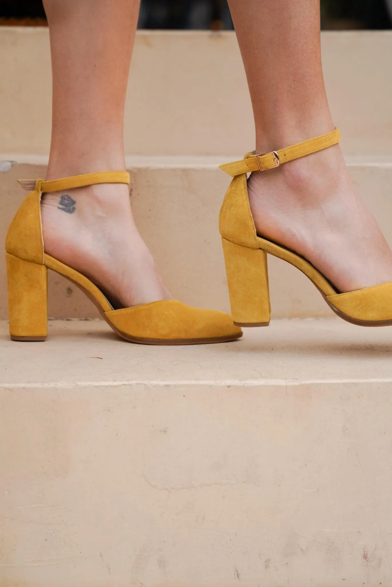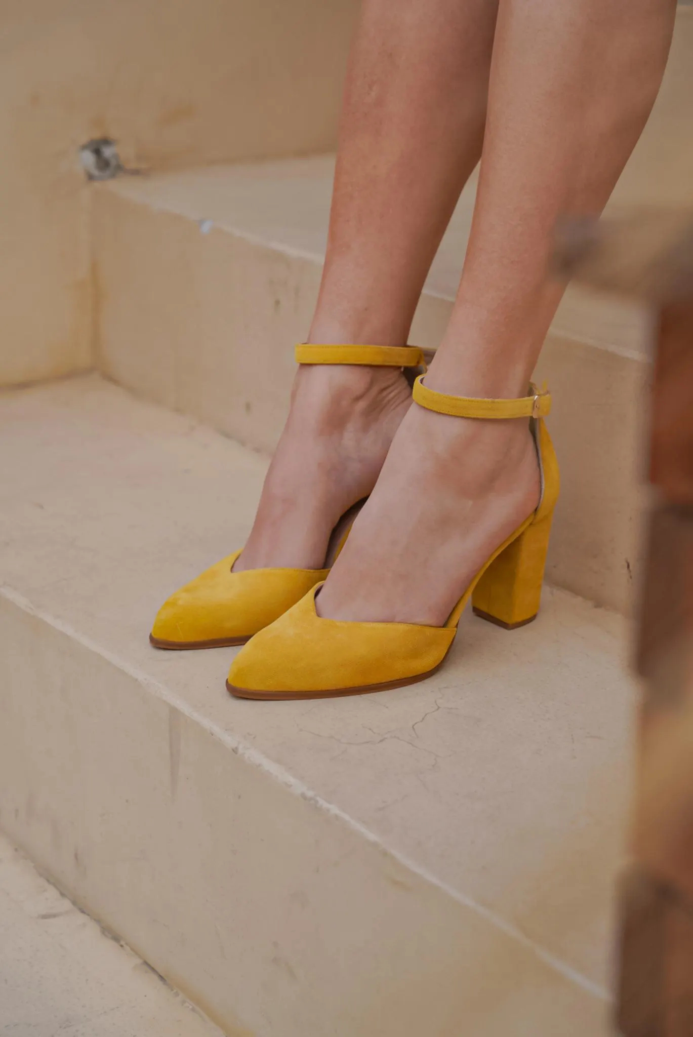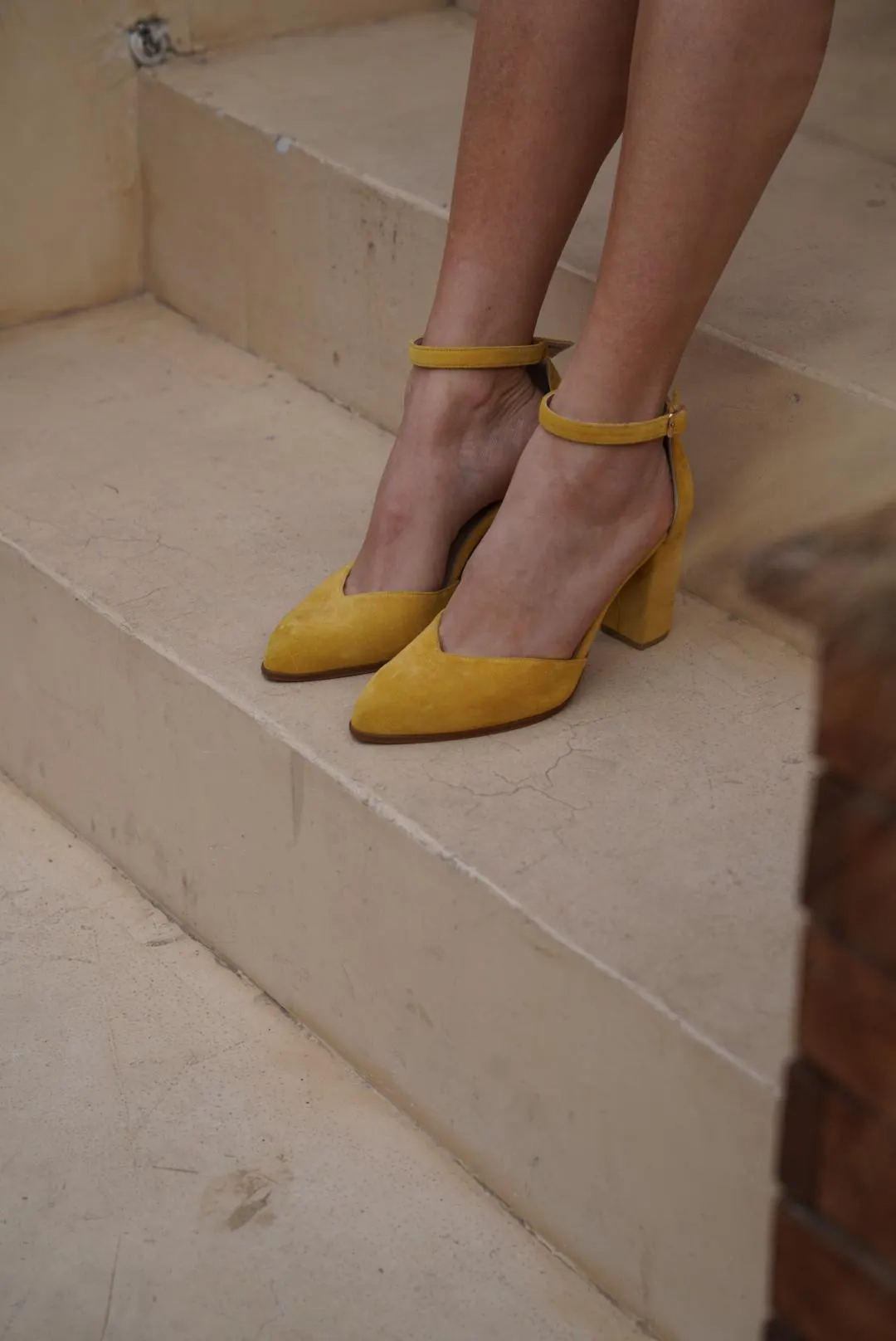 Sun-kissed mustard yellow suede adds a fresh and vibrant touch to these sleek pointed-toe shoes. The V-shaped upper elongates the foot, while a slim, adjustable ankle strap ensures a secure and comfortable fit without bulk. The balanced chunky heel provides a confident lift and a steady stride, making them perfect for any occasion, from the workplace to evening events.