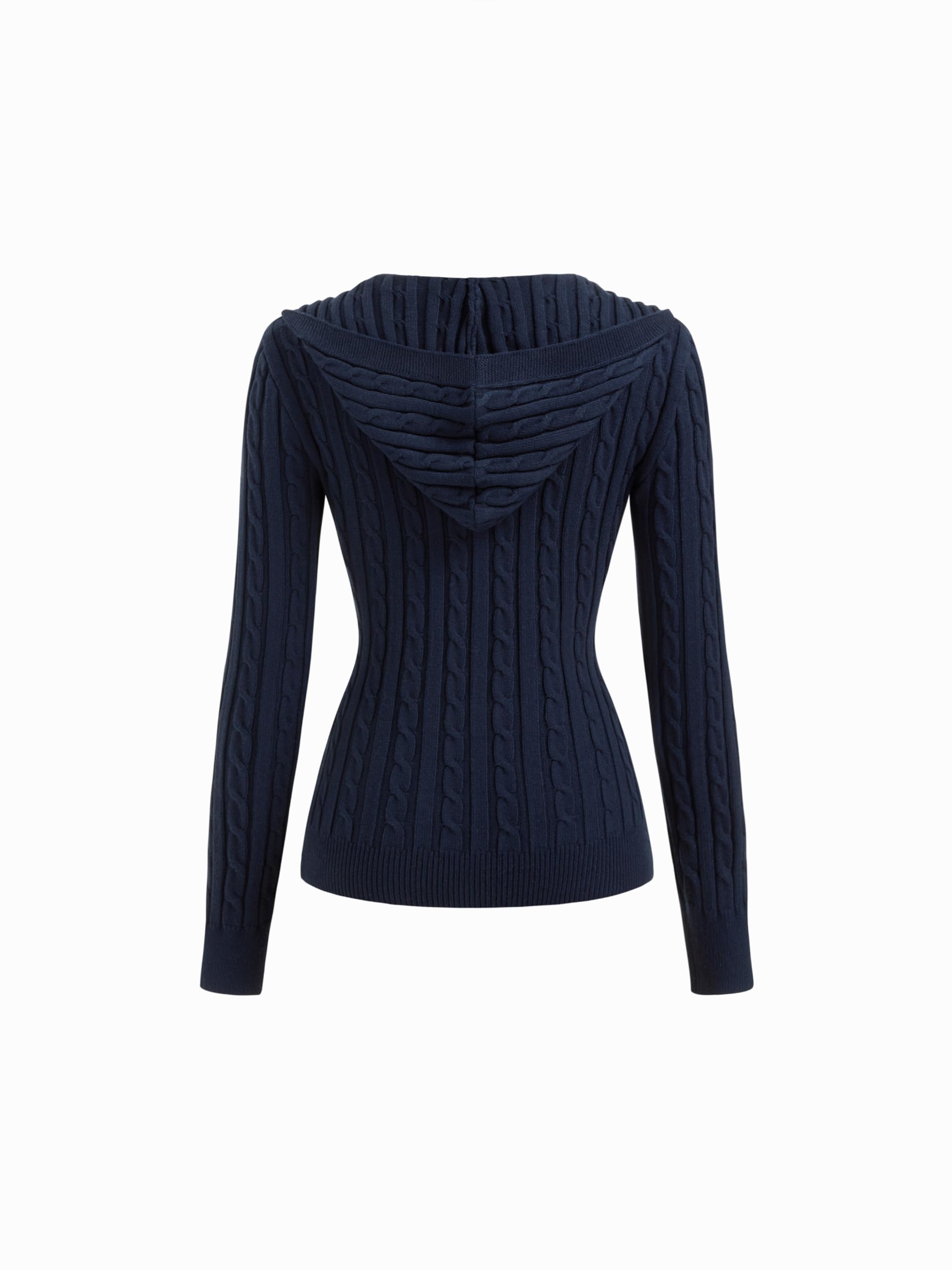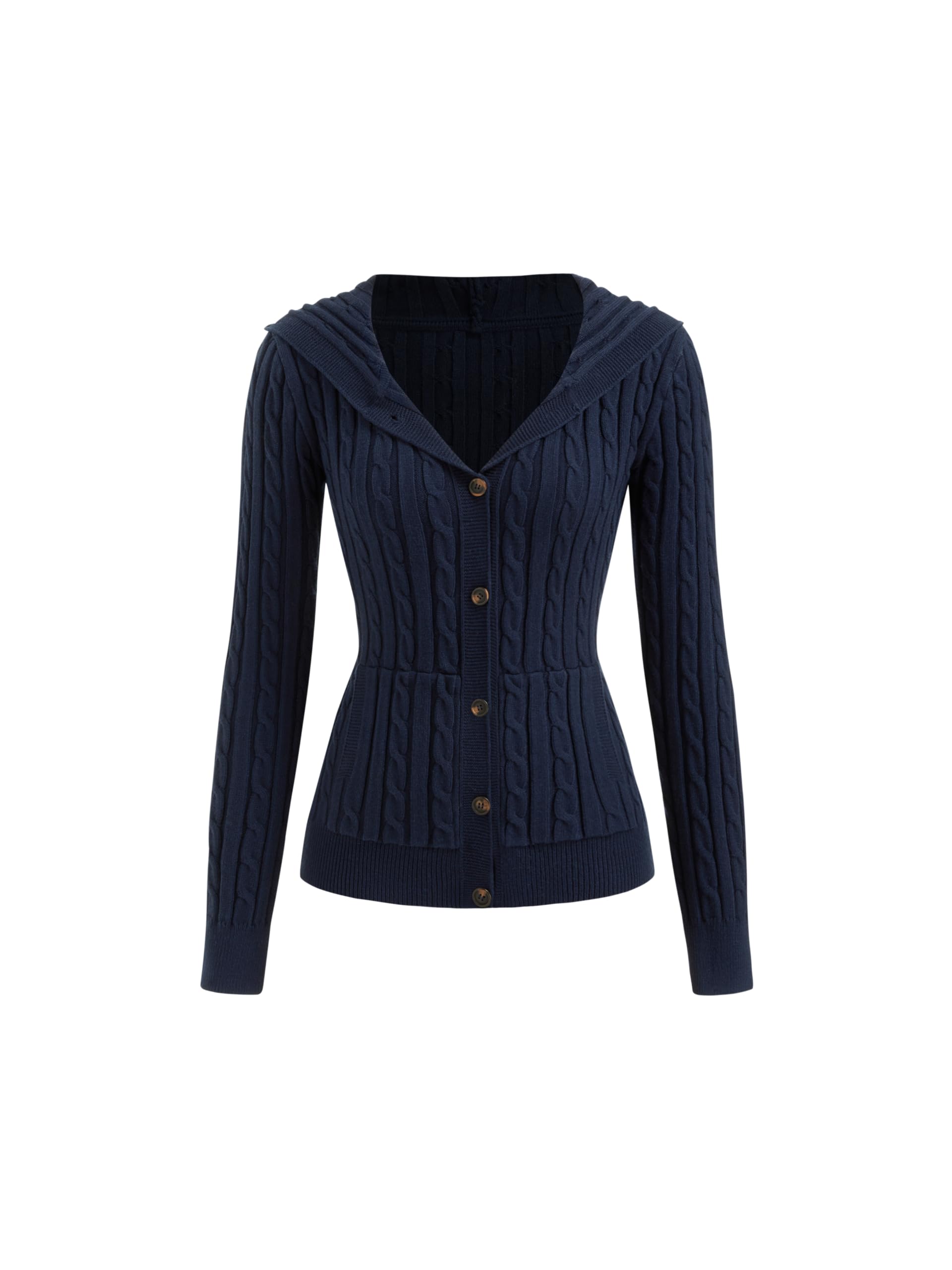 Sailor-style hooded collar paired with flowing cable-knit fabric