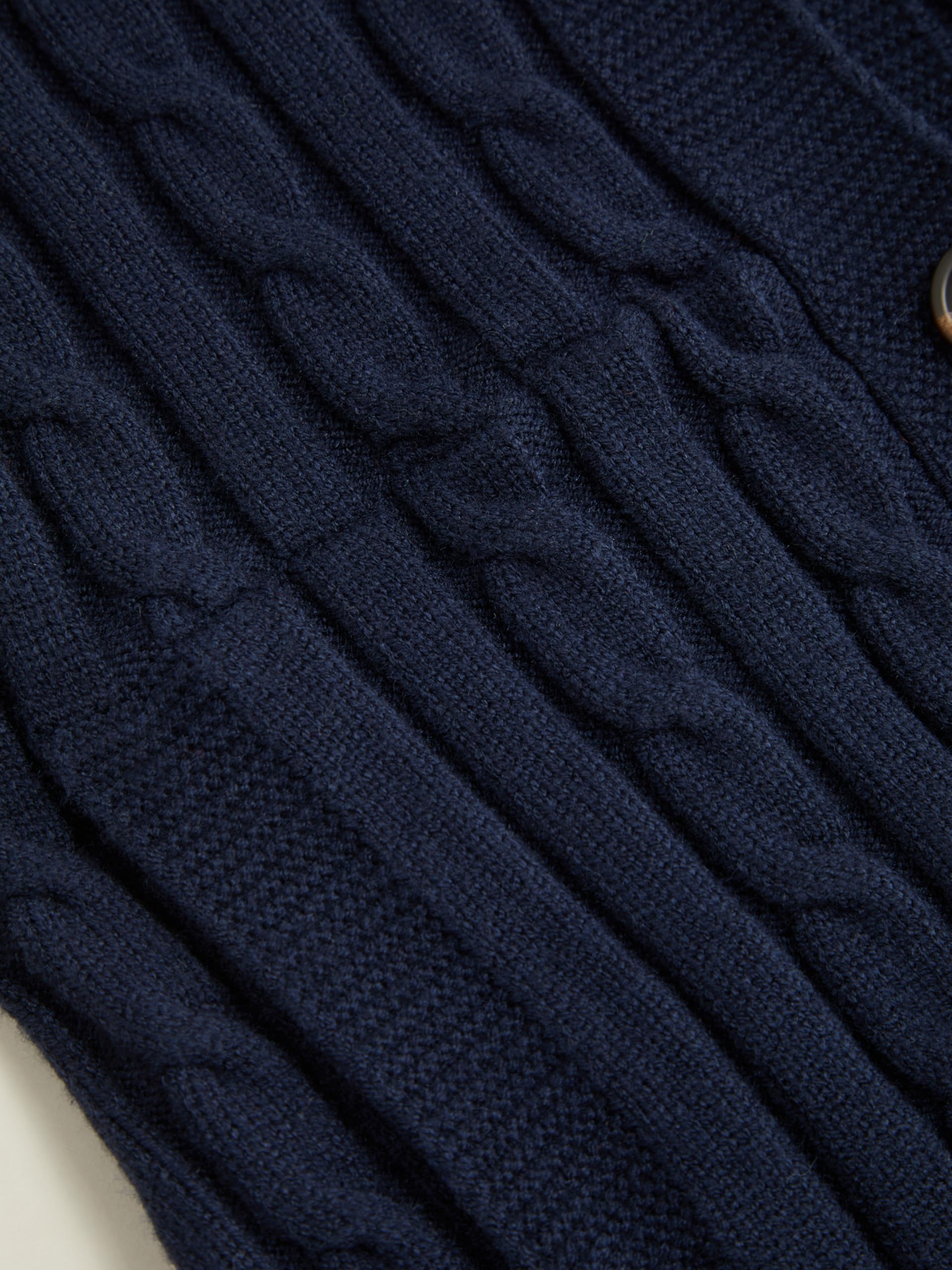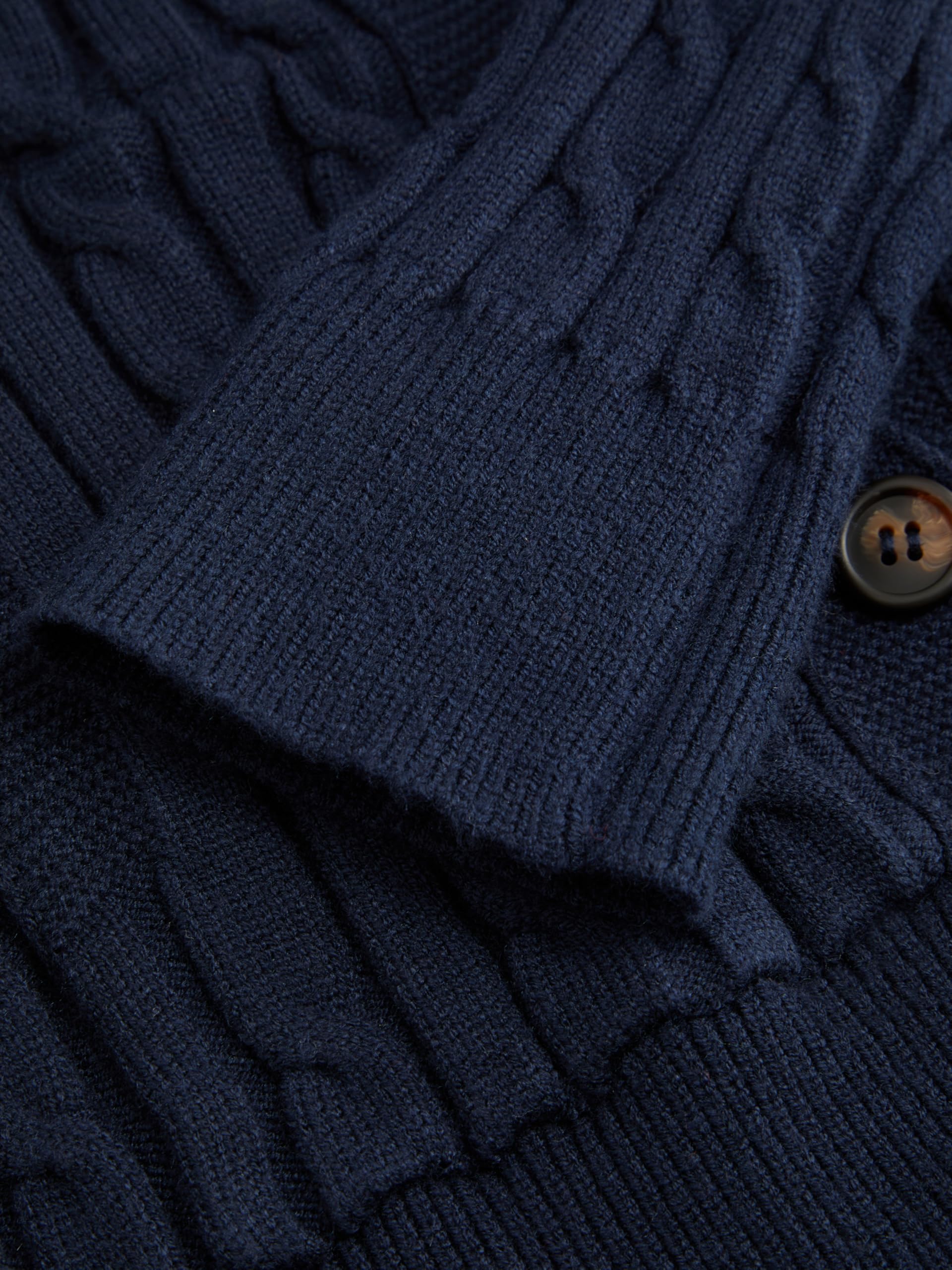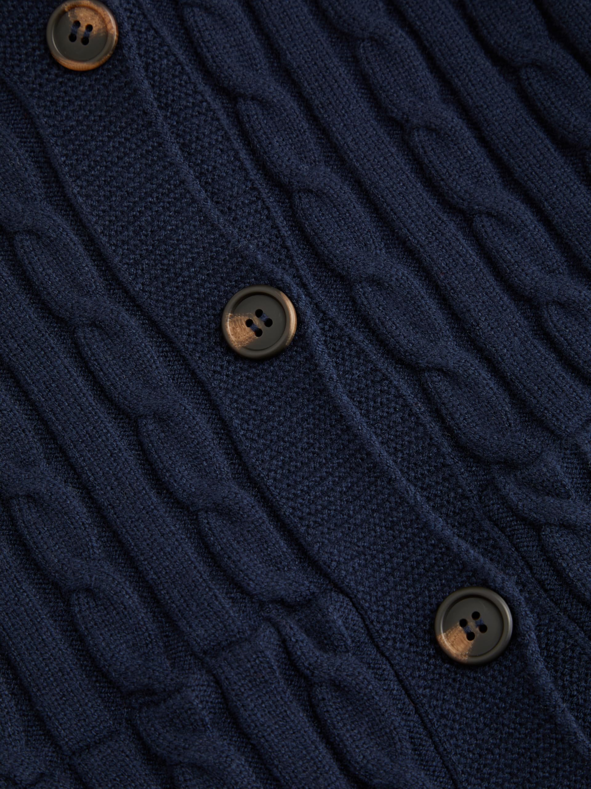 Tortoiseshell buttons—provide a subtle contrast to the deep navy blue
