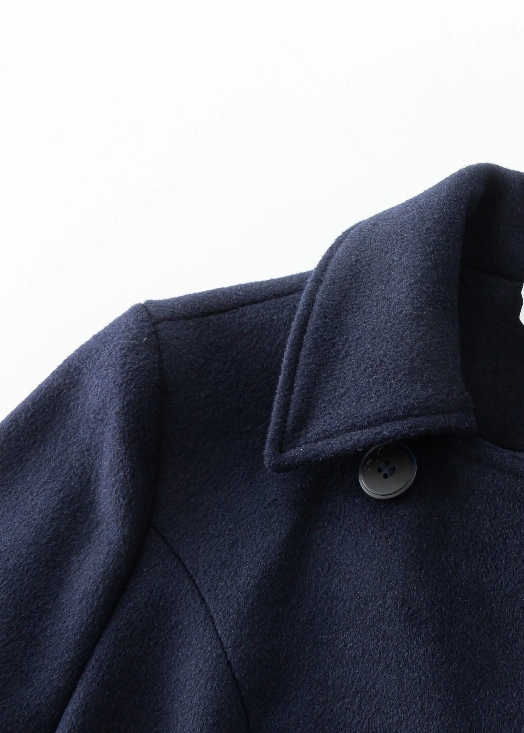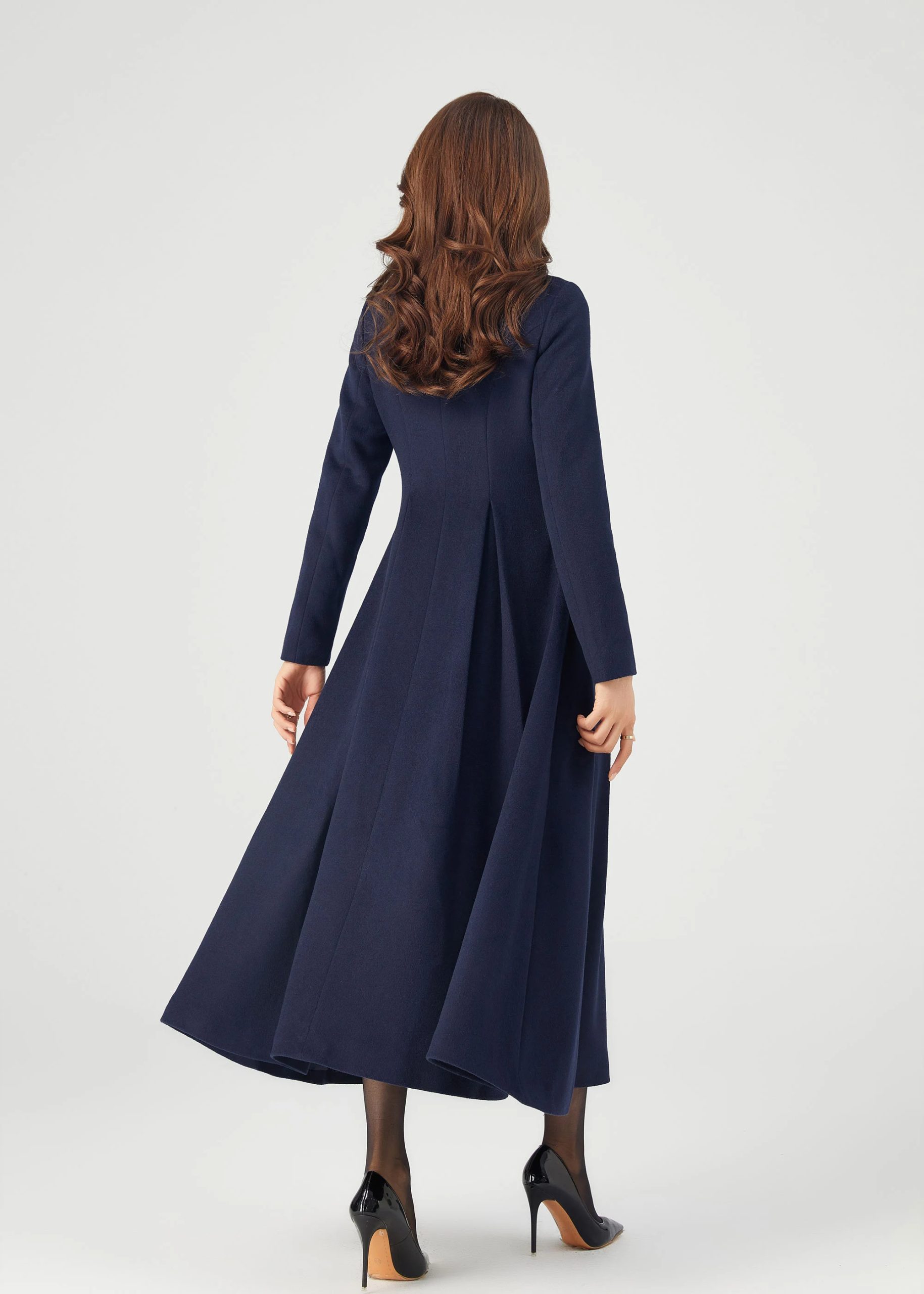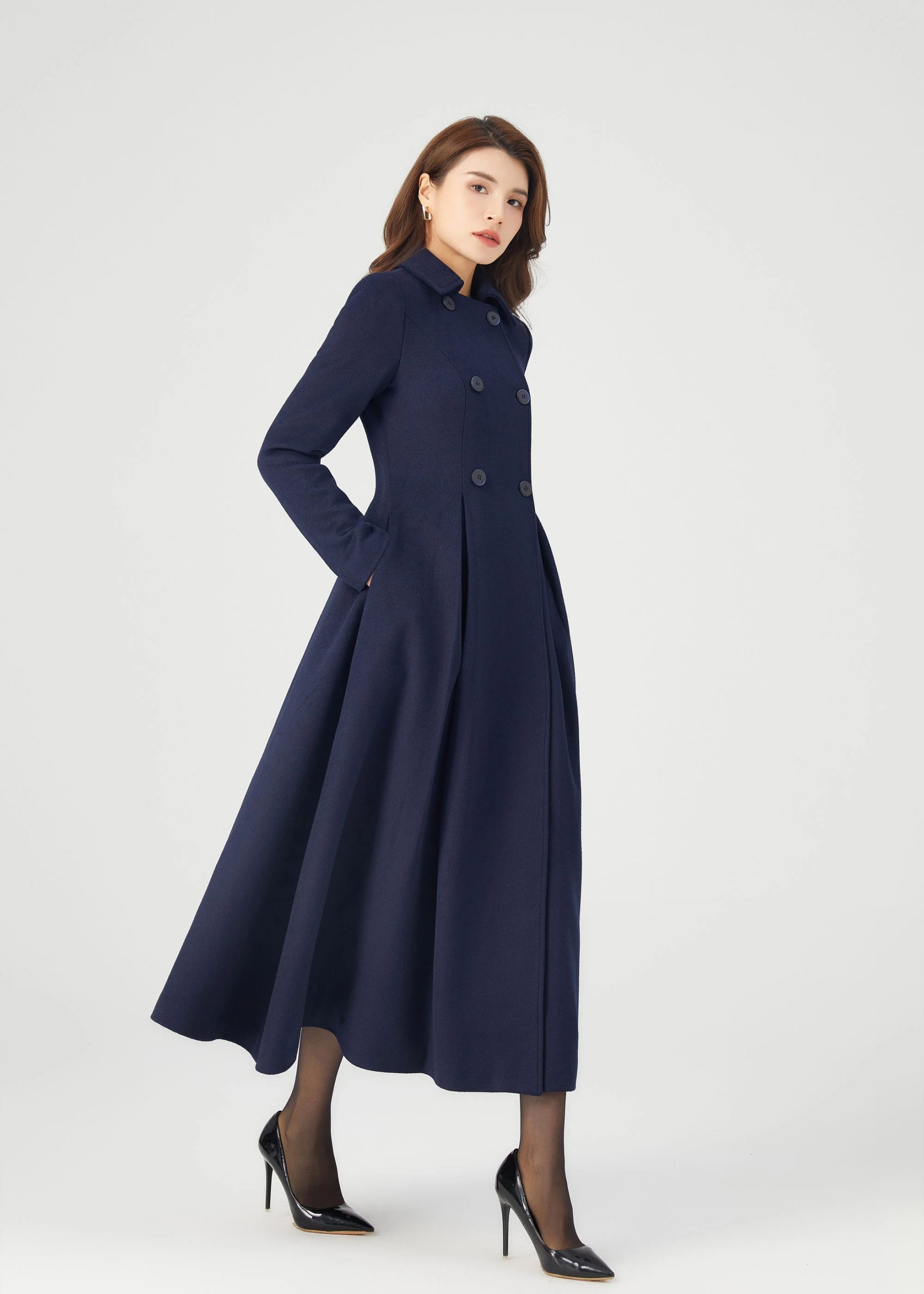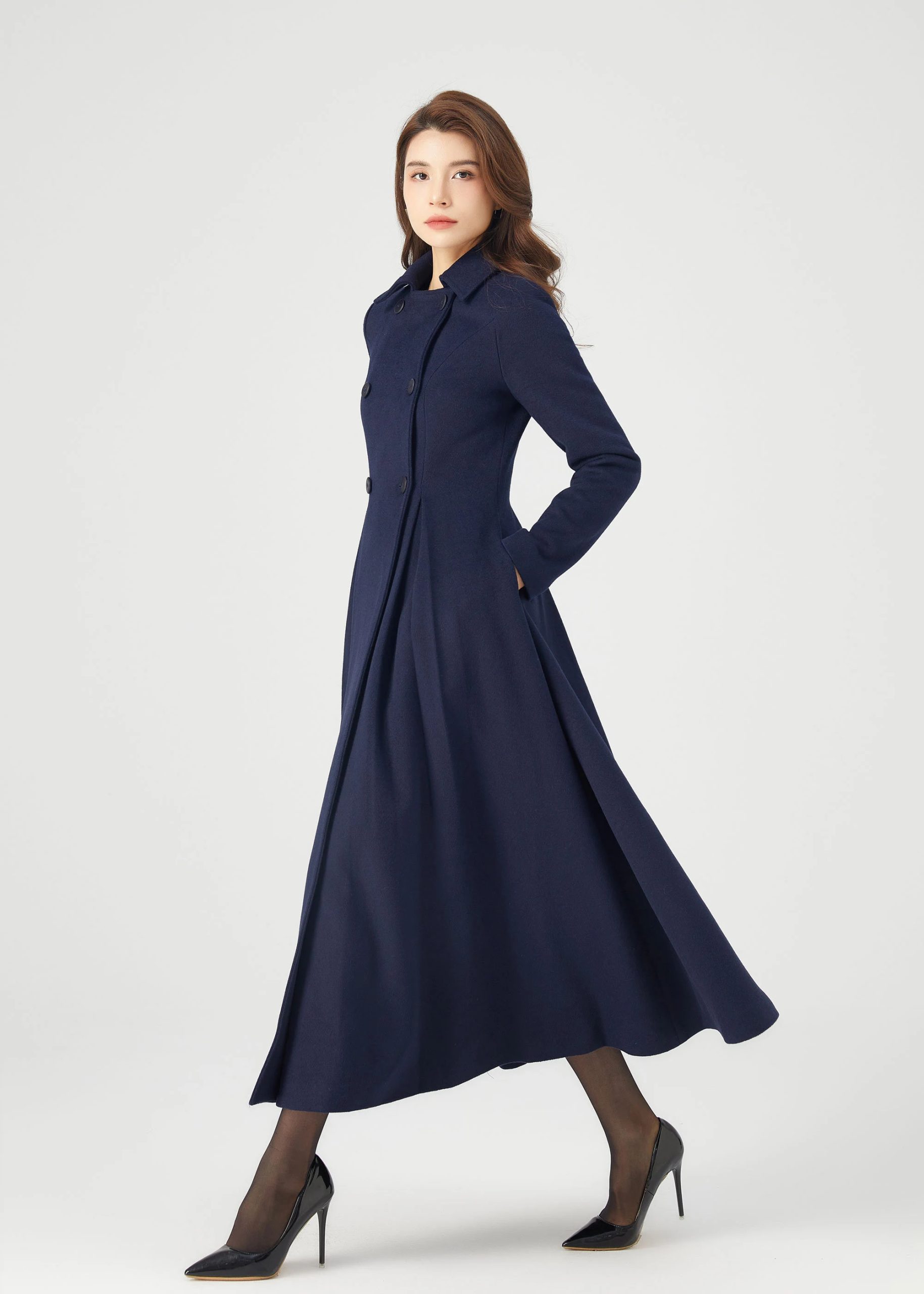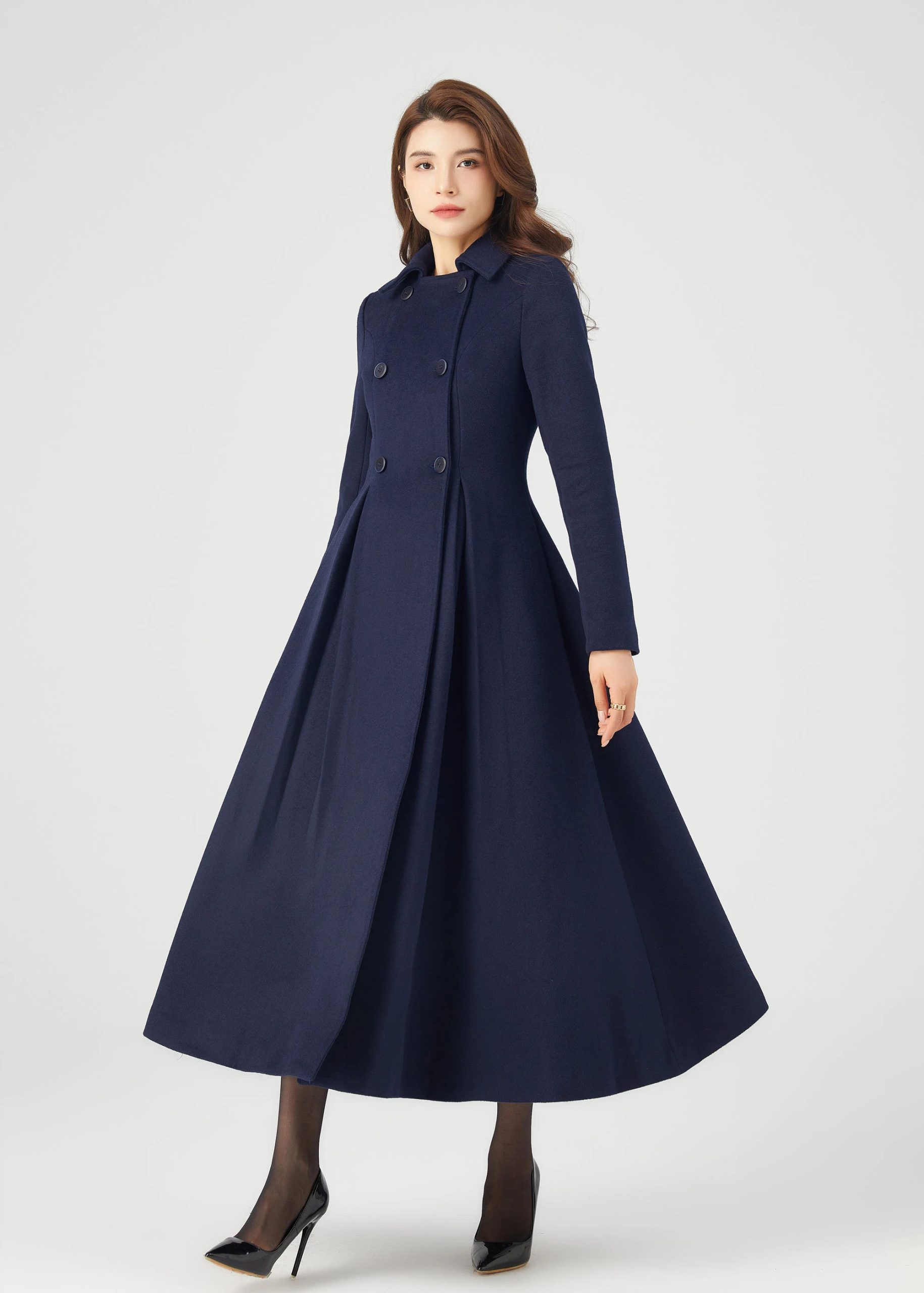 This exquisite long coat in dark navy is tailored to fit and flare, hugging the torso and accented with a flowing A-line hem. Its sharp peak collar and high, double-breasted front create a clean, elongated silhouette, while princess seams define the waist. Center-front pleats create a fluid, yet effortless look. Raglan sleeves maintain the streamlined silhouette, while cleverly integrated side pockets offer practical functionality without sacrificing minimalist style.