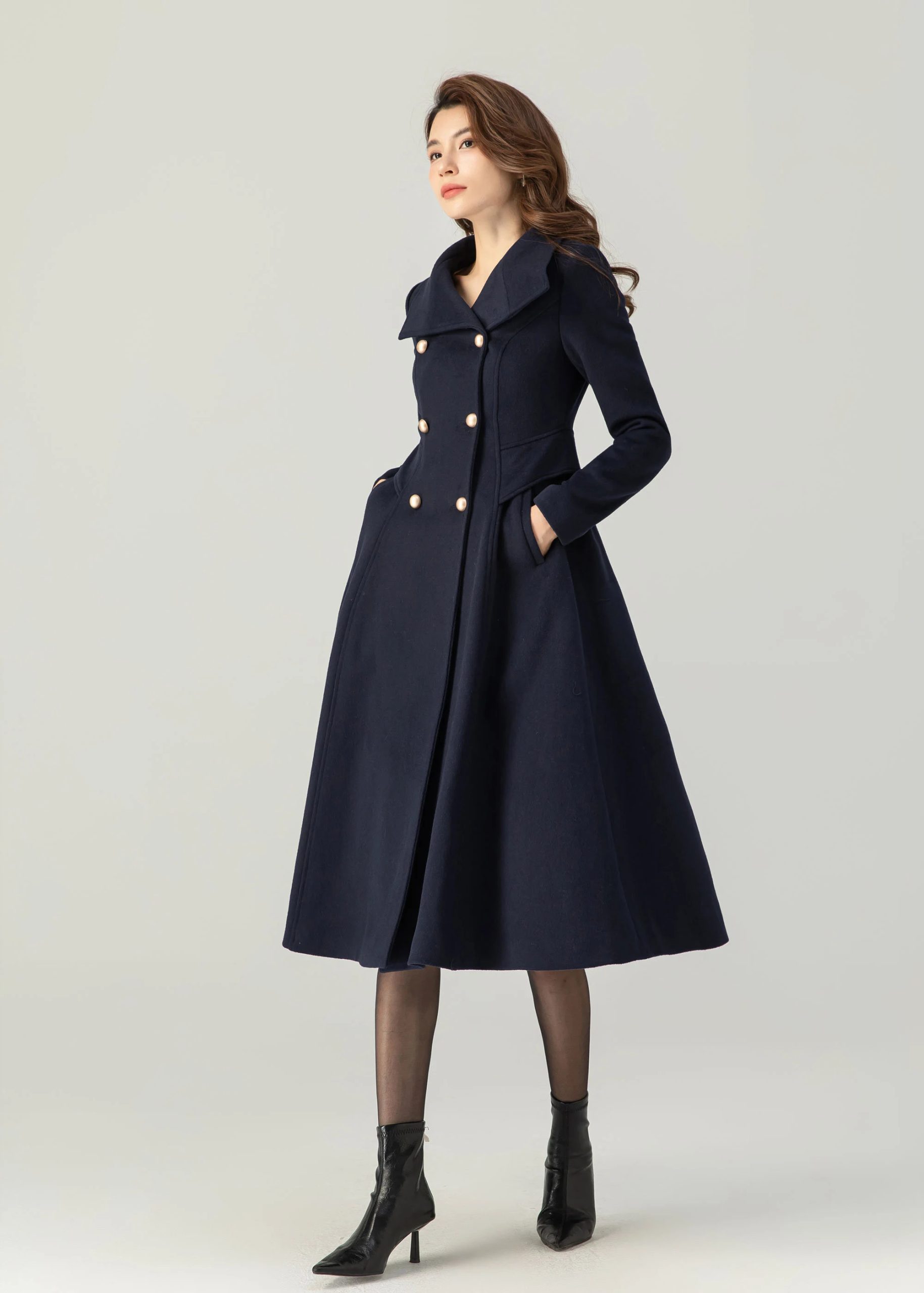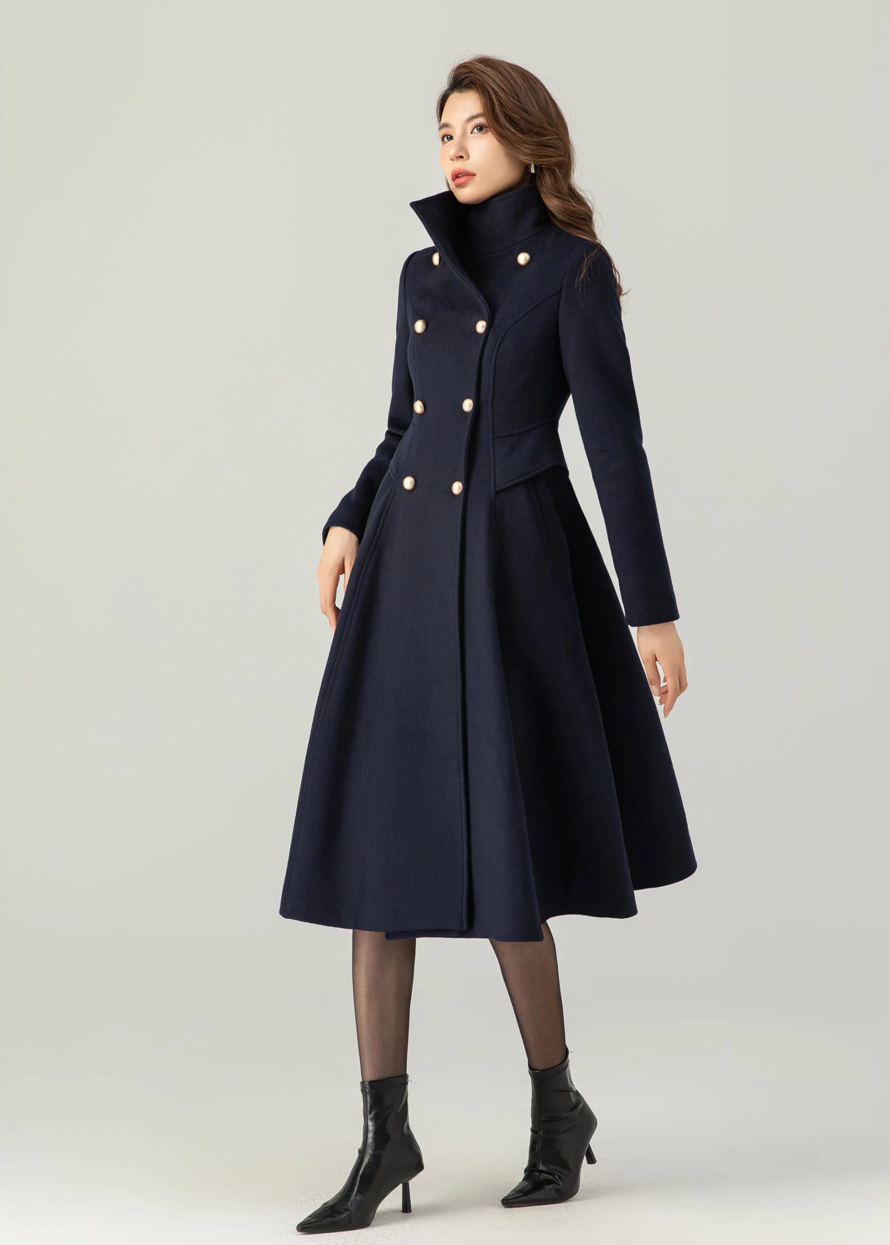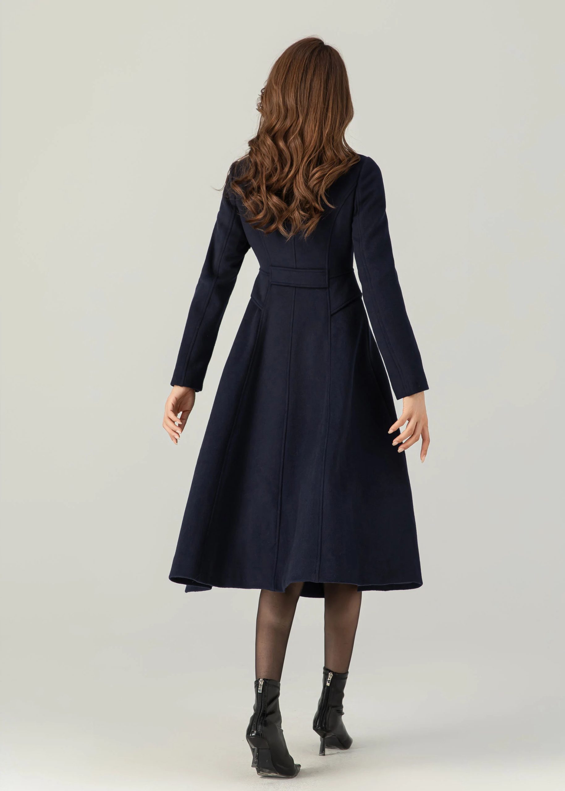 This elegant long coat in dark navy features a fitted and flared silhouette with a defined waist and an A-line hem. The corseted bodice features a sculptural high funnel neckline and double-breasted placket embellished with pearlescent buttons, adding a refined, vintage touch. Princess seams define the torso, while an inverted pleat at the center front creates a dynamic yet restrained look. Raglan sleeves maintain a streamlined silhouette, while strategically integrated side pockets maintain clean lines.
