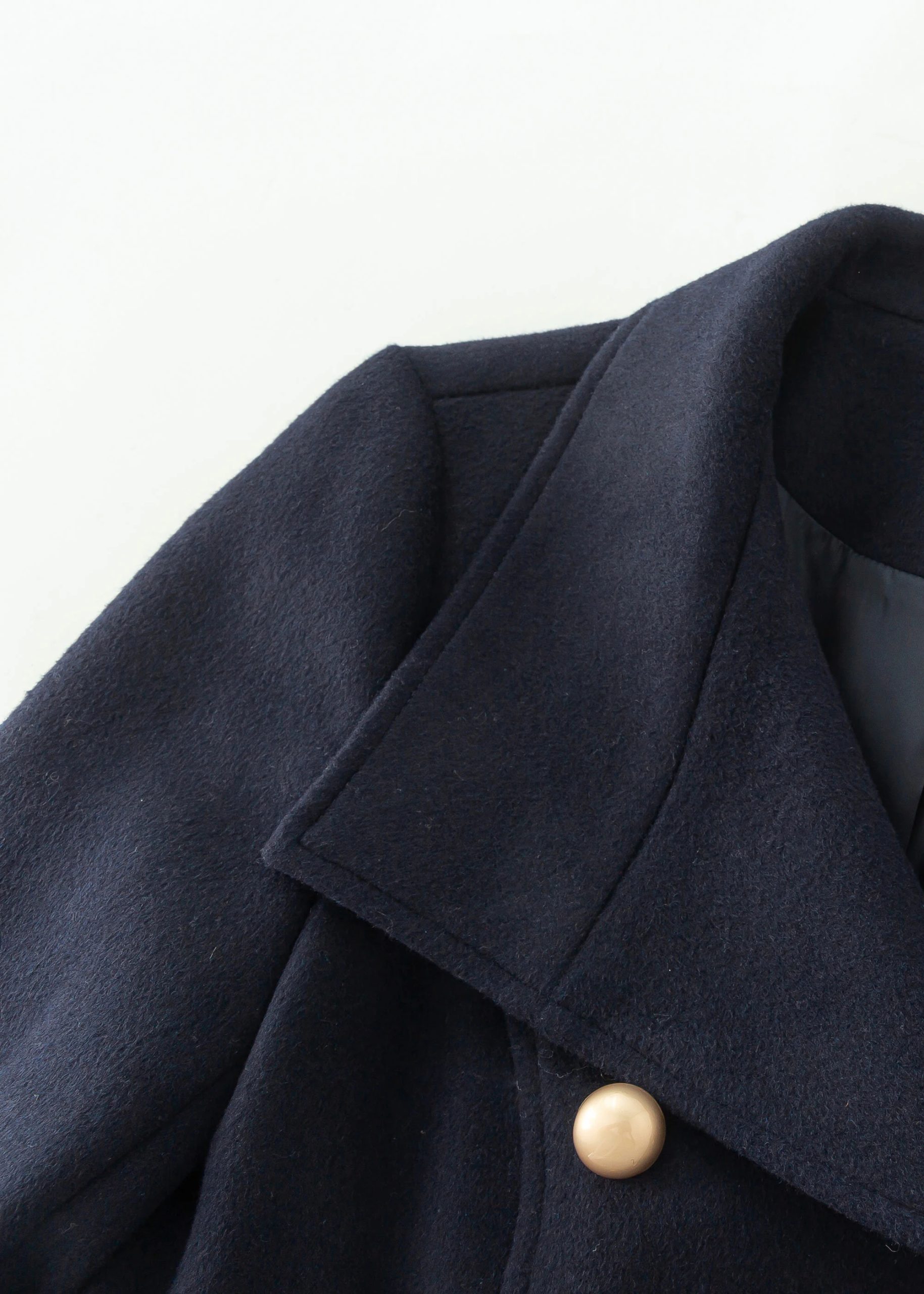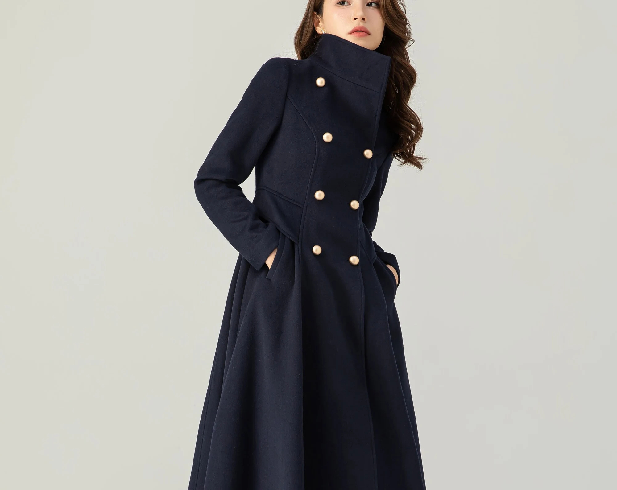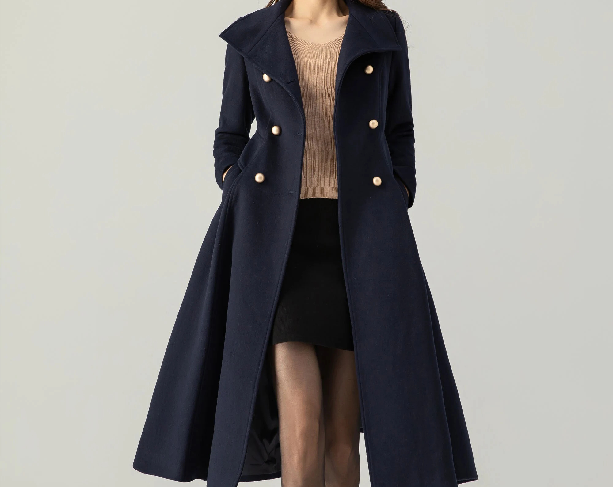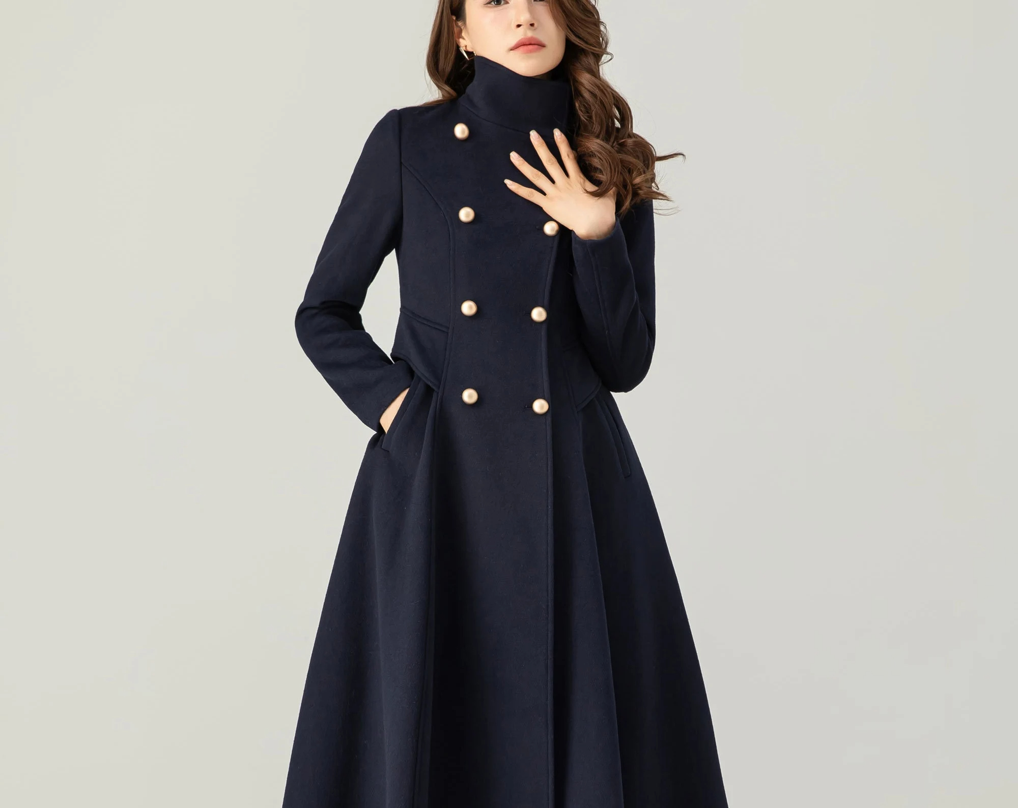 This elegant long coat in dark navy features a fitted and flared silhouette with a defined waist and an A-line hem. The corseted bodice features a sculptural high funnel neckline and double-breasted placket embellished with pearlescent buttons, adding a refined, vintage touch. Princess seams define the torso, while an inverted pleat at the center front creates a dynamic yet restrained look. Raglan sleeves maintain a streamlined silhouette, while strategically integrated side pockets maintain clean lines.