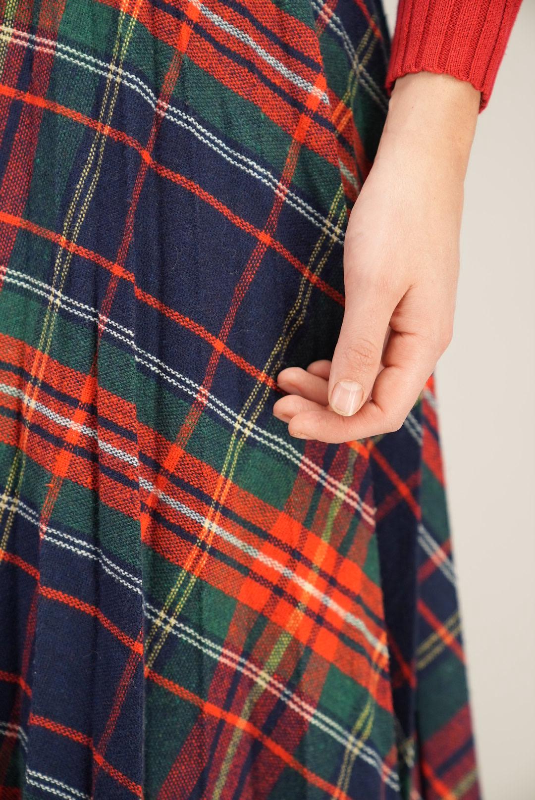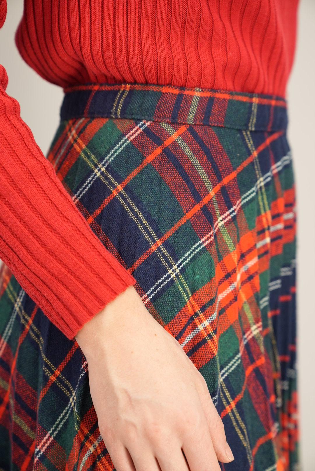 This skirt features a vivid tartan pattern in navy, red, green, and yellow, giving it a lively, heritage-inspired character. The high-waisted cut and all-over pleating create a full, swishy silhouette that moves beautifully with every step. It is an easy statement piece for autumn and winter, perfect for everyday outfits, festive occasions, or whenever you want a touch of classic plaid.