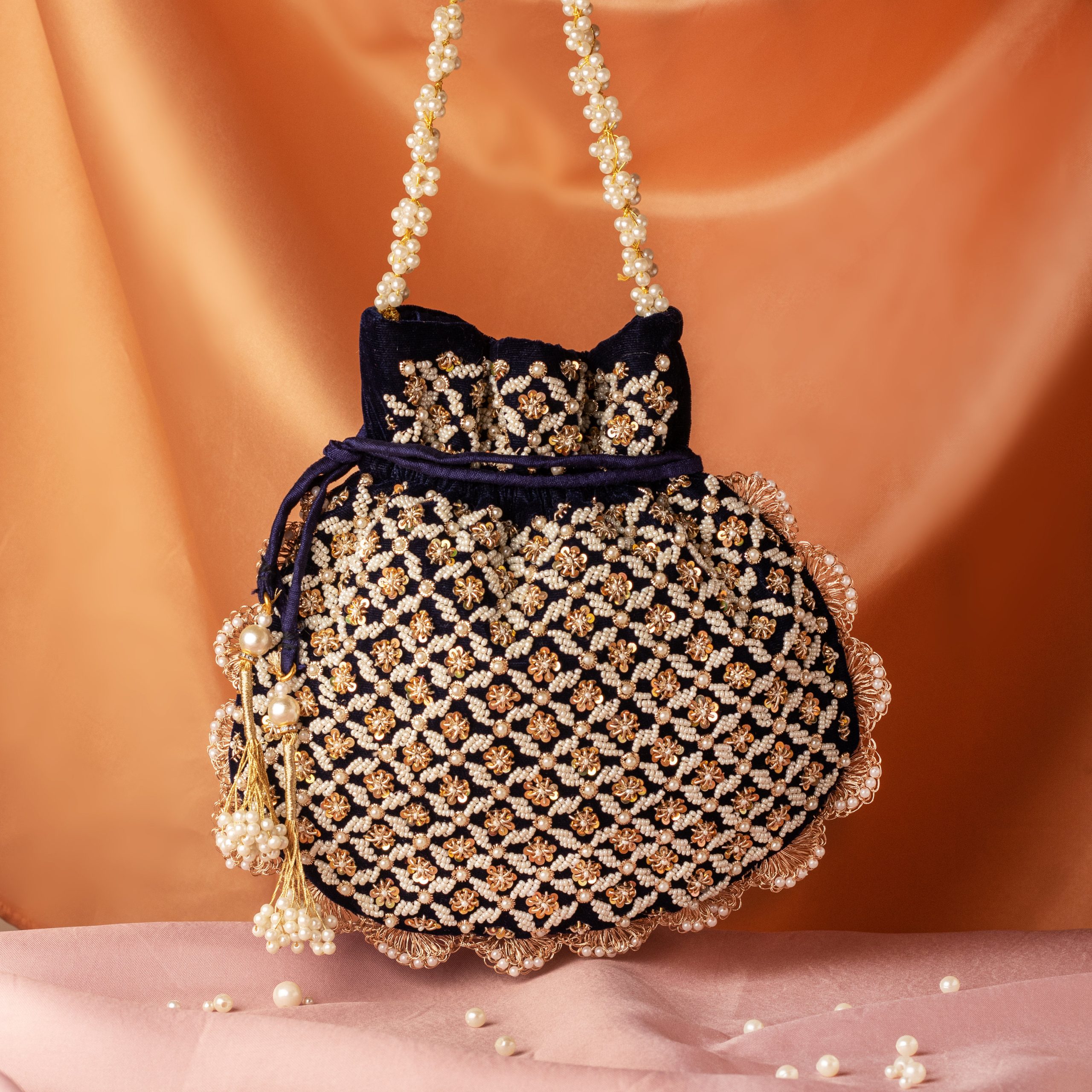 Plush navy velvet complements floral beading throughout this stunning Potli bag. A lattice pattern of gold beads and pearl flowers envelops the bag, adorned with scalloped beaded edges, pearl-beaded handles, and a tasseled drawstring—luxurious yet practical.