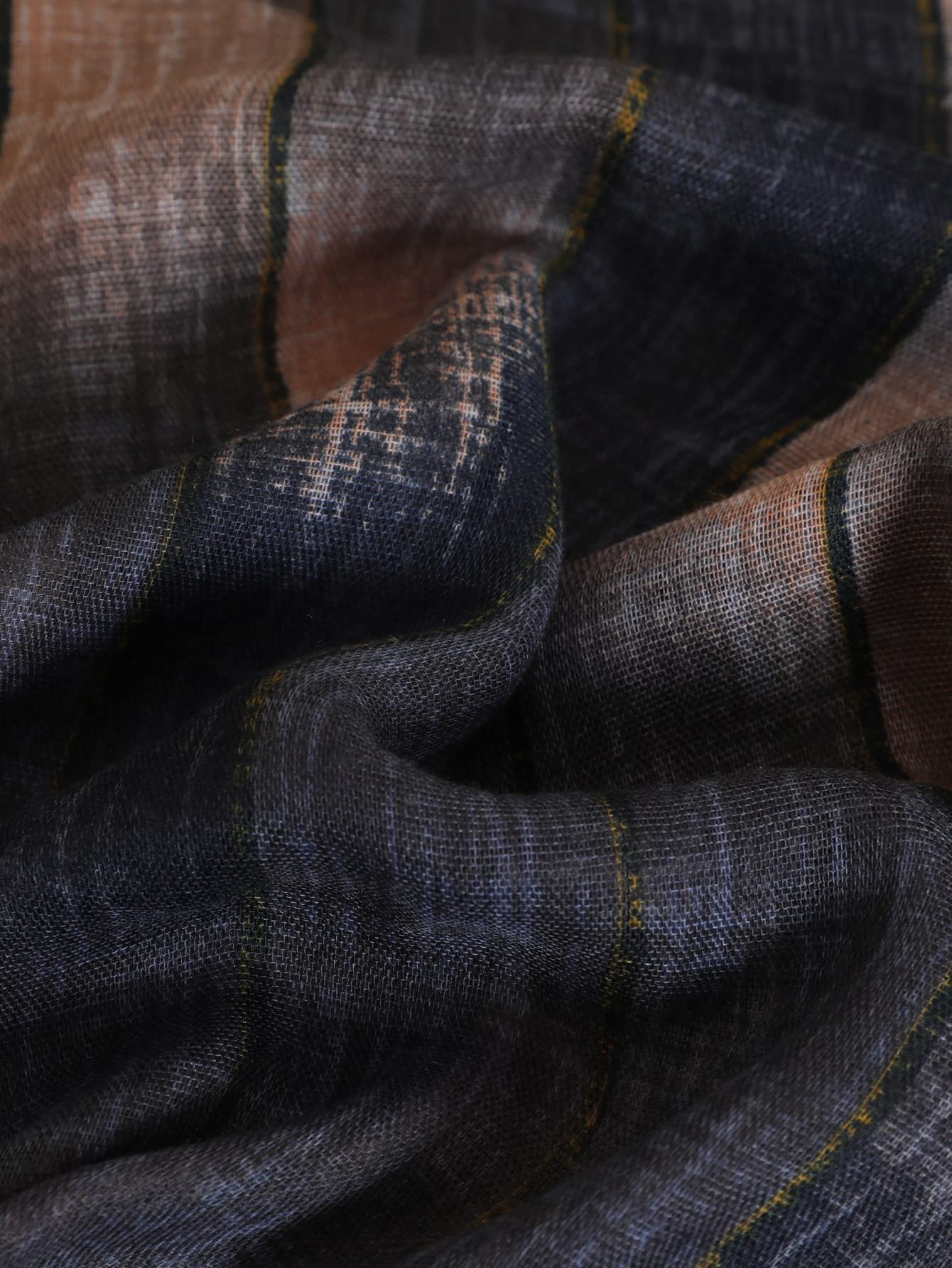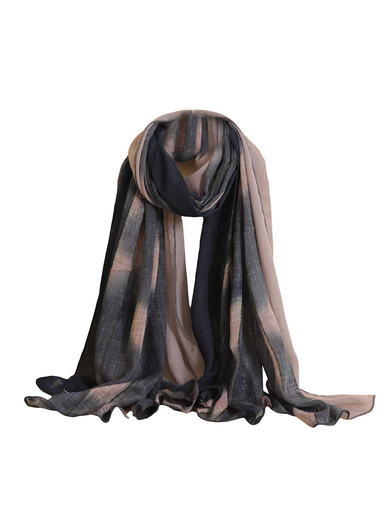 This soft, lightweight scarf drapes beautifully in a cleverly designed patchwork/gradient of taupe, beige, and charcoal gray, with a subtle sheen. Its lightweight yet versatile design adds understated sophistication to everyday outfits—easily complementing knitwear, blazers, t-shirts, and jeans.