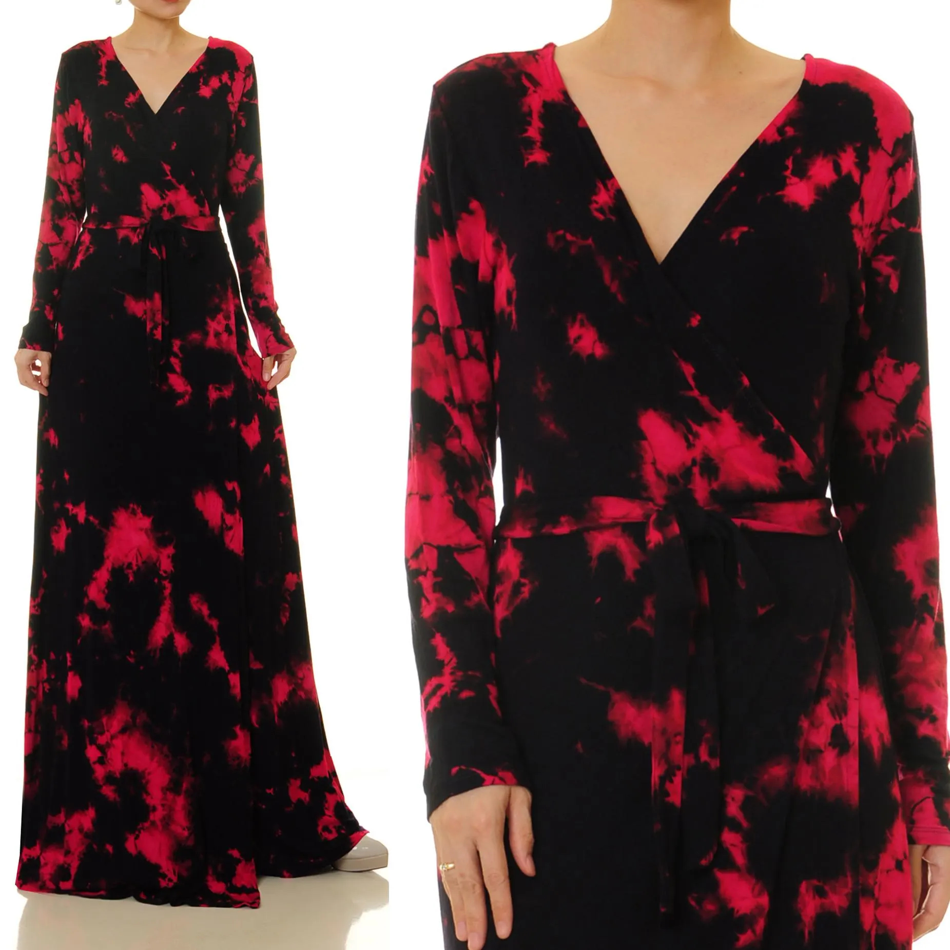 This maxi dress features a minimalist V-neck wrap structure, creating a slender silhouette, and a built-in waistband for custom fit. The interplay of red and black cloud dyes across the fabric creates a dialogue between night and flame. A center front slit enhances mobility and a sense of lightness, while the long A-line hem creates a flowing curve with every step. Simply tie it on for a stylish look, effortlessly transitioning from day to night.
