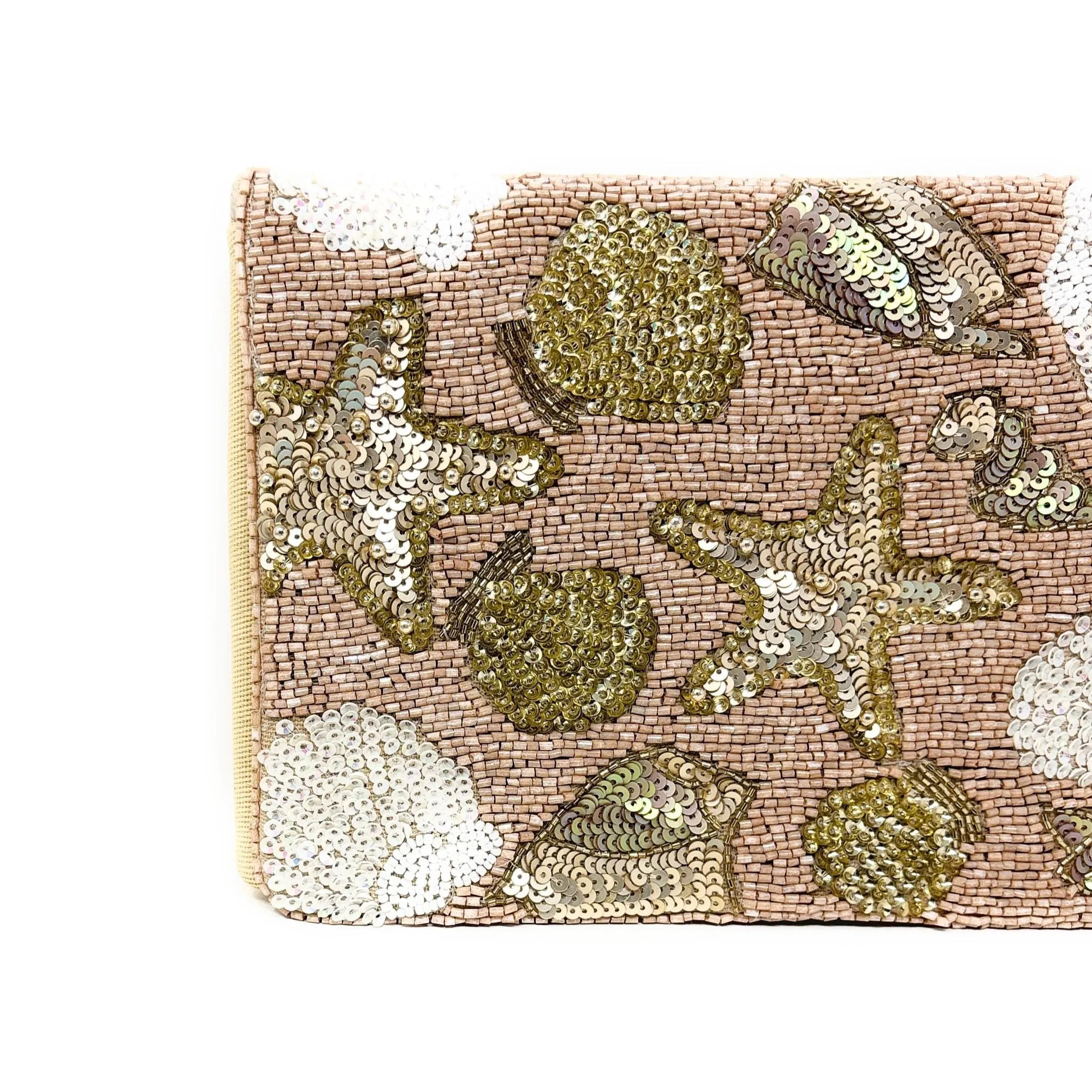 Beading and Marine Details: Selected champagne gold and beige glass beads are combined with iridescent sequins. Each marine element is meticulously handcrafted, each bead being individually crafted to perfectly replicate the three-dimensional texture of the starfish, the shimmering layers of shells, and the natural forms of the coral. Each bag features a variety of bead colors and sequins, with over 100 beads per centimeter, ensuring the fidelity of the marine life and a harmonious overall aesthetic.