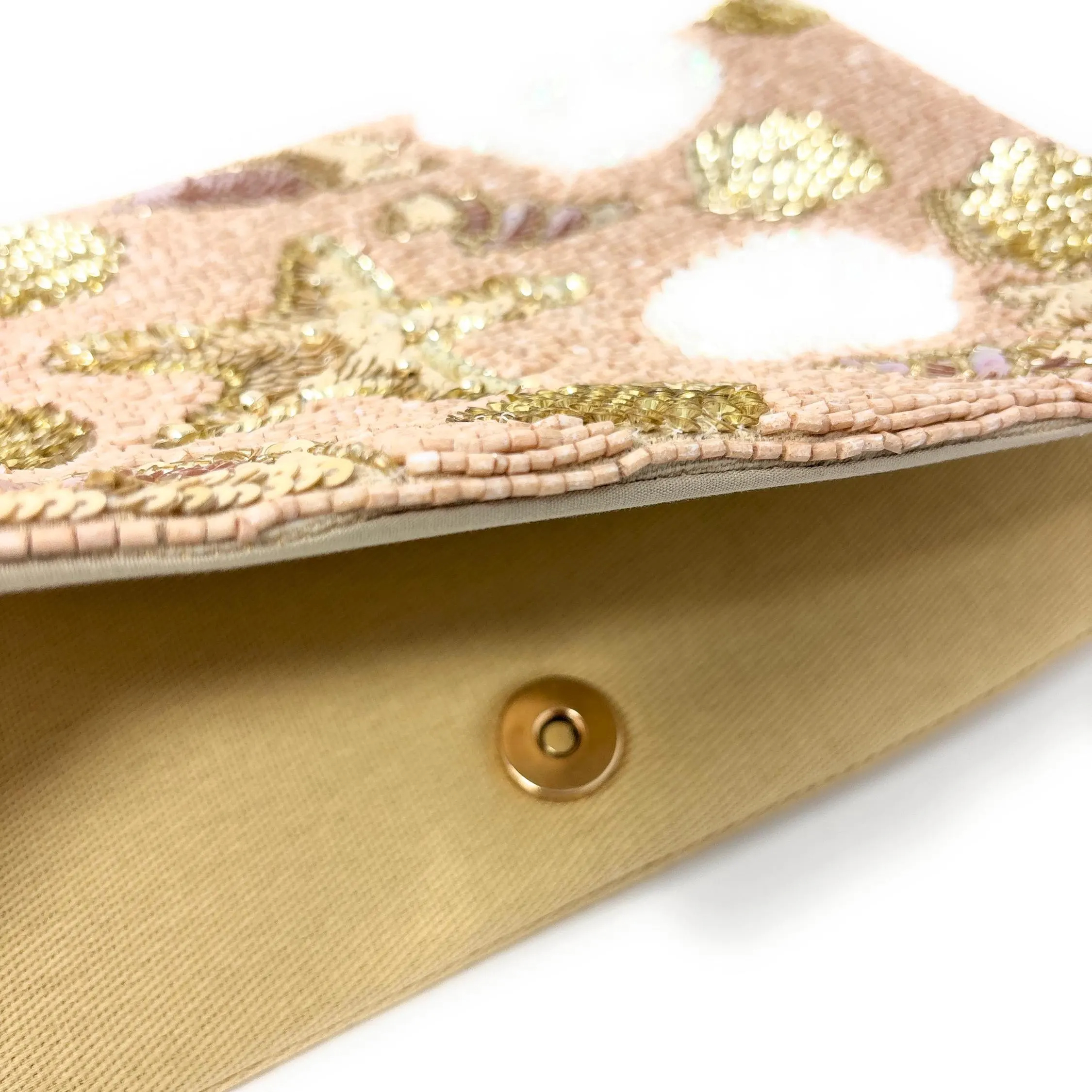 Inspired by the marine biome, this bag features a champagne gold base reminiscent of the warm sun on a beach. Gold and beige beads and sequins interweave to create marine elements such as starfish, shells, and coral, blending the romantic feel of a seaside getaway with vintage beading craftsmanship. Perfect for island getaways and summer parties, this bag is a “traveling seaside escape” for ocean enthusiasts and retro style aficionados, seemingly encapsulating the treasures of a golden beach within its body.
