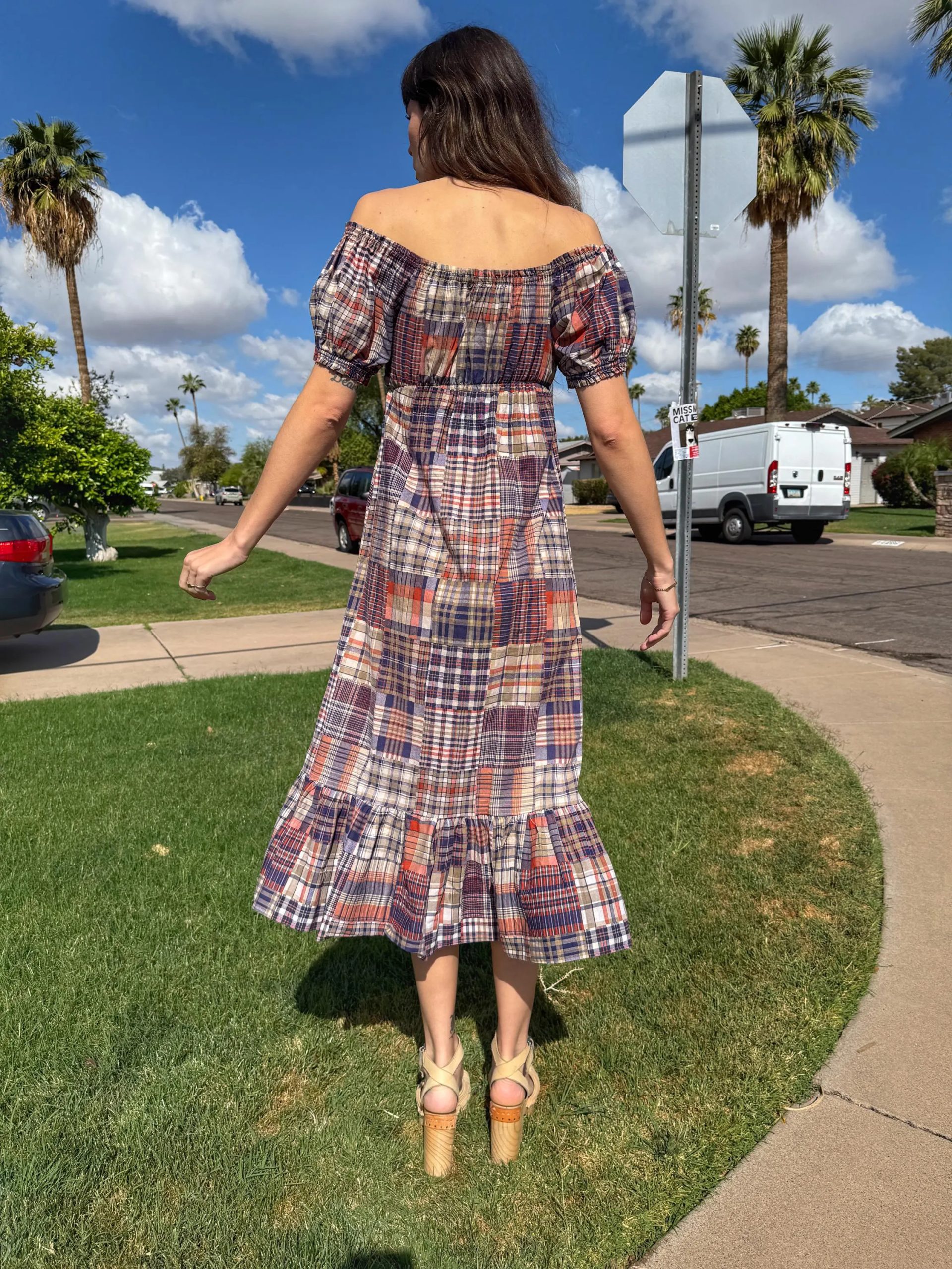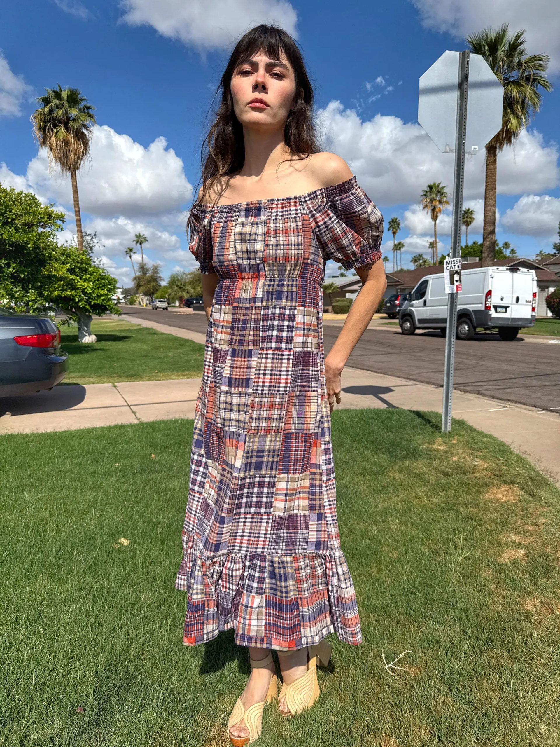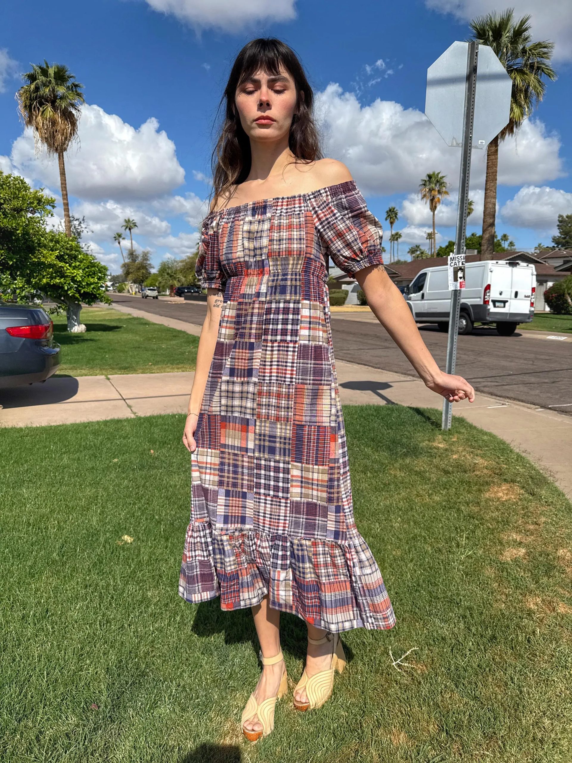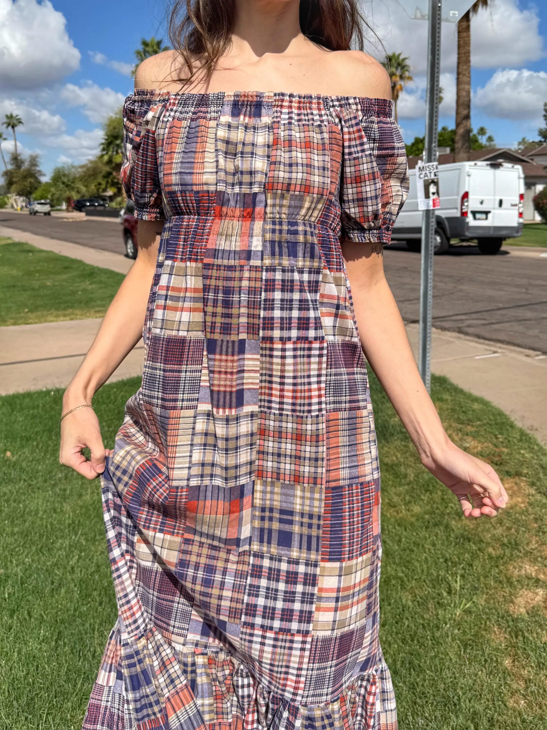 Pattern and color scheme: Patchwork Madras plaid (burgundy/orange/navy/off-white, etc.), retro and vibrant, photogenic and flattering.