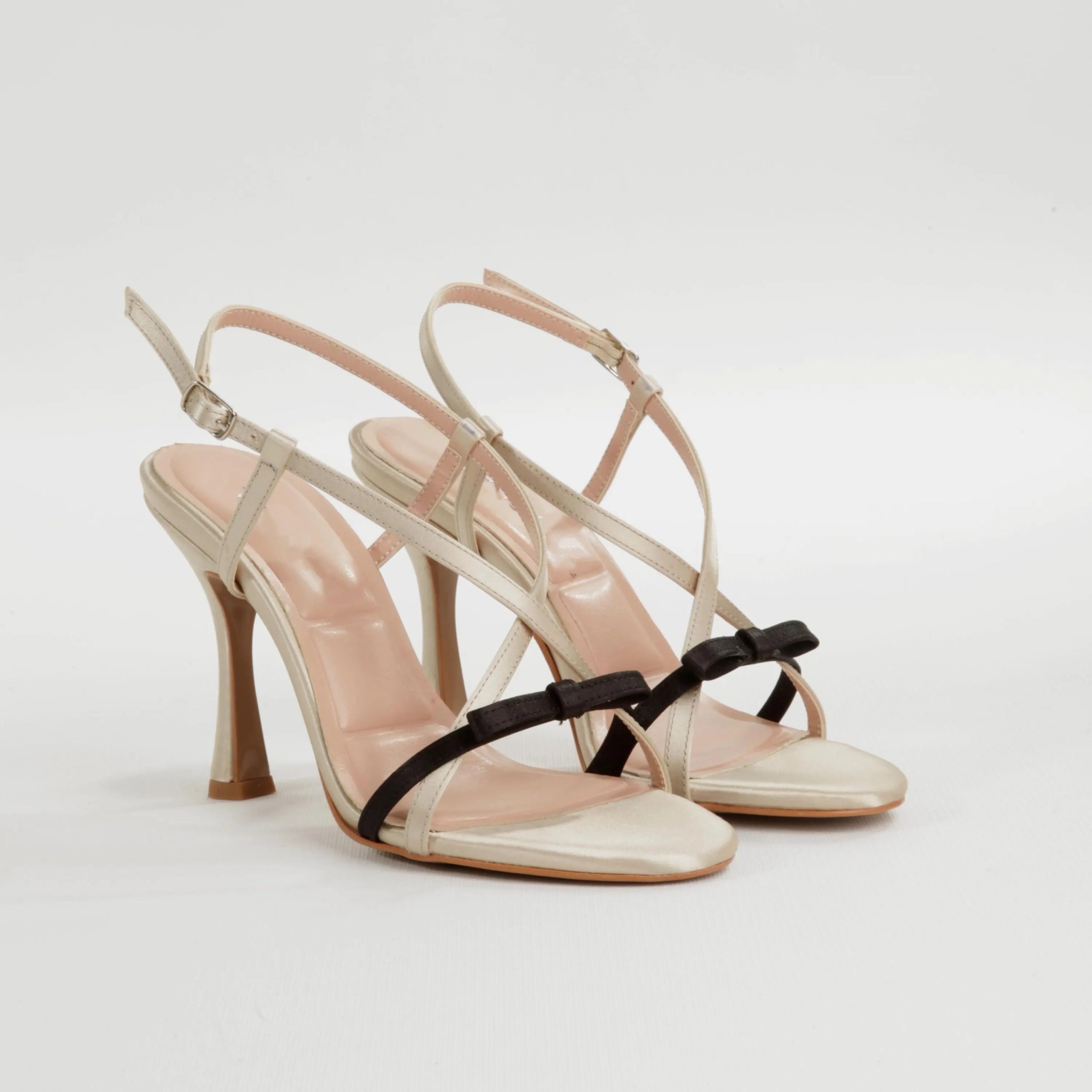 These off-white and black strappy stiletto open-toe sandals are a minimalist yet sophisticated piece that blends mature elegance with a touch of color-blocking sophistication. The soft off-white base is accented with black straps creating a striking crisscross design, while a black bow embellishment adds a touch of understated elegance. Whether for a professional workday, a luxurious gathering, or a romantic date, these sandals effortlessly elevate any outfit, making you the elegant focal point of your look.