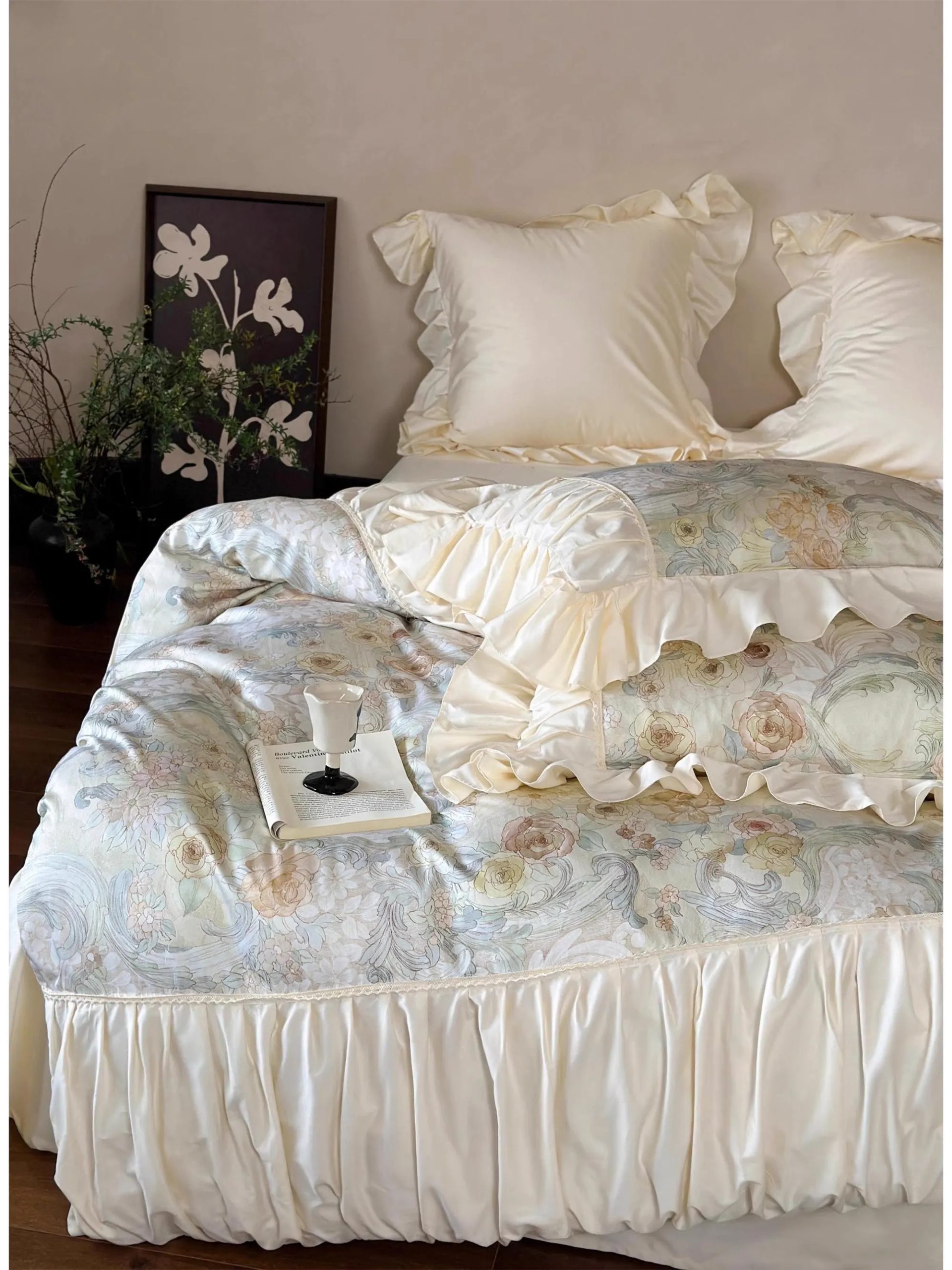 This elegant ensemble blends the luxurious retro charm of a French court with the artistic texture of floral oil paintings. Centered around a large, vintage floral print, it features satin-like sheen and layered ruffles, creating an artistic space reminiscent of an 18th-century aristocratic chamber. Every floral brushstroke and fold evokes the rituals of aristocratic life, transforming sleep into an immersive artistic aesthetic experience.