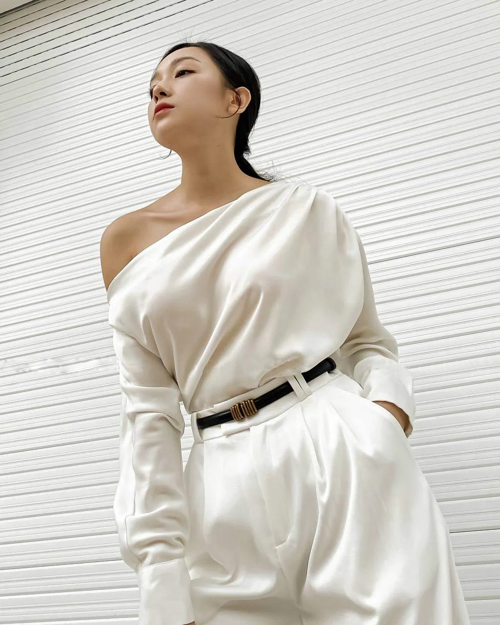 This one-shoulder satin blouse boasts sleek lines and a modern, stylish look, effortlessly creating a captivating silhouette. The smooth, lightweight satin fabric hugs the body, while the asymmetrical neckline accentuates the collarbone and shoulders, showcasing feminine grace. The relaxed, draped fit, paired with fitted long sleeves and button-down cuffs, perfectly balances softness and structure, making it an ideal choice for evening outings, special occasions, or sophisticated everyday wear.