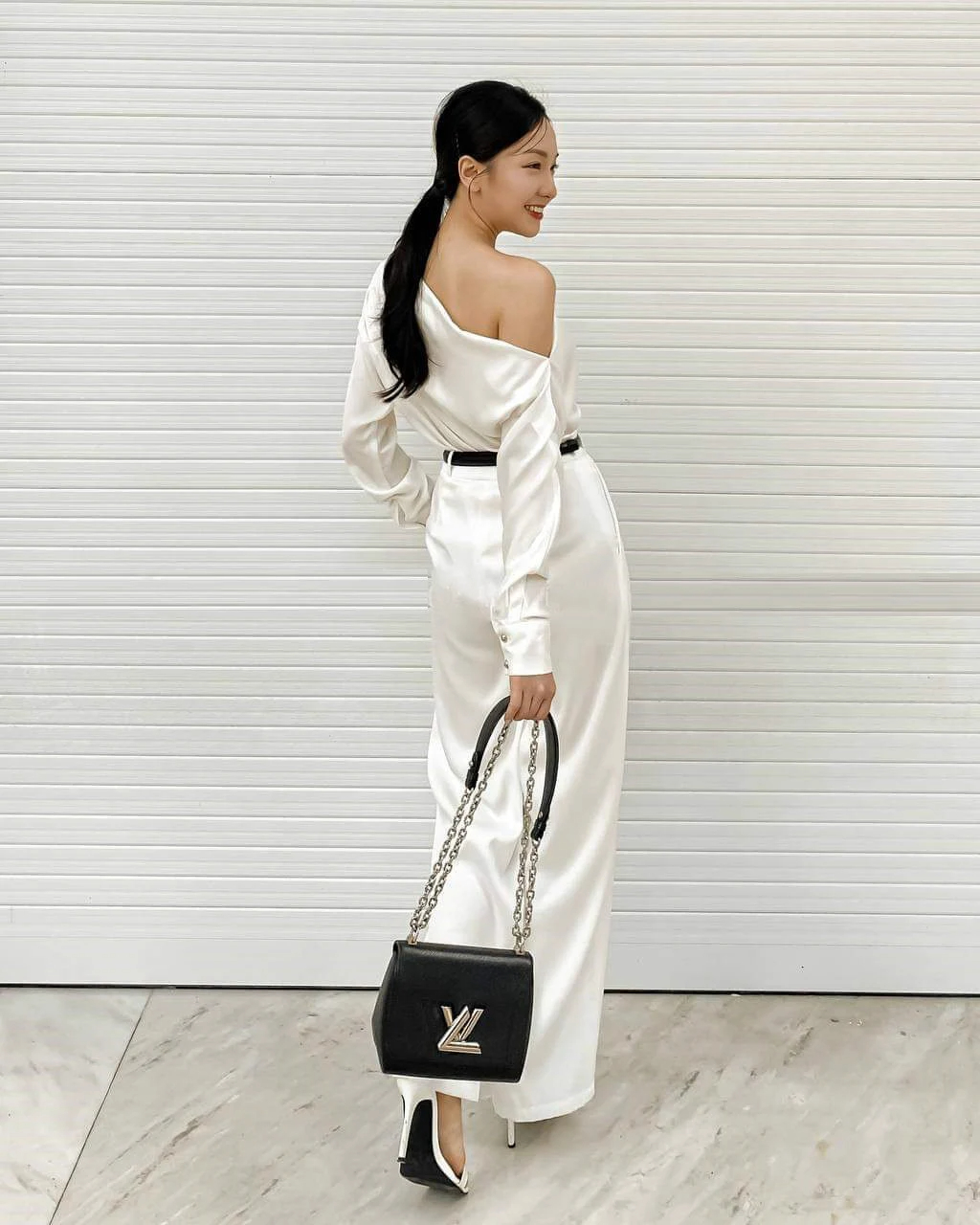 Add a delicate belt to accentuate the waistline and create a perfect monochromatic look