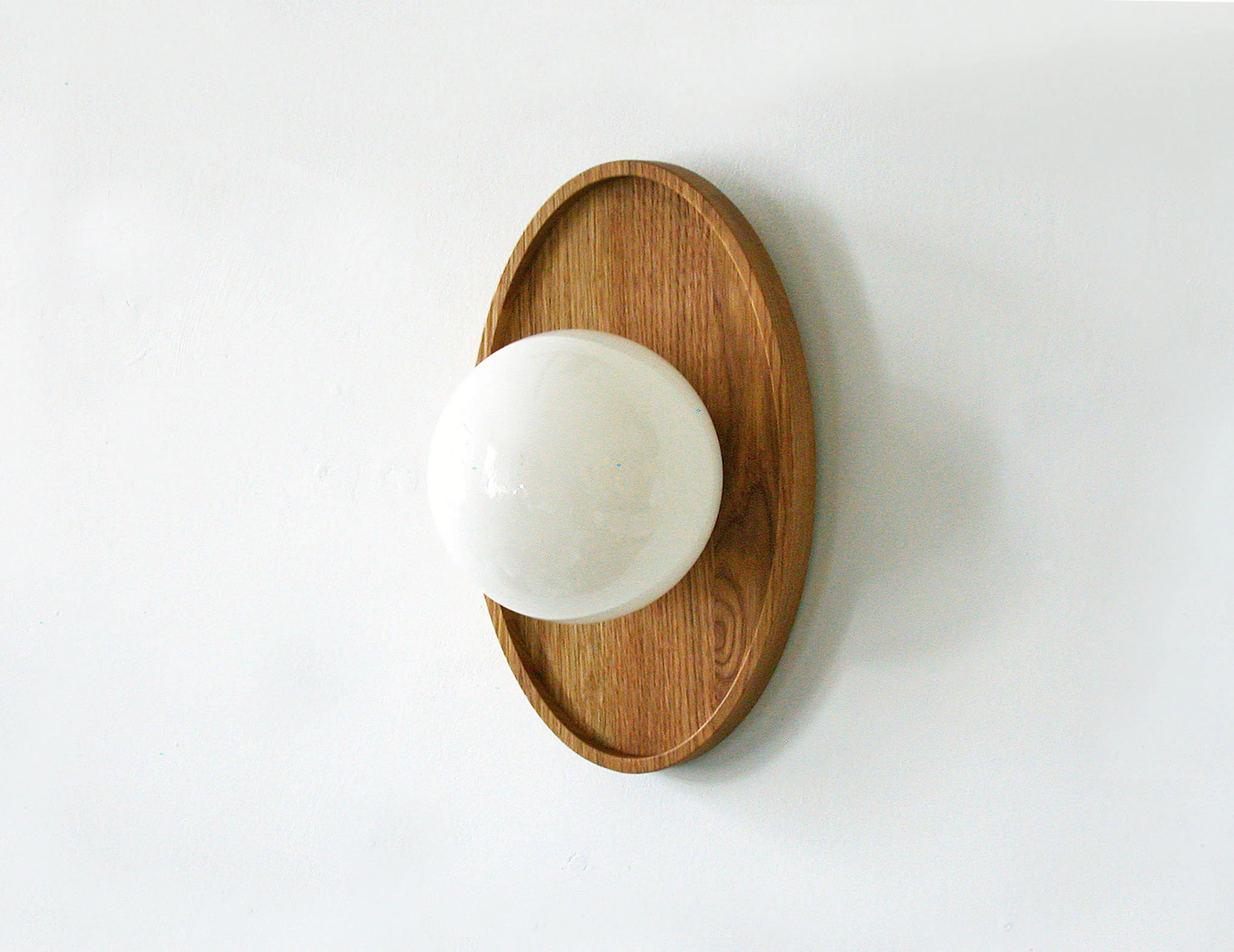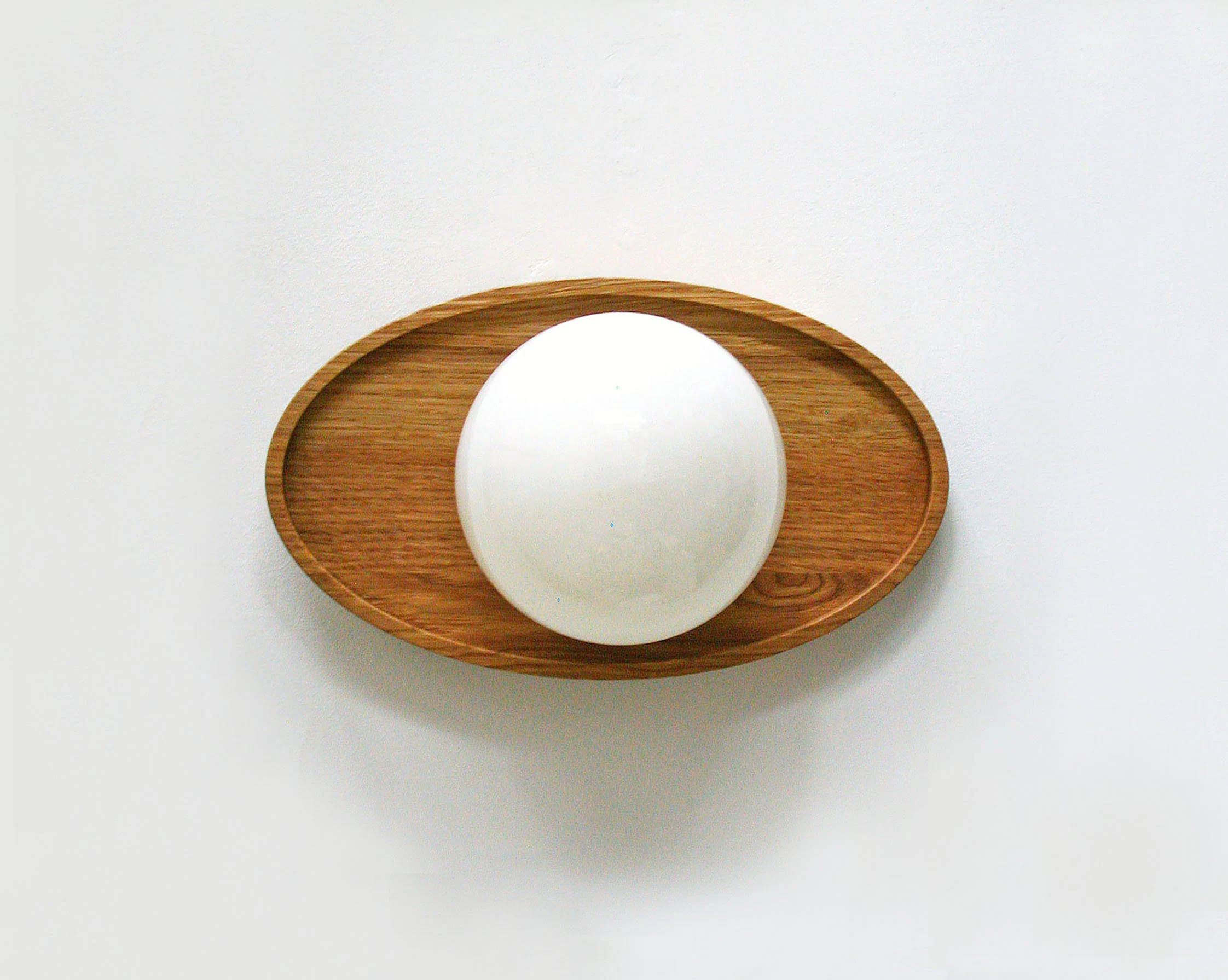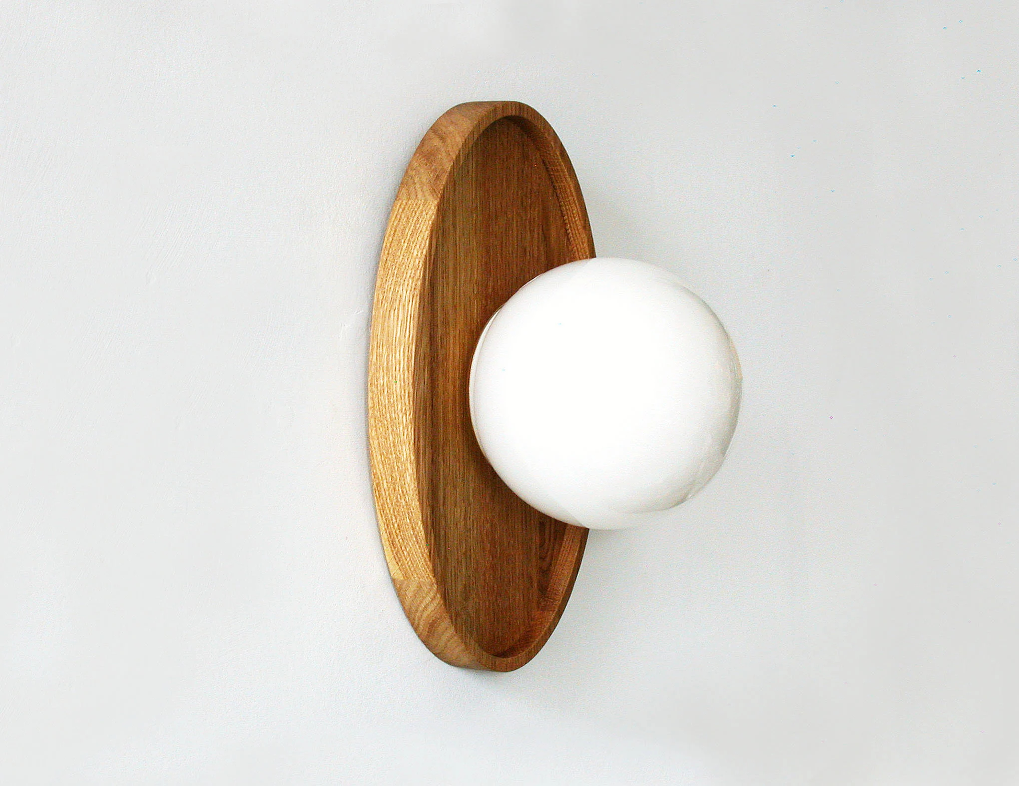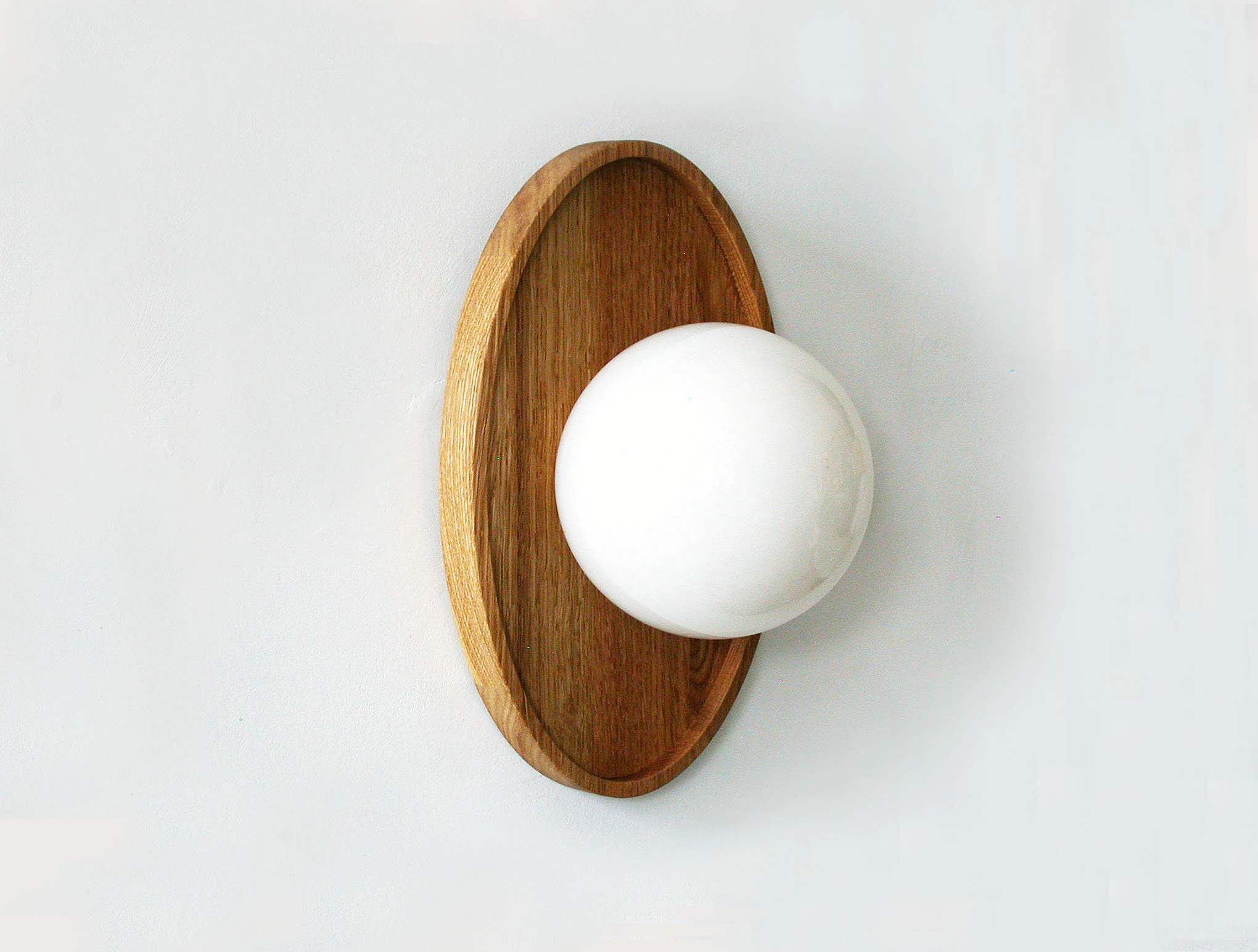 — A slender oval wooden back panel paired with an opaline glass globe creates a soft, glare-free diffused effect.
