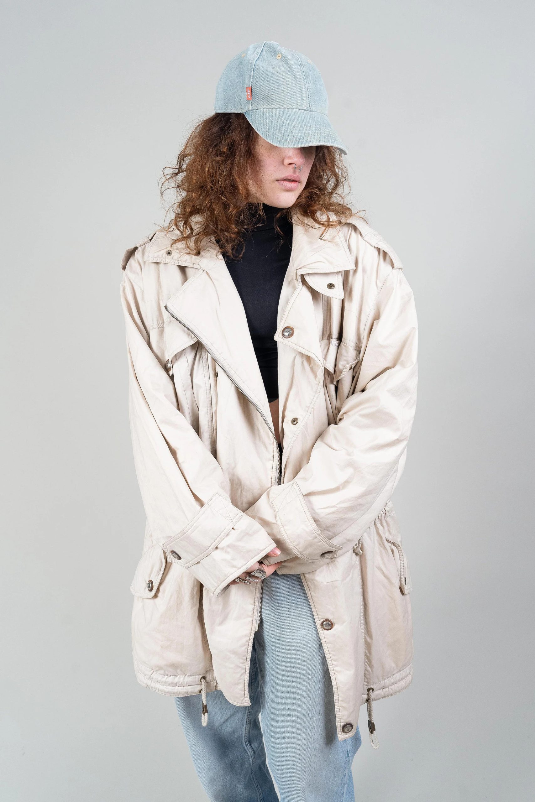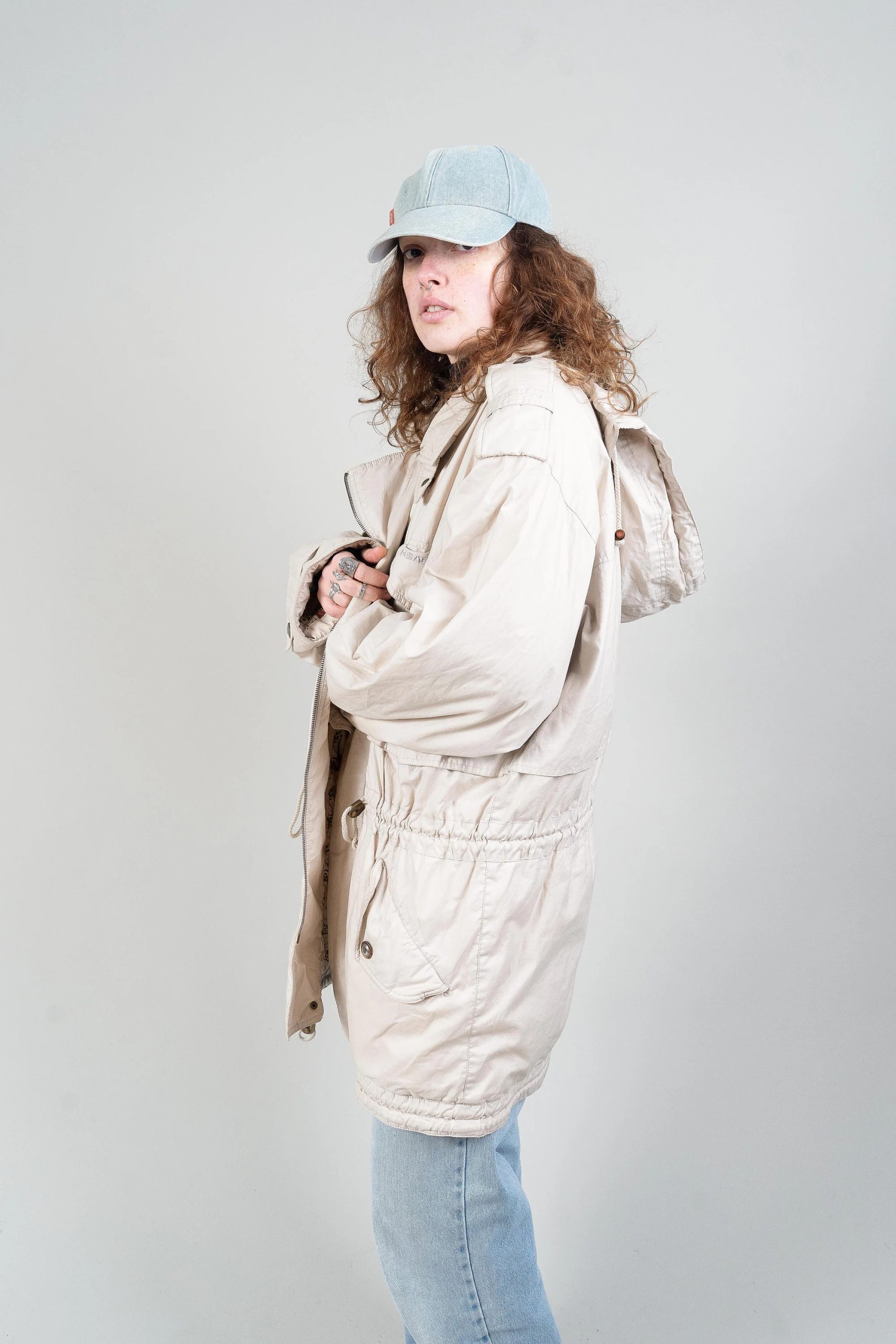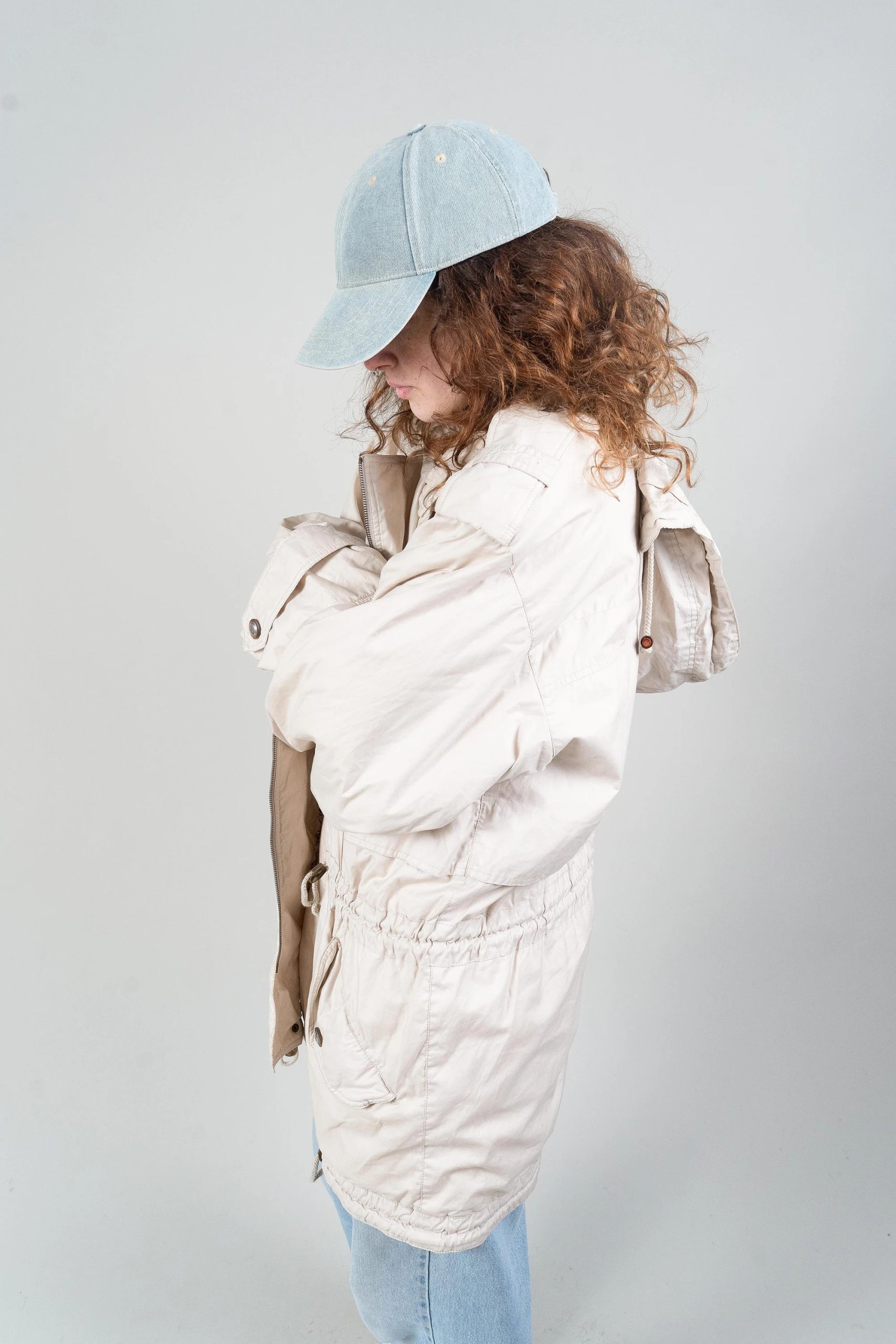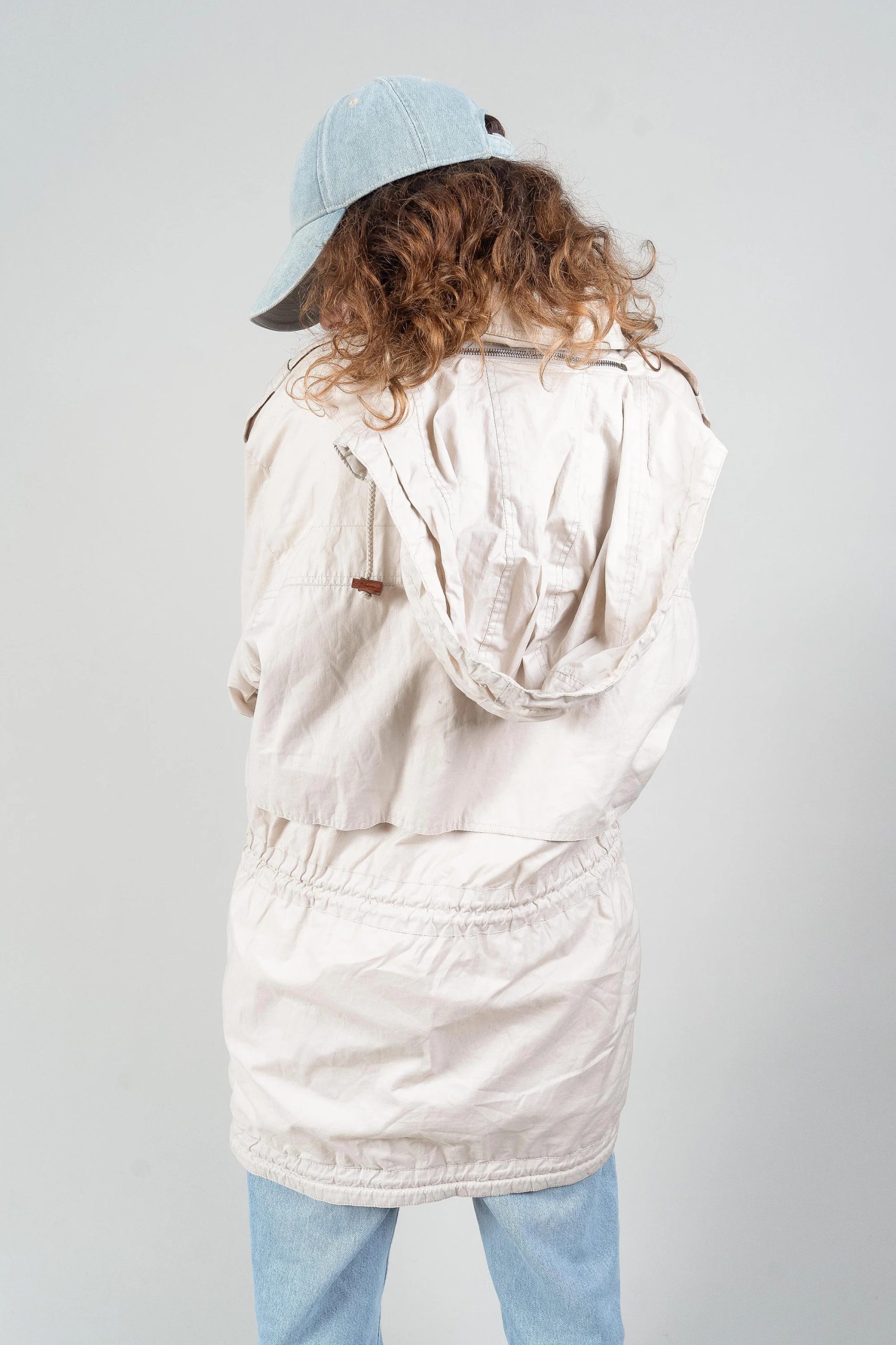 This comfortable and versatile parka is crafted from a soft, distressed off-white fabric with a relaxed drape for a casual yet stylish look. The simple snap-button placket and asymmetrical zipper at the front provide effective wind protection while adding a touch of individuality. A high neck flatters the face, and adjustable straps at the cuffs help lock in warmth. Two large flap pockets keep hands warm and securely store personal items. Drawstrings on the inside and at the hem allow for a fitted waist or a relaxed silhouette. Easily paired with knitwear, hoodies, or jeans—ideal for casual days, travel, and transitional seasons.