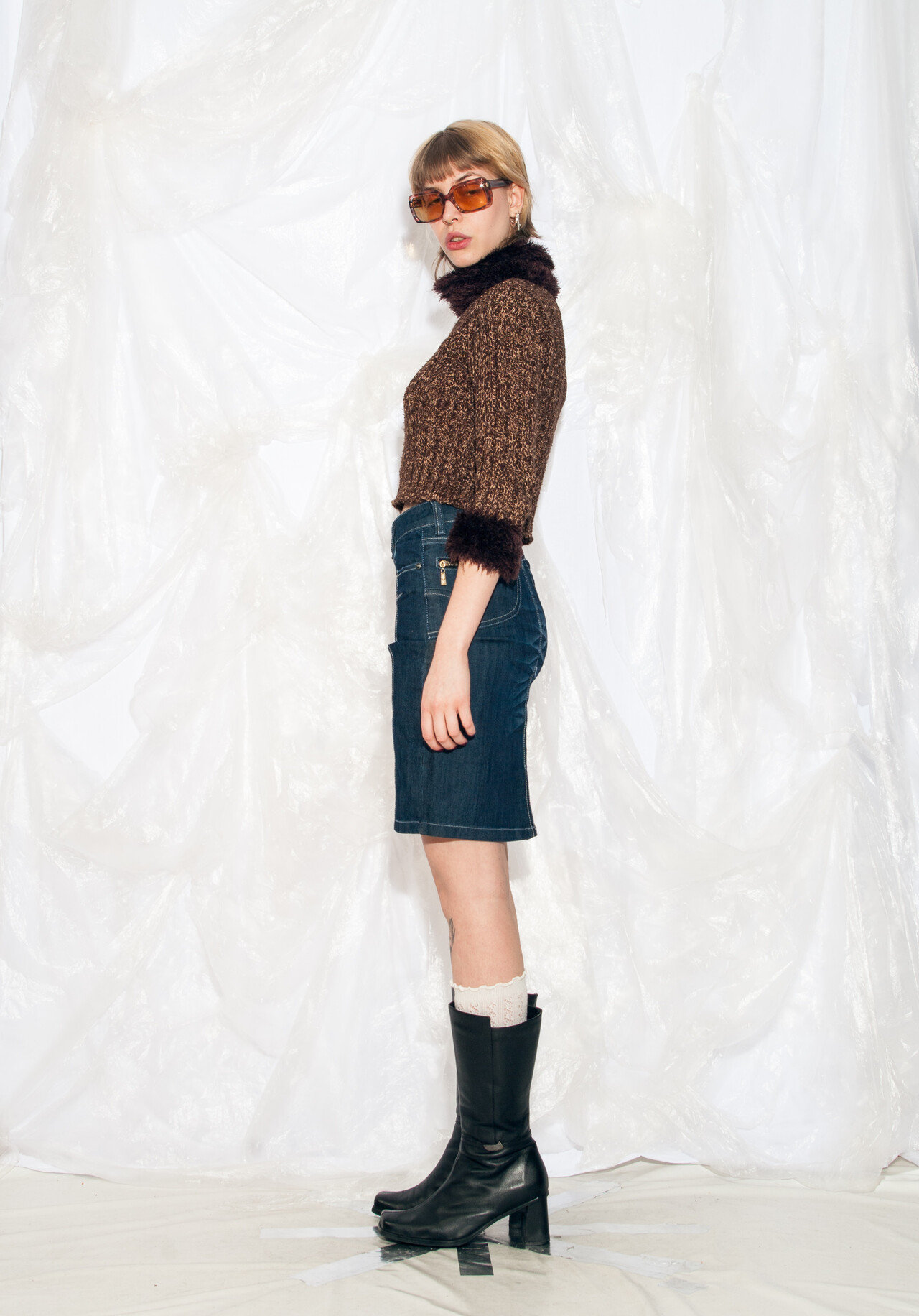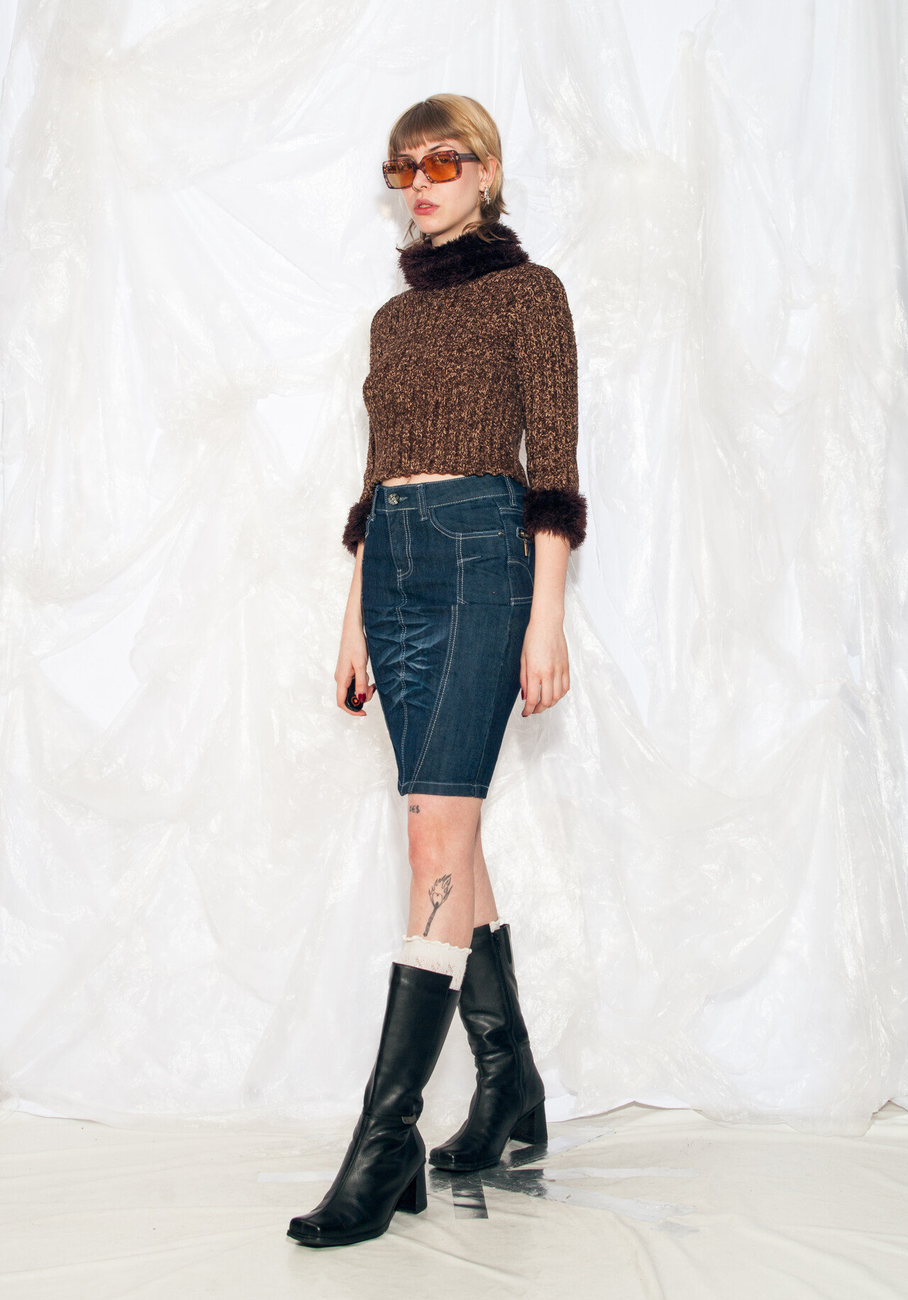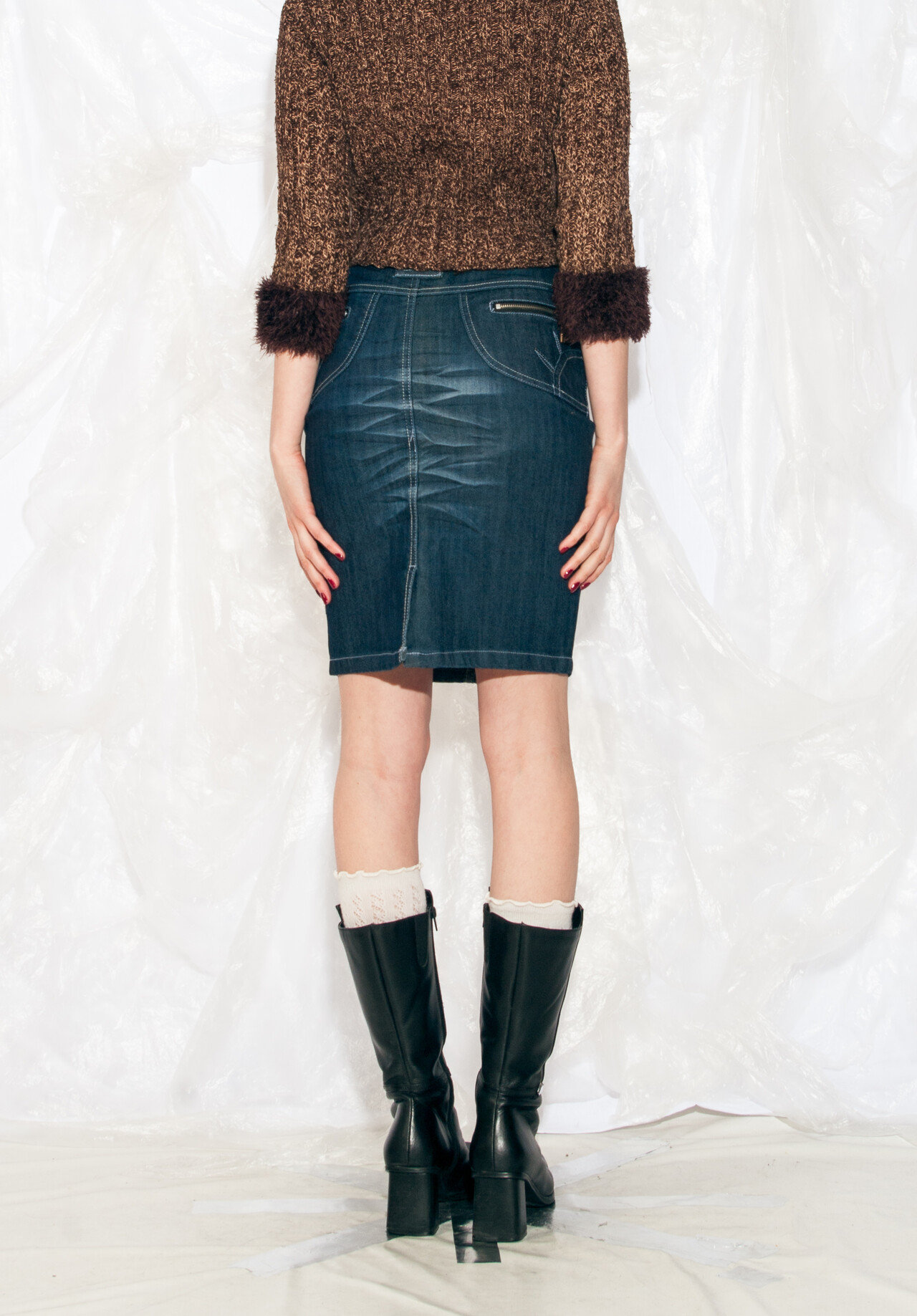 This urban, sophisticated pencil skirt is crafted from deep indigo denim. Contoured seams and crisp, contrasting topstitching create a clean silhouette from waist to hem, while subtle whiskering adds a worn-in feel. Easily styled for both formal and casual wear.