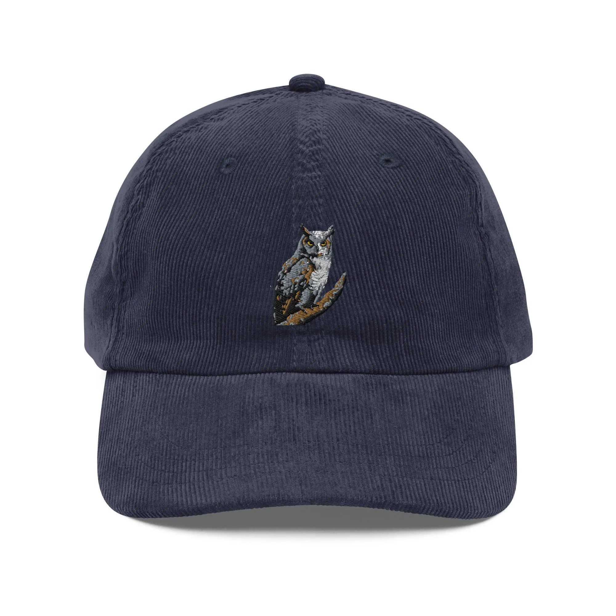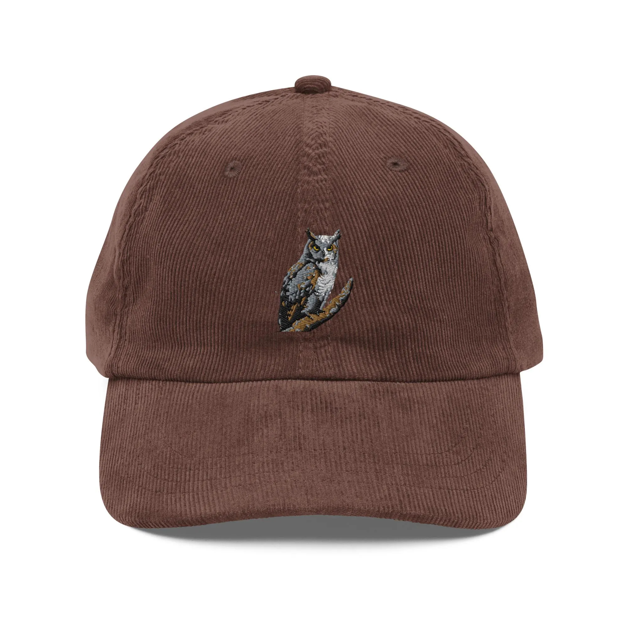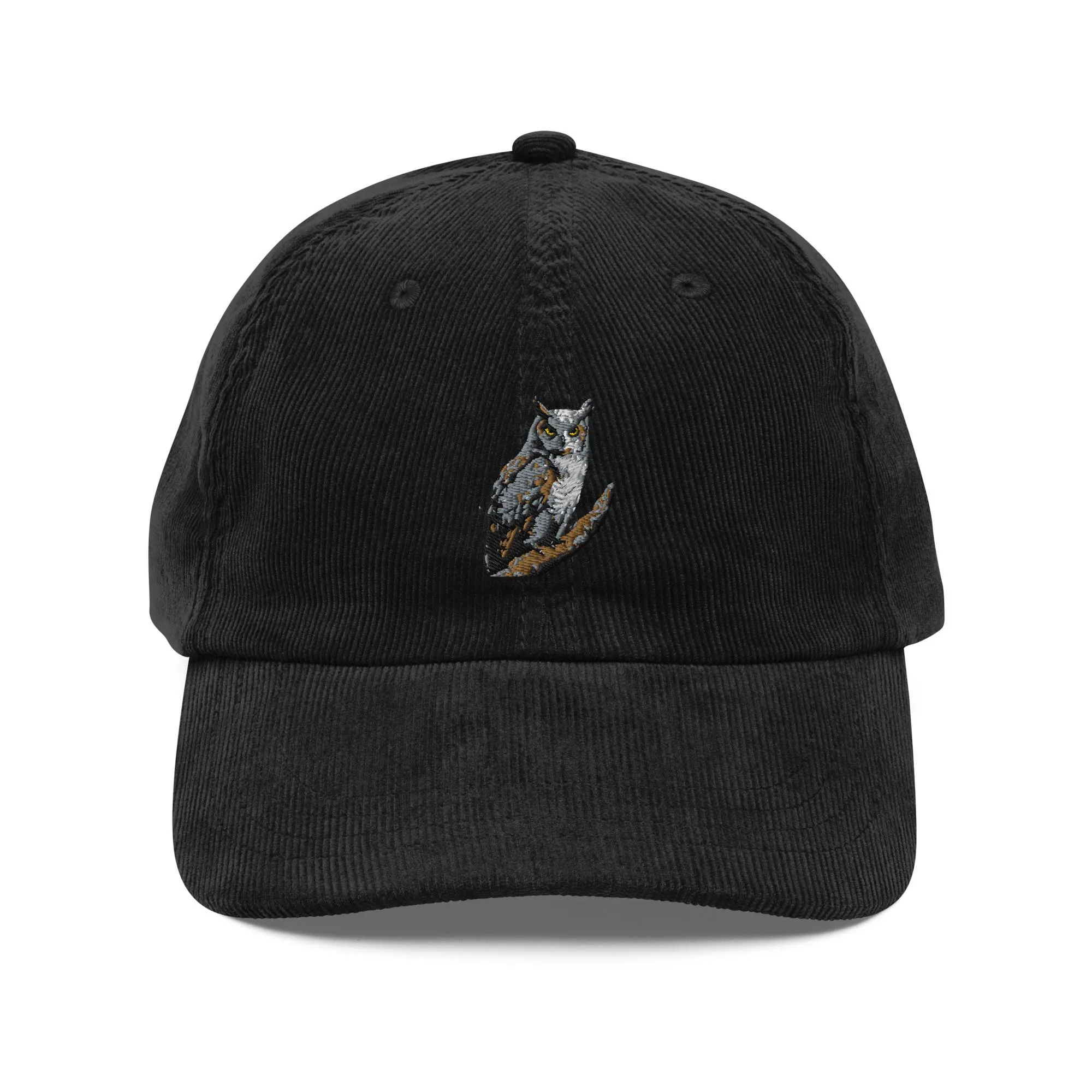 This hat features a lifelike embroidered owl, perched on a branch, its deep grey, warm brown, and bright yellow eyes giving it a vibrant life. This exquisite embroidery adds a touch of mysterious nature to the hat, making it a subtle yet versatile and eye-catching accessory. The soft black corduroy fabric exudes a vintage charm, suitable for everyday wear in any season.