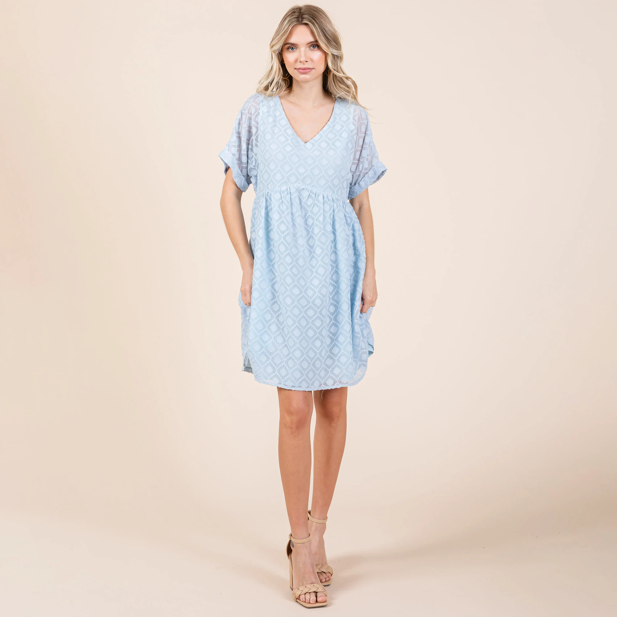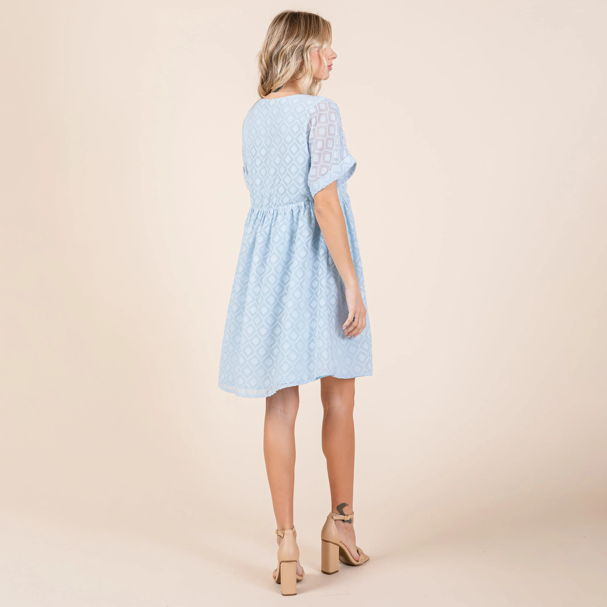Drape: The jacquard chiffon fabric has a subtle drape, allowing the babydoll skirt to flow naturally, creating a “cloud-like” effect as you walk, without the “cheap, frizzy” feel.
