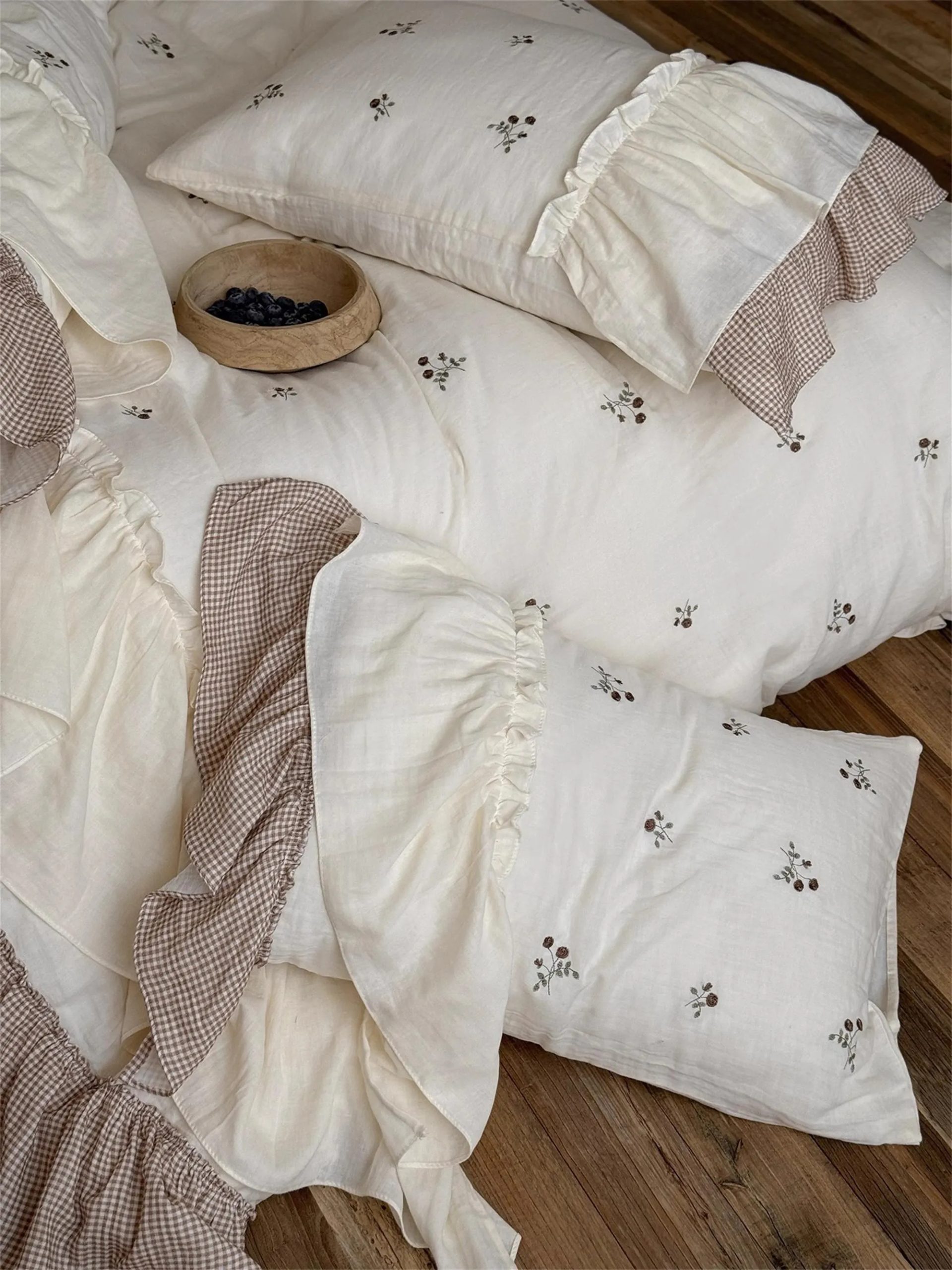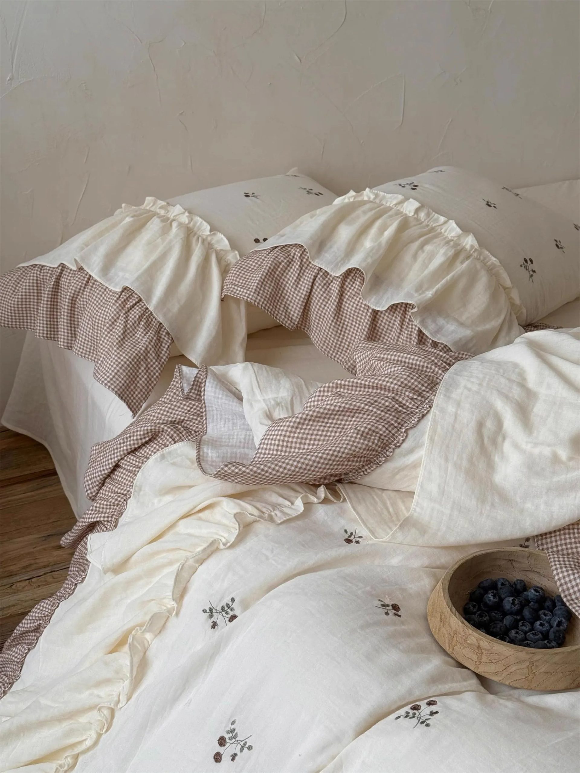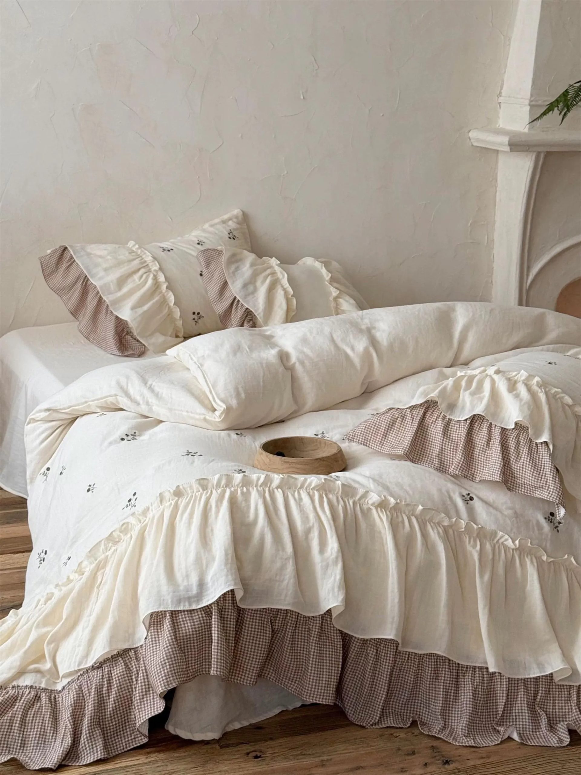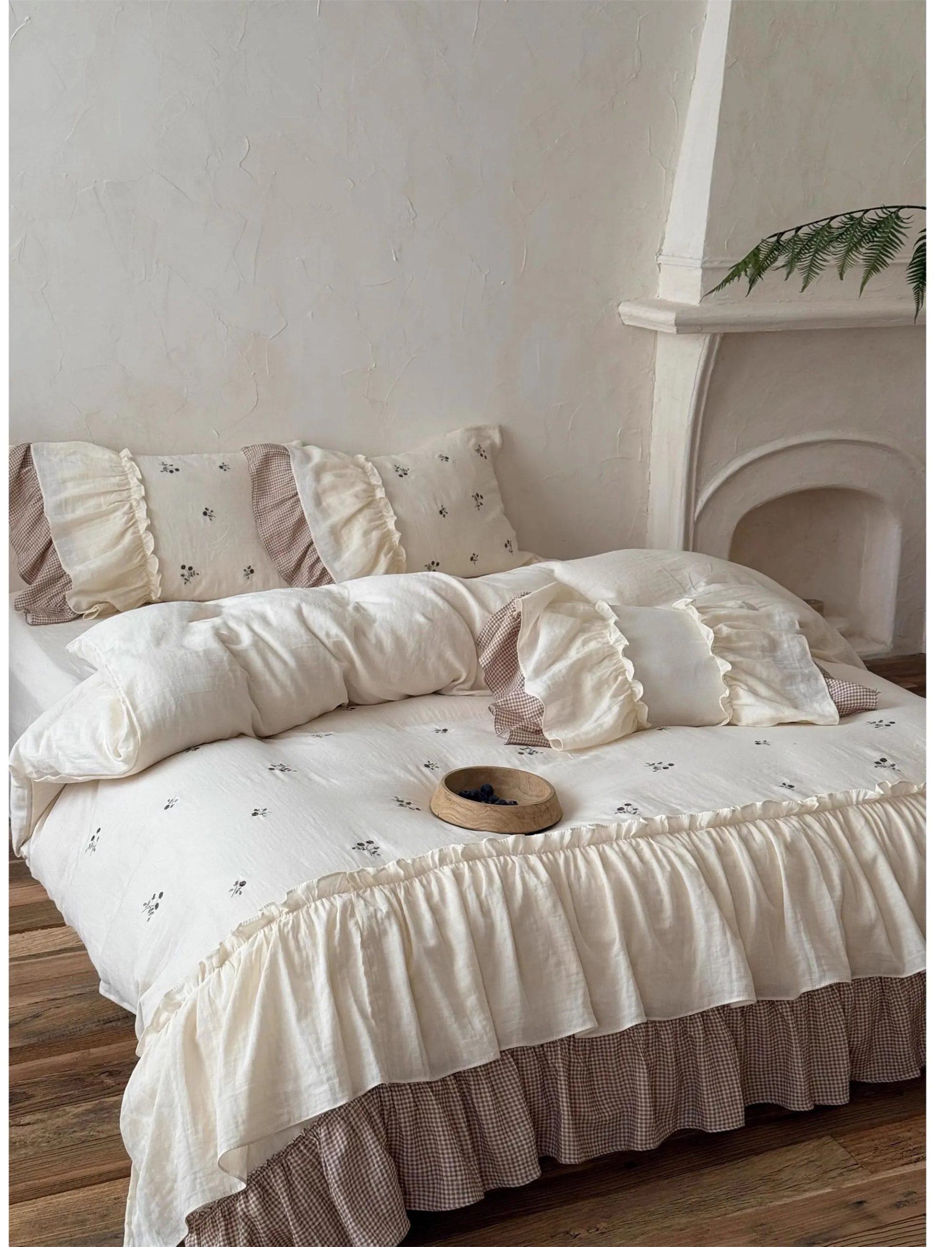 Combining the rustic, relaxed feel of Japanese countryside with the refined details of French country living, this off-white cotton and linen base is accented with brown plaid panels and layered ruffles, creating a cozy space reminiscent of a country cabin. Each plaid, ruffle, and floral embroidery evokes the relaxing rituals of natural life, transforming sleep into an immersive, pastoral retreat.