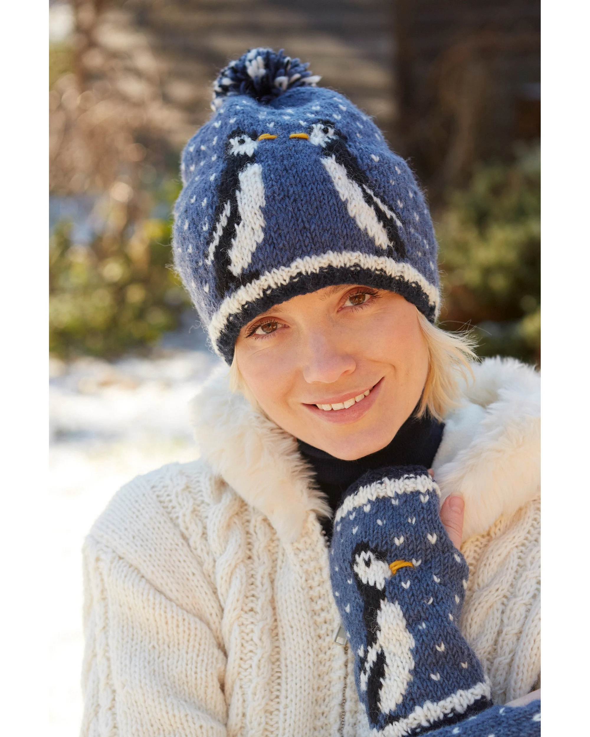 This comfortable navy blue knit beanie features a falling “snowflake” pattern, adorable penguins facing each other on either side of the brim, and a mixed-color pom-pom on top. Full of playful winter charm, warm and soft, it’s the perfect choice for chilly weather.