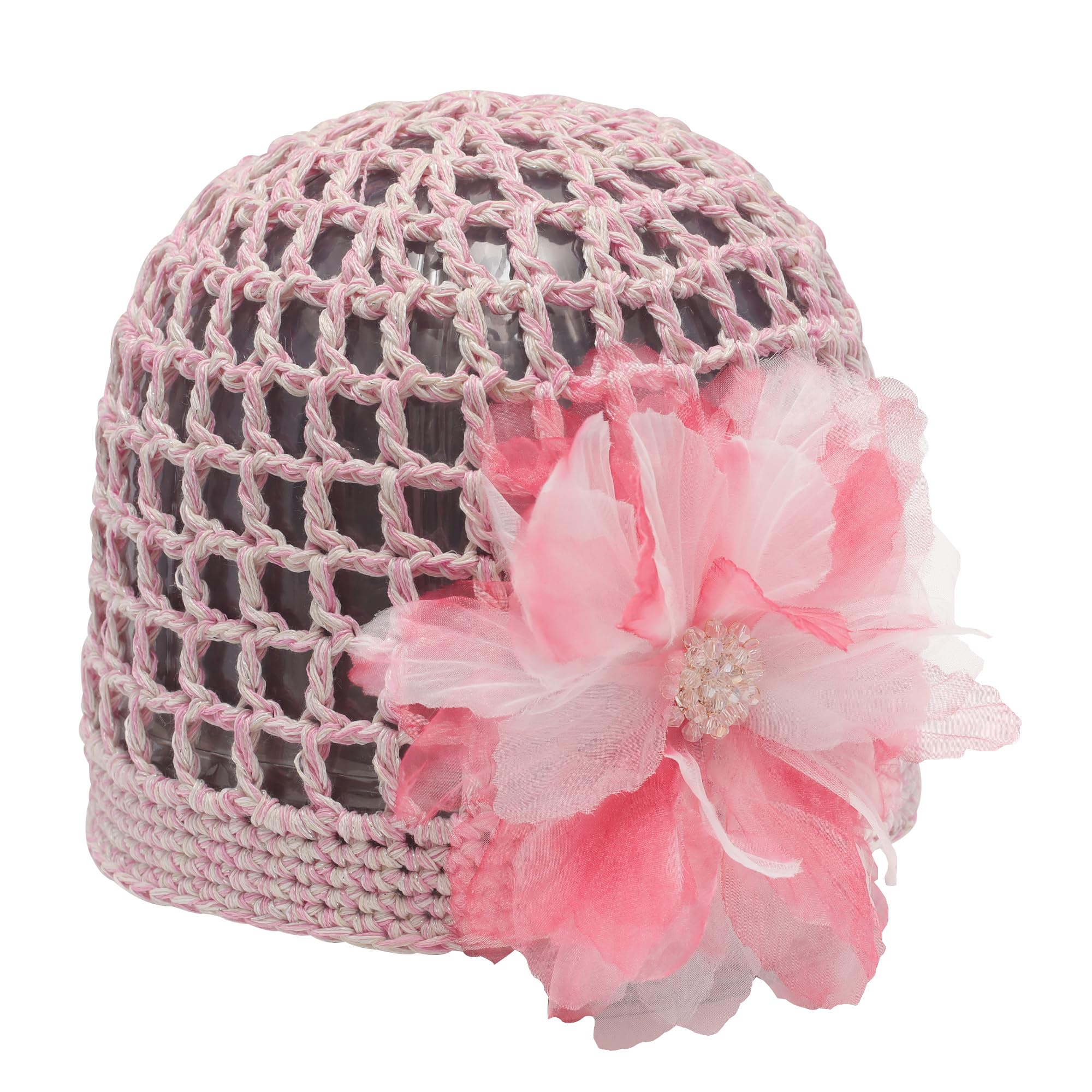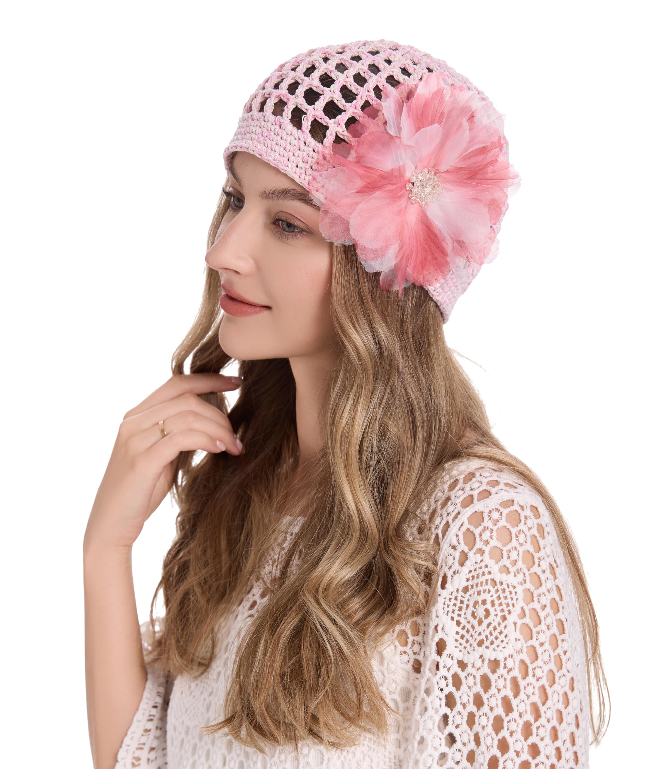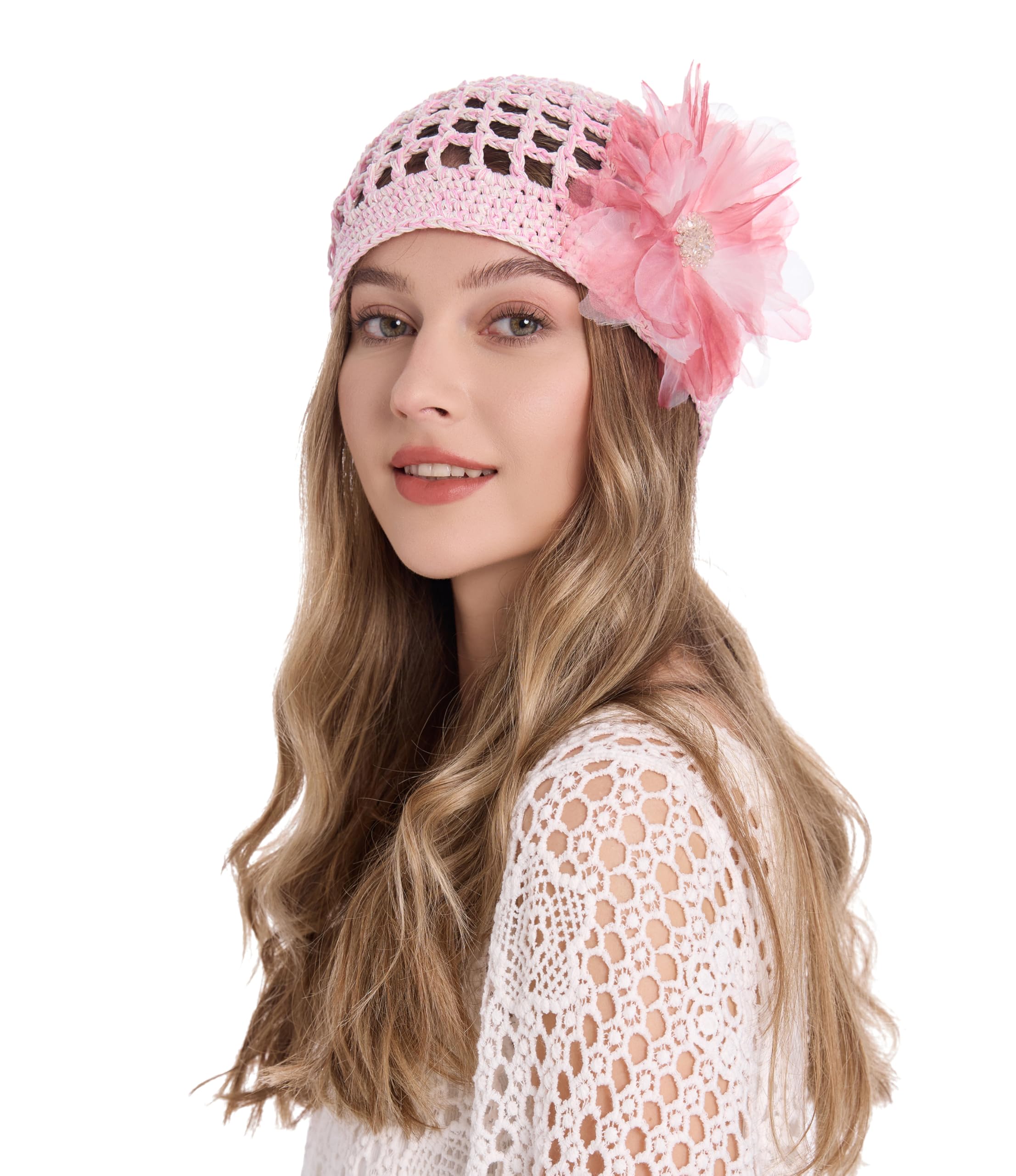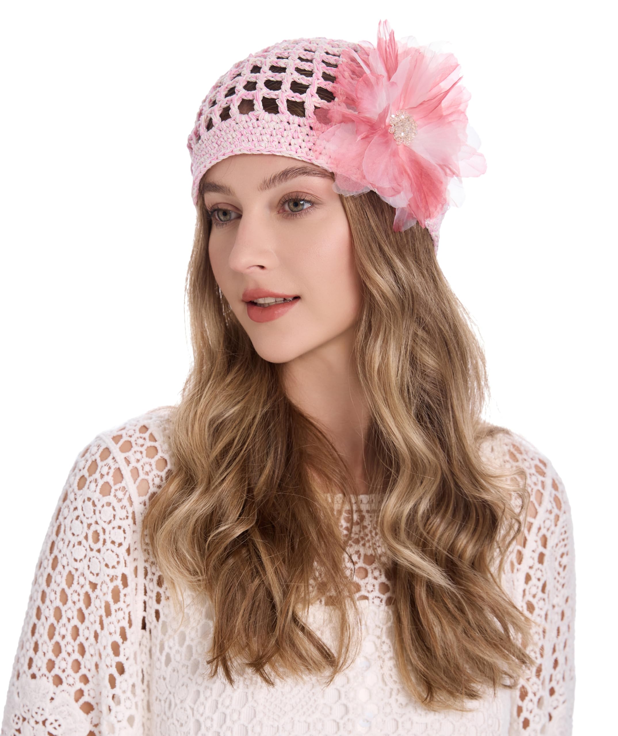 This pink crochet hat is soft, romantic, and eye-catching. The top features an openwork design, while the sides are adorned with delicate chiffon flowers. The delicate petals and shimmering stamens give the hat a feminine and elegant feel, while remaining lightweight and comfortable.