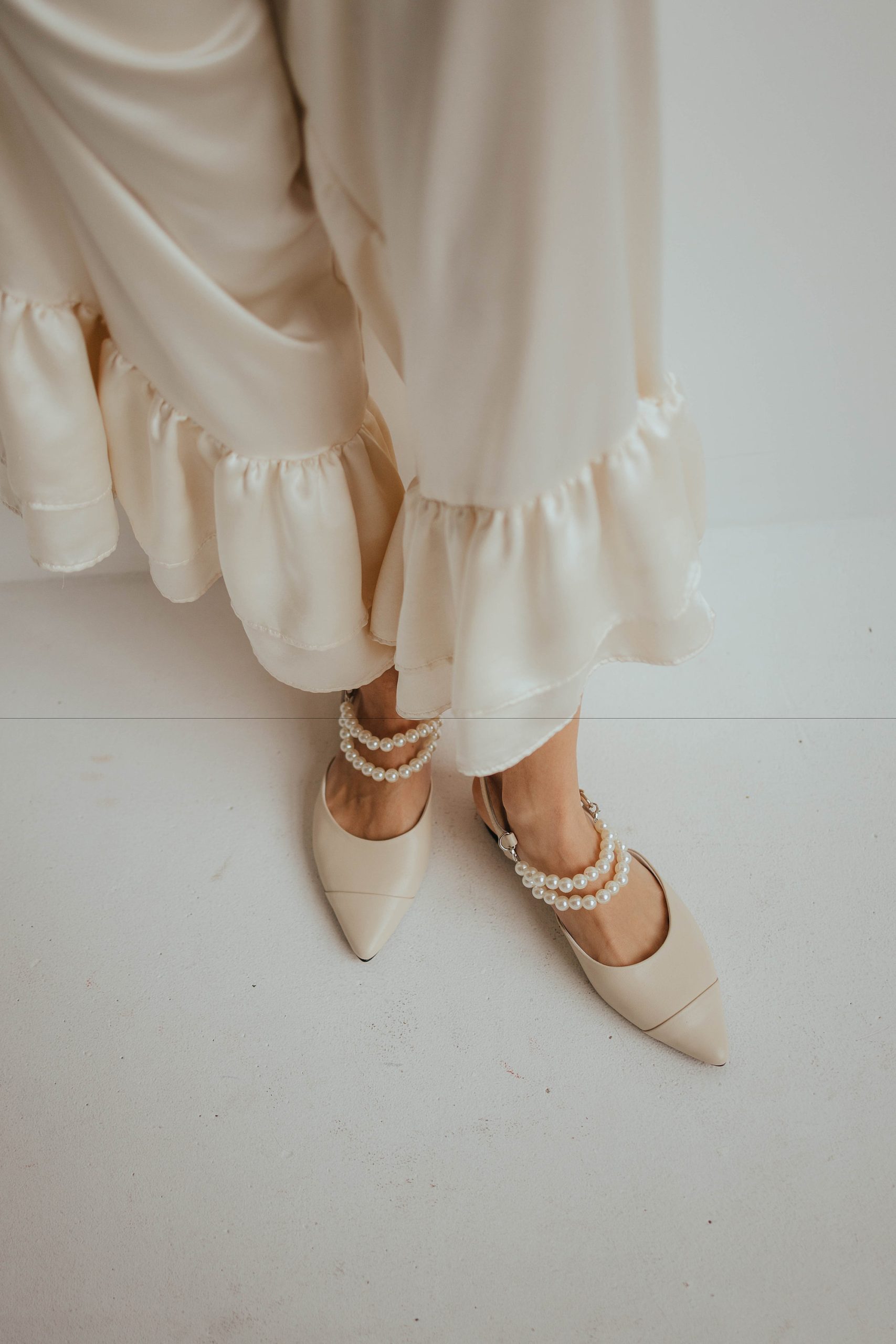 Double faux pearl ankle straps create a jewel-like feel (elasticated for easy on and off).