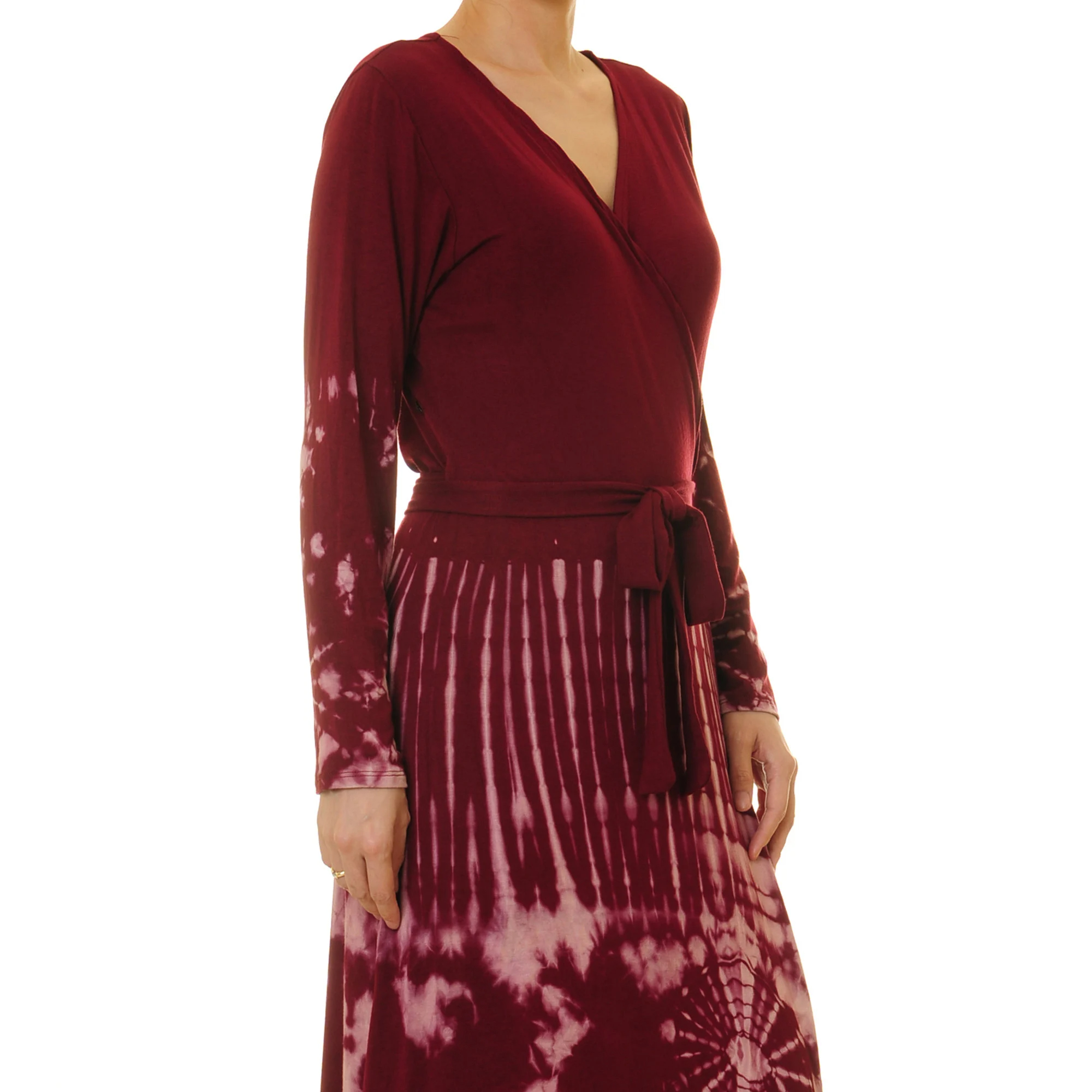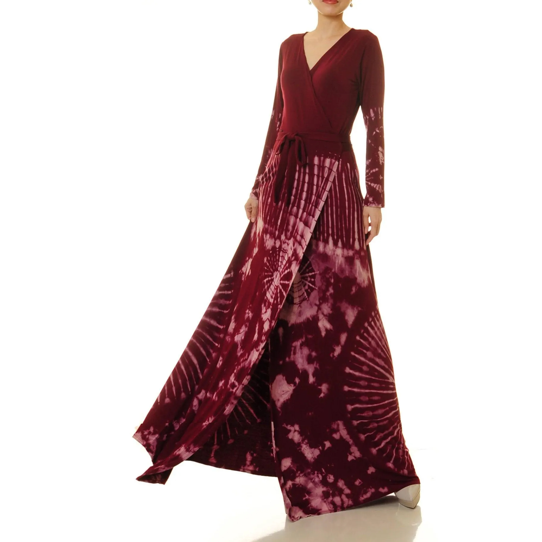 This maxi dress features a simple V-neck wrap silhouette, sculpting your figure, and a waist tie for an adjustable fit. The solid-colored bodice is a calm and neat statement, while the hem is embellished with a pomegranate red cloud dye, creating dynamic layers of radiant and sfumato-like color. A center front slit enhances mobility and a sense of lightness, while the long A-line hem creates a flowing curve with every step. Simply tie it on and it’s stylish, perfect for daytime outings or nighttime getaways.